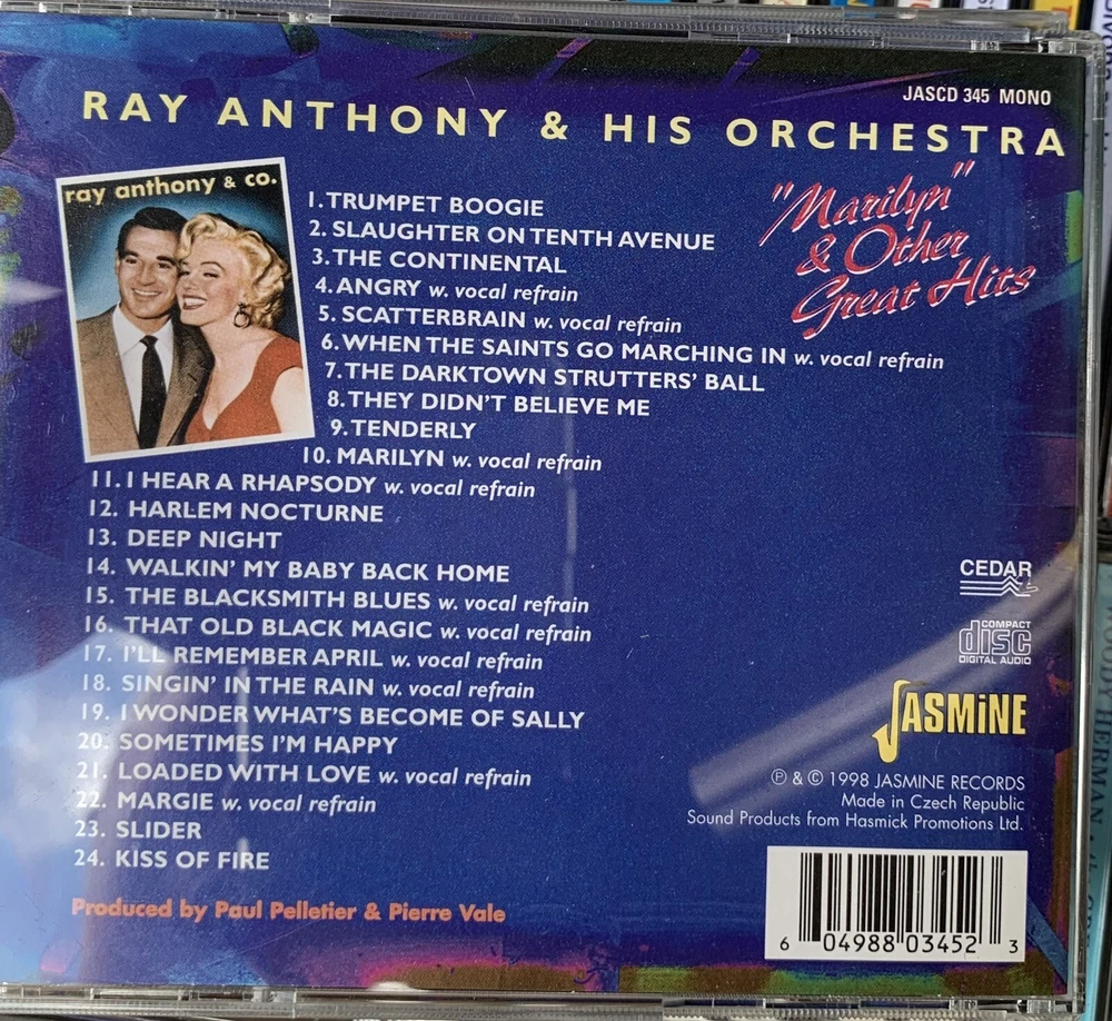 This CD features the great hits of Ray Anthony and his Orchestra, including the iconic title track "Marilyn". The album was released in 1998 by Jasmine Records and comes in a standard Jewel Case. It is a compilation of instrumental pop and jazz genres, with a run time of 3776 seconds. The CD has a number of discs of one and is in the format of an album. The record label is Jasmine Records, and the artist is Ray Anthony and his Orchestra. The CD is perfect for those who enjoy the classic sounds of jazz and instrumental pop. Box B