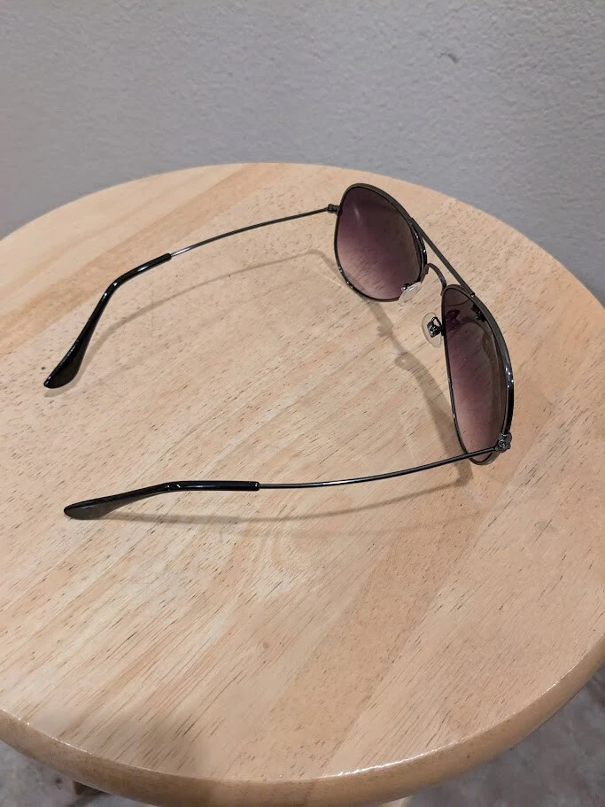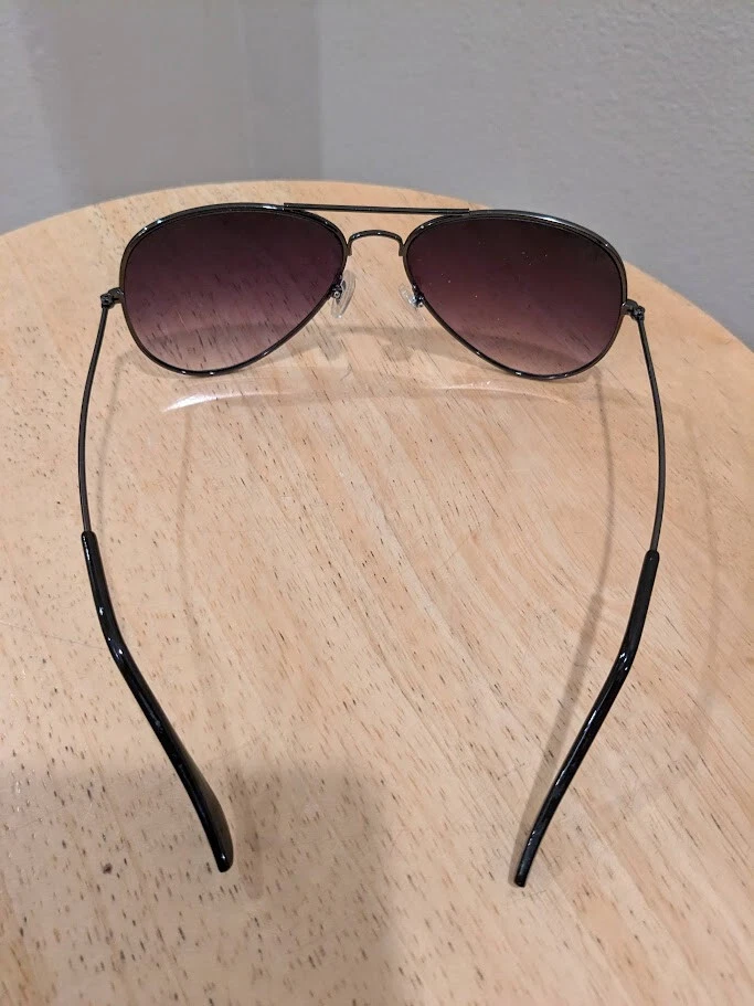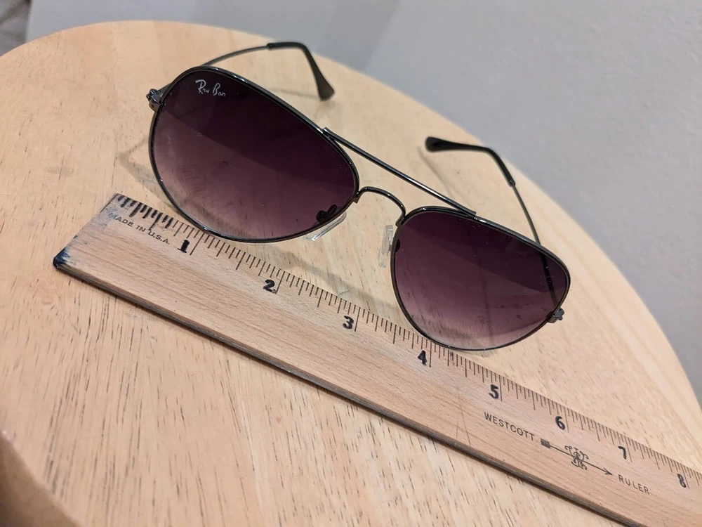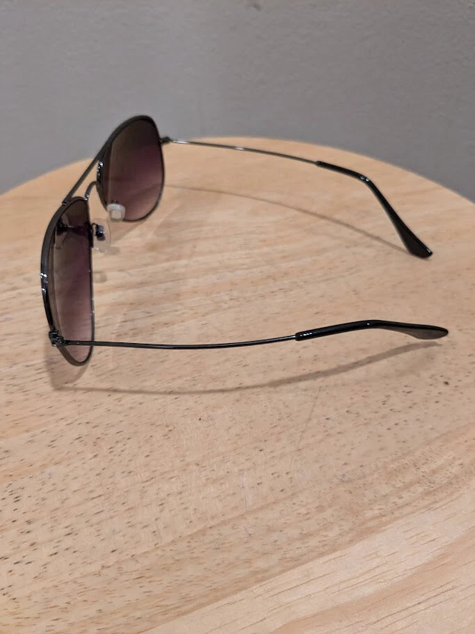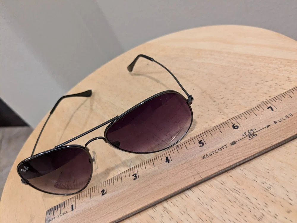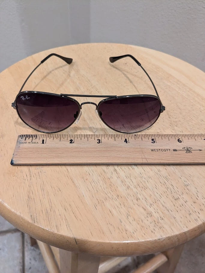 Unisex preowned Ray Ban sunglasses. Gradient tint. Gunmetal black frame. Previously worn with imperfections as shown in pictures. Worn areas as shown. Frame measures 5.31 inches or 135mm across, search Ray Ban for specifications. Marking on sunglass arms worn away - no details shown. Original case not included. Sold As-Is. Shipping in continental U.S. only.