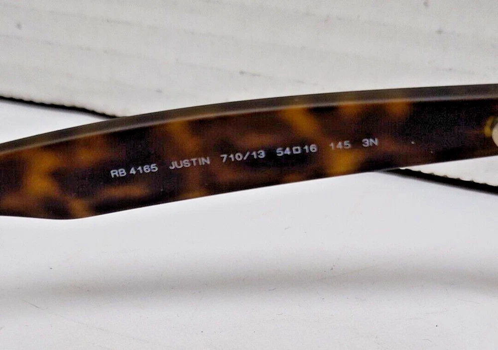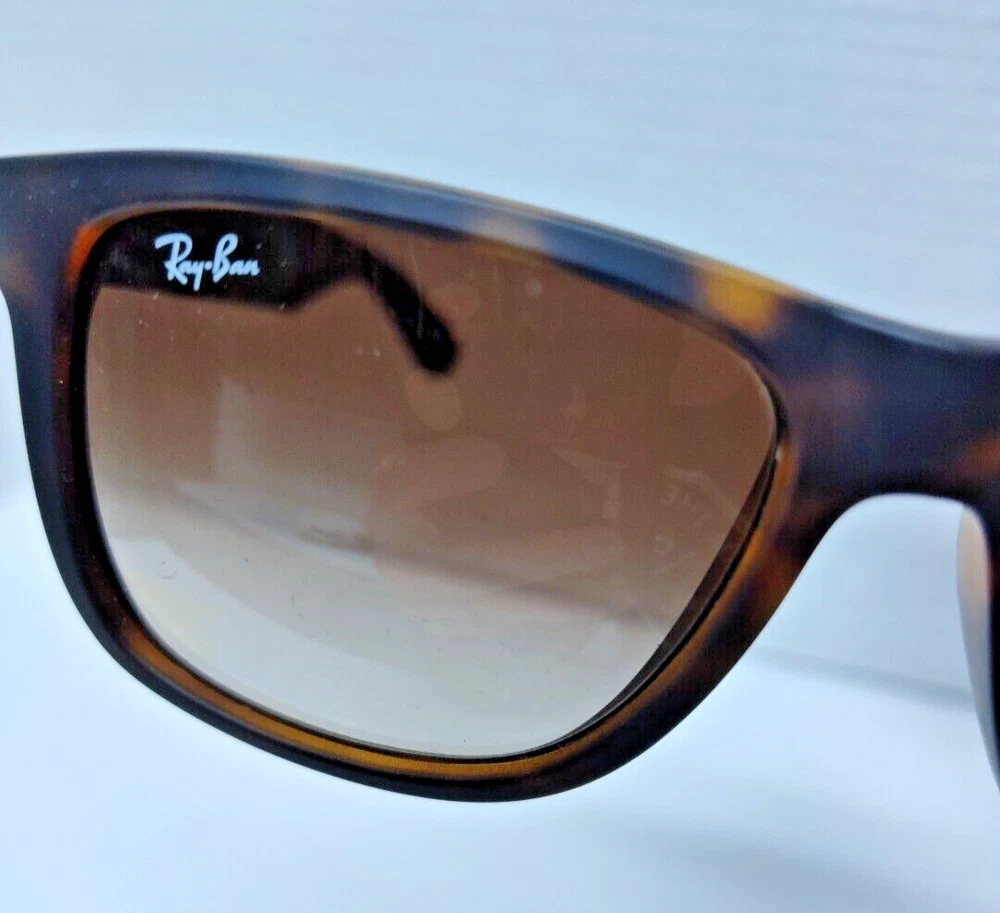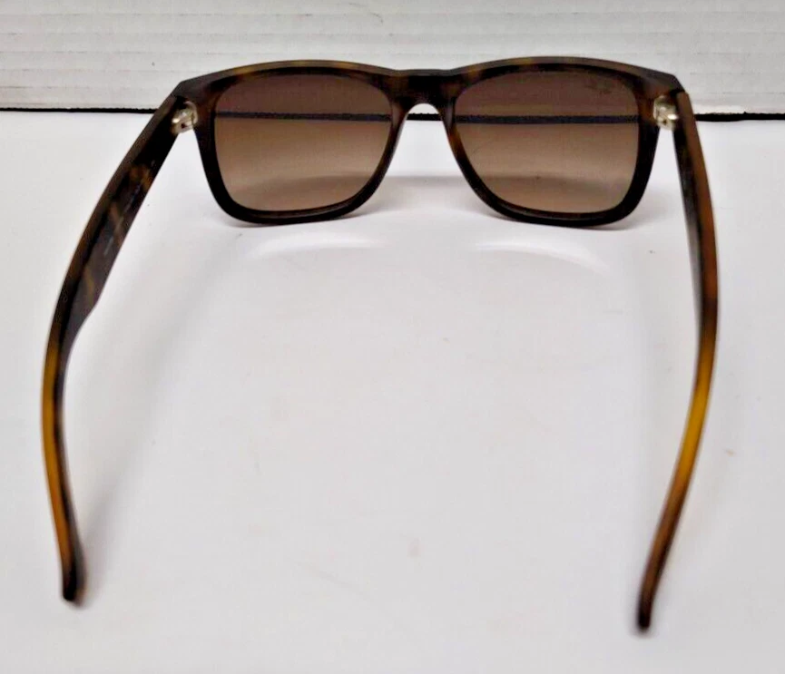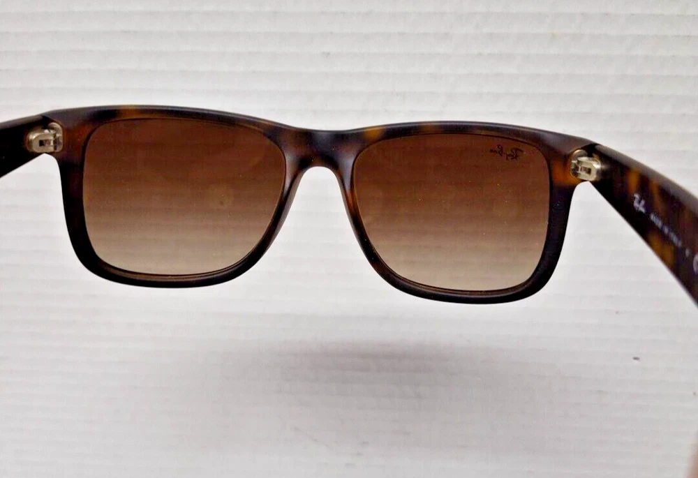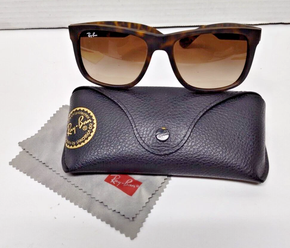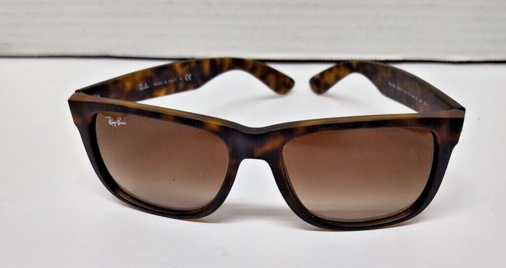 The product is a Ray-Ban Justin RB4165 sunglasses in Tortoise Shell frame color with Matte Brown Gradient lenses. The sunglasses have an acetate frame and plastic lenses with a tortoise theme. They come with a case and were manufactured in Italy. These sunglasses are designed for men and have a classic tortoise shell pattern, making them a stylish accessory for any outfit.