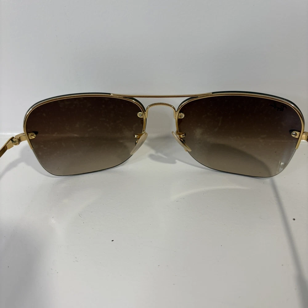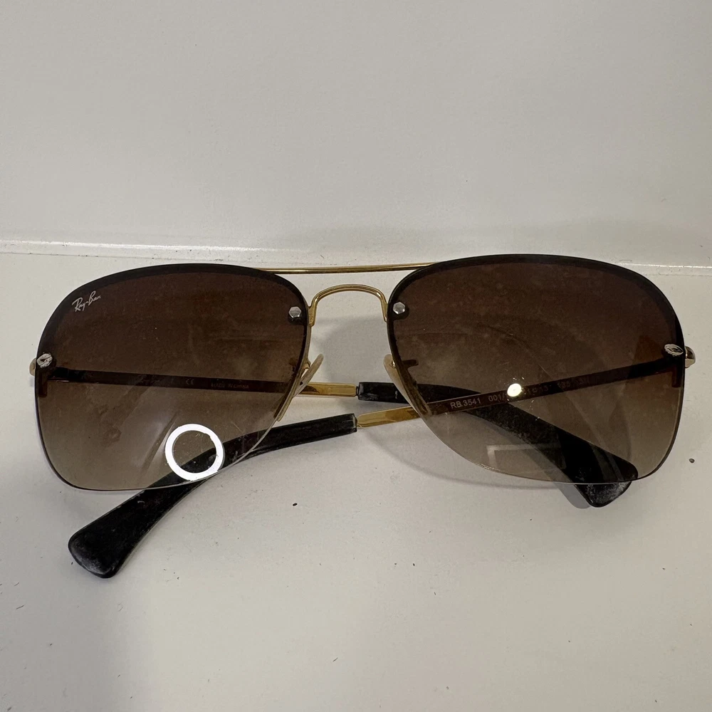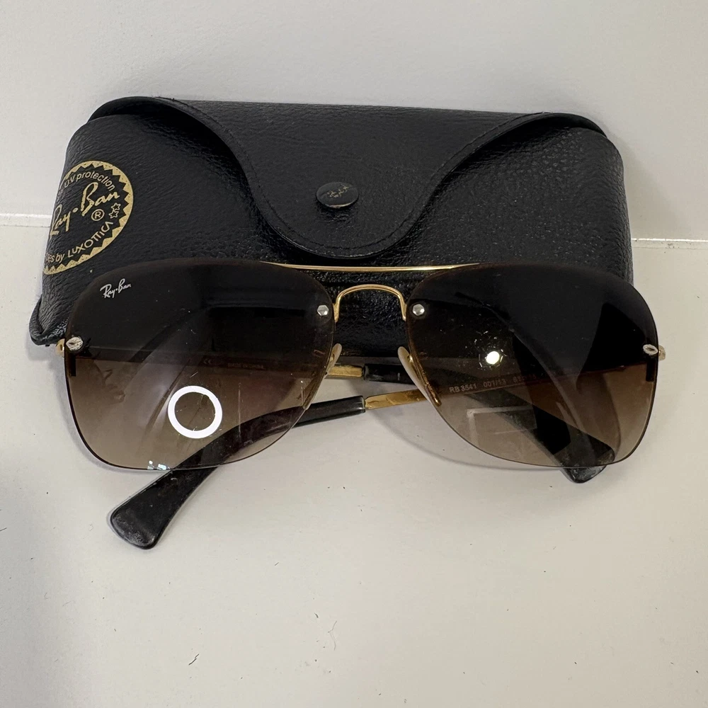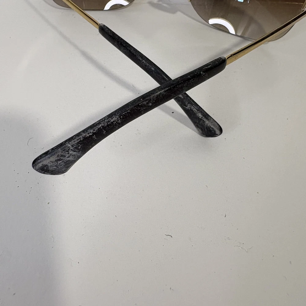 These are women's Ray-Ban aviator sunglasses with a gold frame and polarized black lenses. They come with a case for storage. Perfect for adding a stylish touch while protecting your eyes from the sun's glare. There is noticeable wear at the tip of the ear piece.