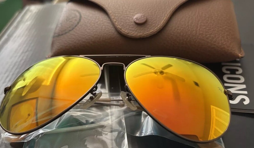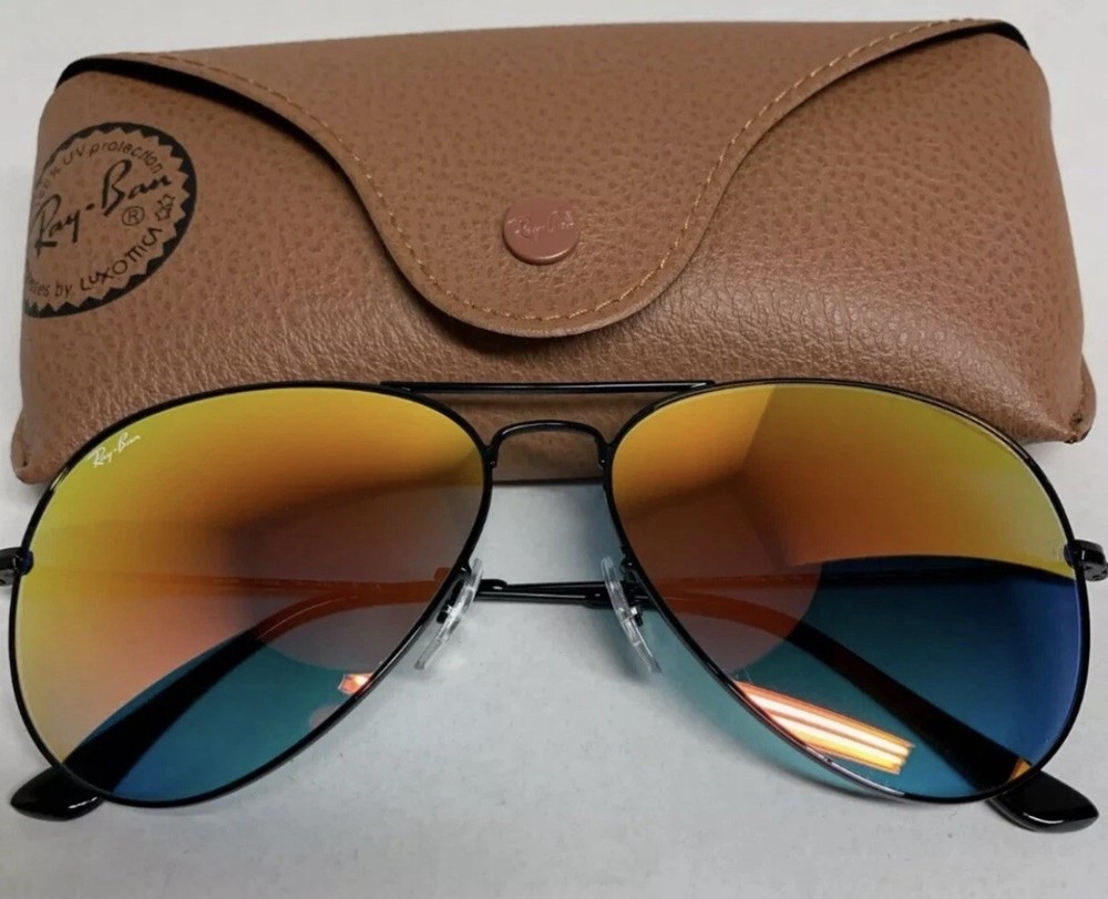 The Ray-Ban Aviator Sunglasses RB3026 feature a stylish bronze metal frame with red/orange flash mirrored glass lenses. With a lens width of 62mm and a temple length of 140mm, these unisex sunglasses offer a classic aviator style that is both modern and colorful. Made in Italy, these sunglasses are designed for outdoor activities and city wear, perfect for individuals looking to add a touch of designer flair to their look. The mirrored lenses provide a unique and trendy touch, making them a standout accessory for those who appreciate quality eyewear. These are both women and men.