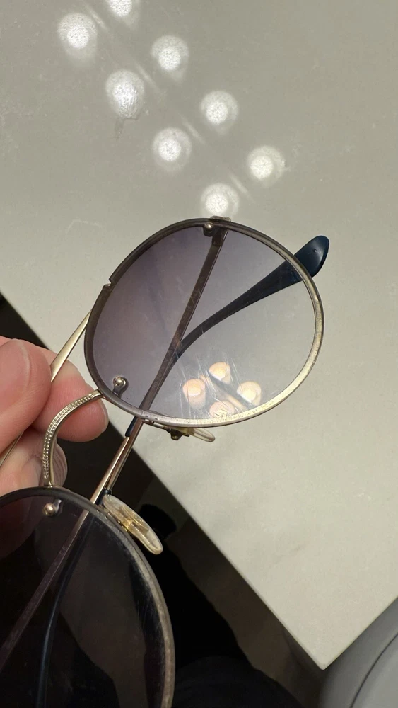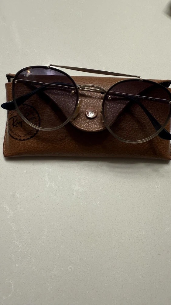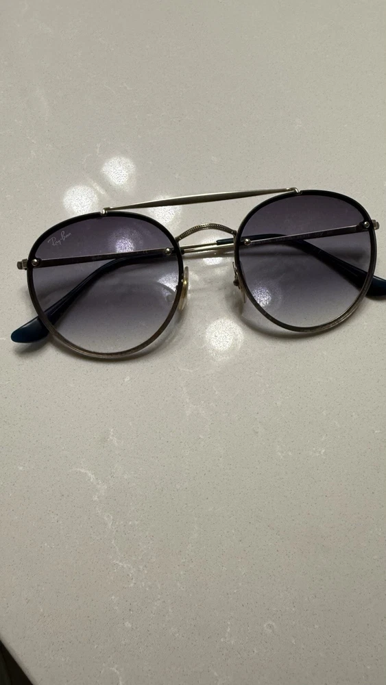 Ray-Ban Blaze Round Double Bridge Unisex Round Sunglasses - Gold Frames with Blue Gradient Mirror Lenses Frame color Gold Frame material Metal Frame shape Oval-Heart-Square Gtin1 8056597017886 Lens color Light Blue Gradient Mirror Lens material Polyamide Lens technology Cl007 - Clear Product size 18-54-145 The lenses have some small scratches but they are in very good shape. Case and lens wipe are included. Please reach out if you have any questions.