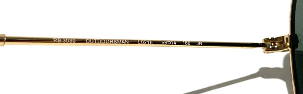 GUARANTEED 100% AUTHENTIC Product Details: Model code: RB3030 L0216 58-14 Currently one of the most iconic sunglass models in the world, Ray-Ban outdoorsman Classic were originally designed for U.S. aviators in 1937. Aviator Classic sunglasses are a timeless model that combines great styling with exceptional quality, performance and comfort. With a classic gold frame, you can see the world with optimum visual clarity and 100% UV protection. Frame material: Metal Frame color: Gold Lenses: Classic Green G-15 Shape: Pilot Size lens-bridge: 58 14 Temple Length: 160 Package includes: microfiber cloth, paperwork, Ray-Ban Sunglasses, case and outer box. Shipped with USPS First Class. thank you for shopping with us !!