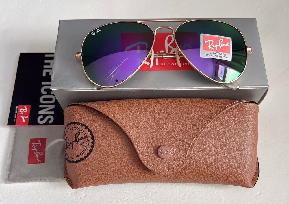 Department: Women Features: Oversized, Reflective Type: Sunglasses Frame Color: Gold Frame Material: Metal Model: Ray-Ban RB3025 Pattern: Solid Lens Technology: Mirrored Country/Region of Manufacture: Italy Lens Color: Purple Brand: Ray-Ban UV Protection: UV400 Style: Aviator MPN: RB3025 Personalized: No Theme: 80s, 90s, American, Band, Beach, Biker, Classic, Designer, Motorcycle, USA Temple Length: 135 mm Vintage: No Lens Material: Mirror