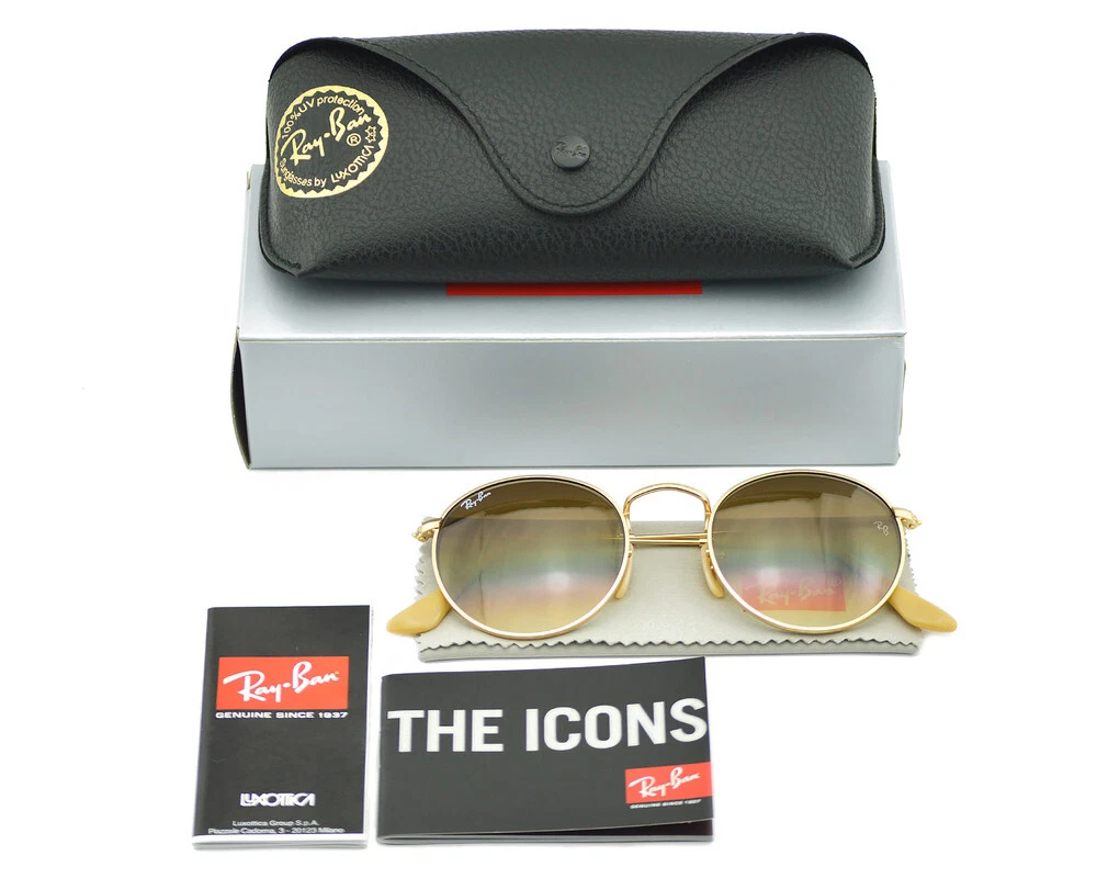 Ray-Ban Sunglasses RB3447 Round Metal Gold Frame Light Brown Lenses 50mm Unisex Model No.: RB3447 Color No.: 112/51 Size Lens-Bridge: 50 - 21 Temple Length: 145mm (Standard Size) Frame Material: Metal Frame Color : Matte Gold Lenses Color : Light Brown Gradient Lenses: Non Polarized Shape: Round Style: Round Metal UPC: 8053672405163 Experience ultimate eye protection and vision clarity with Ray-Ban sunglasses. Ray-Ban sunglasses are designed to meet your unique vision needs and are certified with an engraved Ray-Ban signature on the right lens, and the iconic RB initials on the left. Our lenses provide 100% UV protection that not only keep harmful glare and reflections at bay, but also protect your eyes from the sun rays. Trust Ray-Ban to provide superior eye protection and a style that truly reflects your personality. Package Includes: 1X Ray-Ban cleaning cloth 2X Ray-Ban booklet 1X Ray-Ban case 1X Ray-Ban box 1X Protect outer box 1X Mini Screwdriver Repair Tool (*In selected models only) G.W: 300g/Pair The product is shipped by USPS within 1-2 business days and arrives at destination after 2-8 business days