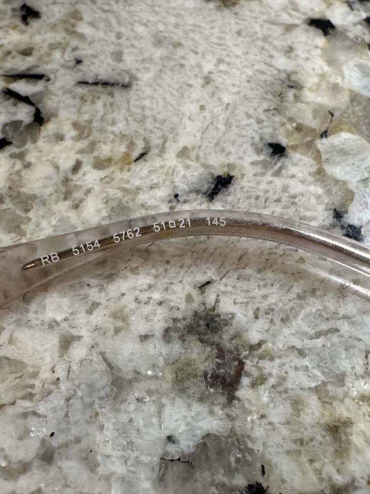 Frame Color: Polished Transparent Lens Socket Width: 51 mm gtin13: Does Not Apply Vintage: No UPC: Does Not Apply Pattern: Solid Seller Notes: “Good Condition.” MPN: RB5154 Country/Region of Manufacture: Unknown Brand: Ray-Ban Temple Length: 145 mm Model: Ray-Ban RB5154 5762 Style: Half Rim Bridge Width: 21 mm Frame Material: Acetate Department: Unisex Adults Personalized: No Type: Eyeglasses Theme: Modern Features: Half Frame, Square