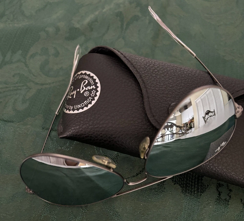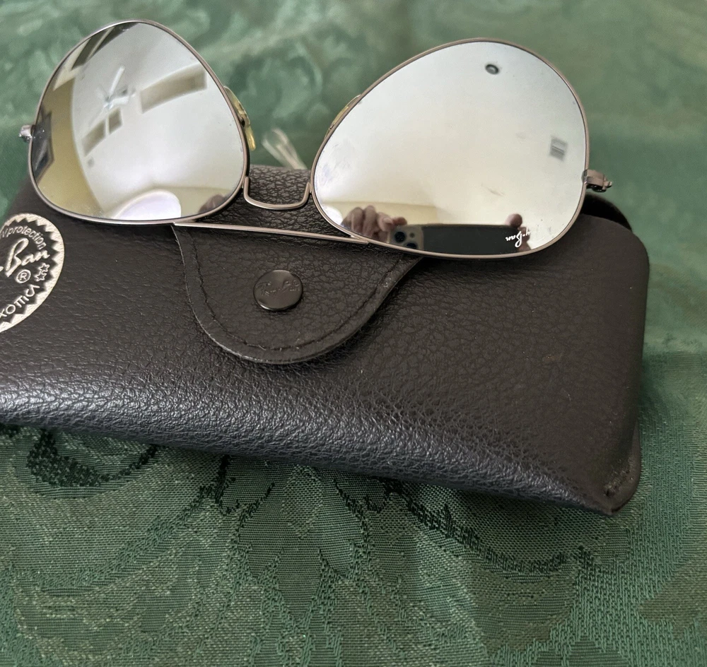 Men’s / women Ray Ban aviator Mirror Silver Sunglasses These were merely tried on at store. Purchased them in Lisbon at El Corte Ingles- for my son as a gift. He’s not a fan of mirrored glasses therefore never used them! They were never worn! Paid 163 euros--$168.00. Hard to photograph- I did it myself! Dust cloth included