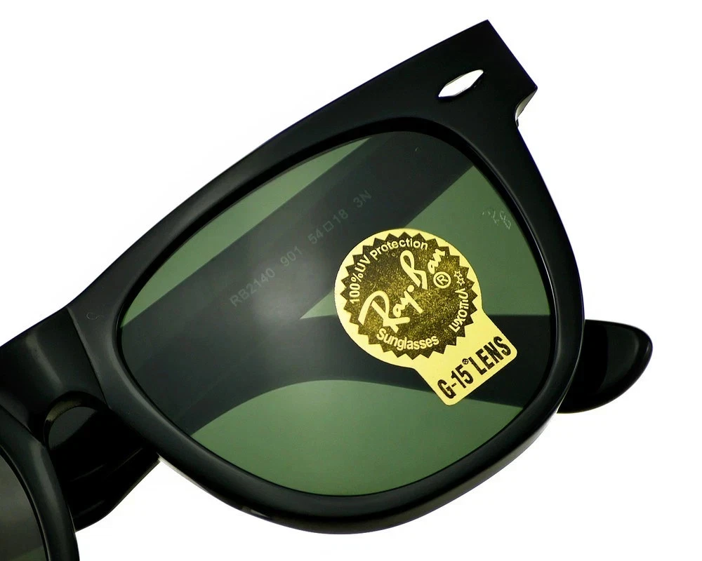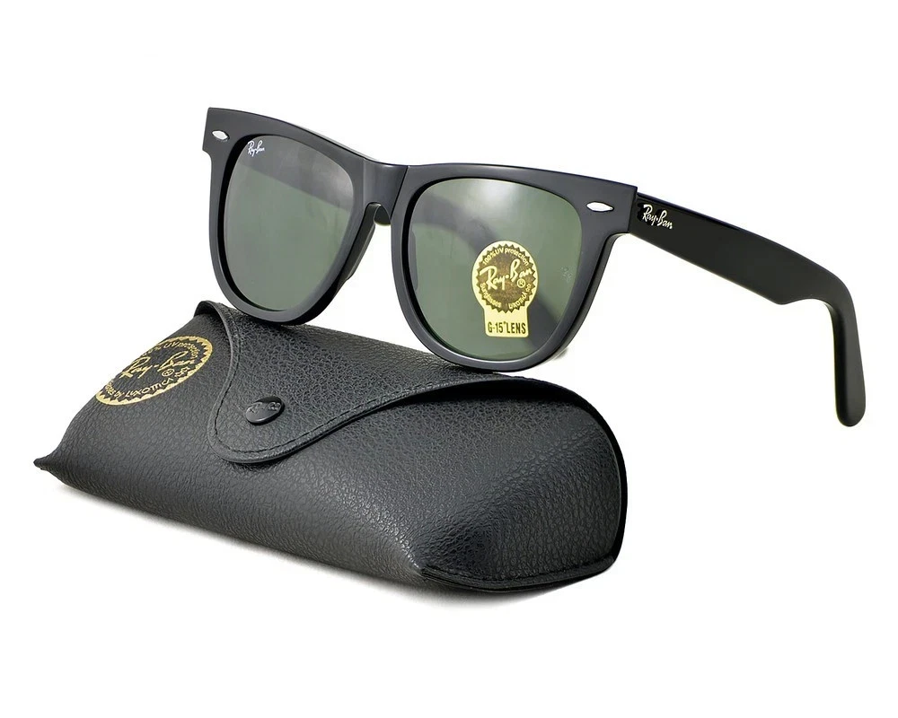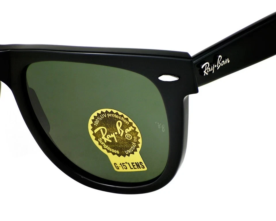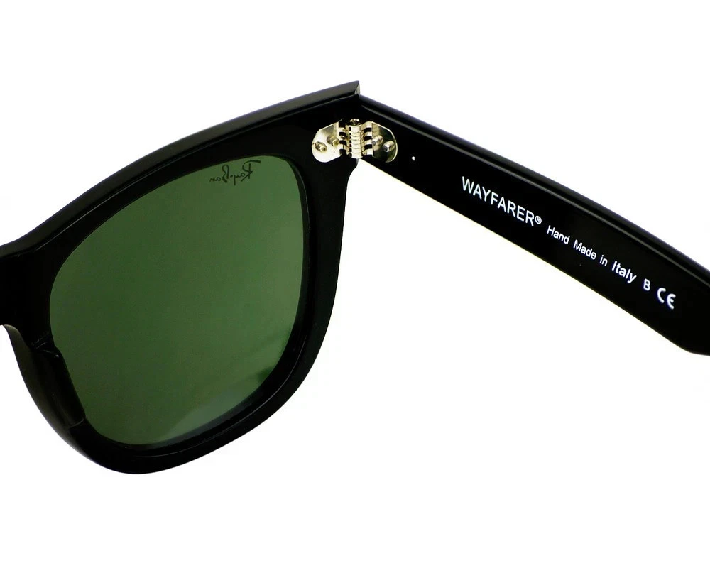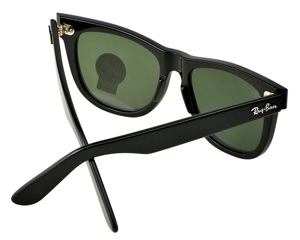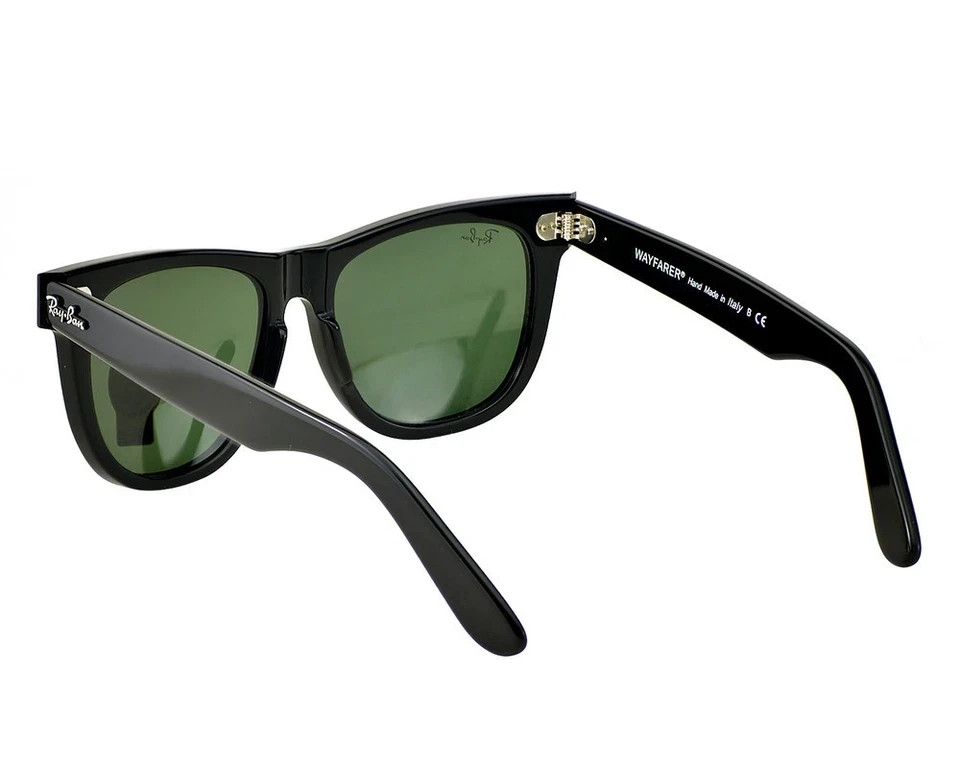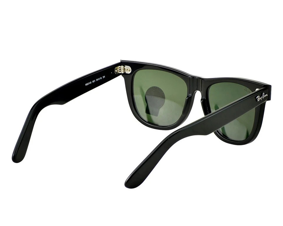 The Ray-Ban Sunglasses RB2140 Original Wayfarer in black with green lenses offer timeless style and UV protection for both men and women. Made in Italy with a square frame design and durable plastic material, these classic sunglasses feature glass lenses and a temple length. Perfect for adding a touch of sophistication to any outfit, these iconic Ray-Ban sunglasses are a must-have accessory for those looking to elevate their style with a touch of vintage flair.