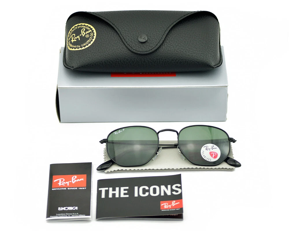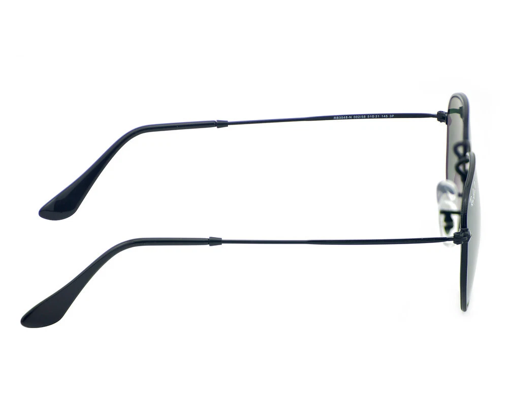 Ray-Ban Sunglasses RB3548N Hexagonal Flat Black Frame Green Classic Lens 51mm Model No.: RB3548N Color No.: 002/58 Size Lens-Bridge: 51 - 21 Temple Length: 145mm (Standard Size) Frame Material: Metal Frame Color: Polished Black Lens Color: Green Classic G15 Lenses: Polarized Shape: Hexagonal Style: Hexagonal Flat Lenses UPC: 8053672743852 Experience ultimate eye protection and vision clarity with Ray-Ban sunglasses. Ray-Ban sunglasses are designed to meet your unique vision needs and are certified with an engraved Ray-Ban signature on the right lens, and the iconic RB initials on the left. Our lenses provide 100% UV protection that not only keep harmful glare and reflections at bay, but also protect your eyes from the sun rays. Trust Ray-Ban to provide superior eye protection and a style that truly reflects your personality. Package Includes: 1X Ray-Ban cleaning cloth 2X Ray-Ban booklet 1X Ray-Ban case 1X Ray-Ban box 1X Protect outer box 1X Mini Screwdriver Repair Tool (*In selected models only) G.W: 300g/Pair The product is shipped by USPS within 1-2 business days and arrives at destination after 2-8 business days