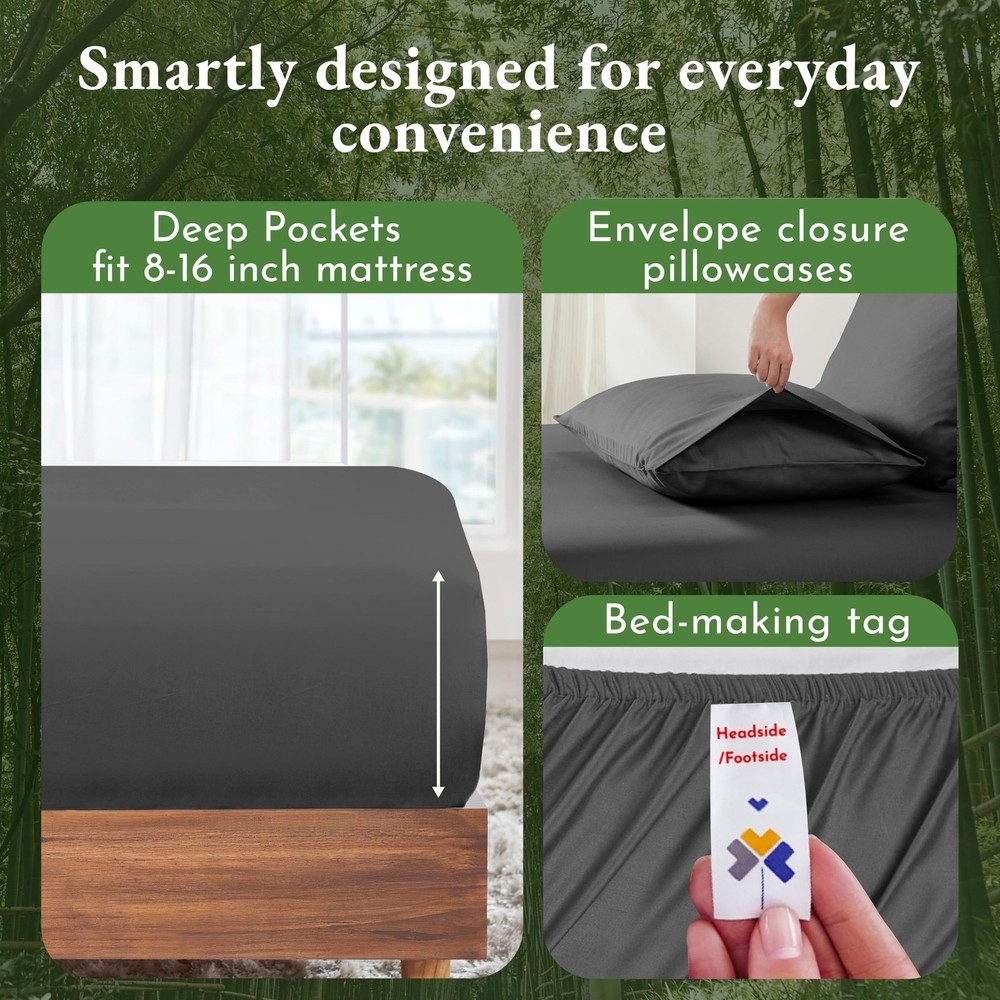 Experience unparalleled comfort with our 100% rayon from bamboo sheets. Designed for ultimate luxury, these sheets offer a silky, breathable feel that ensures comfort year-round. The rayon fabric is light and airy, effectively wicking away moisture and sweat for a restful sleep. Ideal for sensitive skin, it provides a cooler sleep experience and retains moisture to keep your skin soft and supple. The fitted sheet features all-around elastic for a perfect fit and includes a head/foot side indicator for easy bed-making. Machine washable, these sheets remain soft and smooth even after multiple washes, without shrinking, fading, or wrinkling. Enjoy the blend of elegance and practicality with these premium sheets. Cool Comfort for Restful Sleep: Experience our luxuriously soft and silky 100% rayon from bamboo sheets queen. This grey queen sheet set deep pocket regulates temperature and wicks away moisture, keeping you cool and comfortable year round, with the luxurious feel of real queen silk sheets but without the luxury markup. Perfect Fit: Our 4 piece queen size bed sheets set includes a flat sheet (90"W x 102" L), a fitted sheet (60"W x 80" L), and 2 standard/queen pillowcases (20" W x 30" L). The fitted sheet features deep pockets and an all around premium elastic for a snug fit on mattresses up to 16 inches deep. A smart head side/ foot side tag ensures effortless, perfectly made beds every time. Durable & Easy to Care: This rayon from bamboo queen sheet set is crafted to withstand shrinkage, fading, and pilling. It maintains its luxurious softness and smooth drape even after countless washes. These sheets are easy to care for. Toss them in the washer and dryer, and enjoy the feeling of freshly laundered luxury every day. Certified Safe Premium Quality: Made from the finest 100% Rayon derived from Bamboo, our sheets are Oeko Tex certified and free from harmful substances. Rest easy knowing your bedding is safe, sustainable, and gentle on your skin. Sustainable Comfort: Crafted with care, our sheets embody the perfect blend of luxury and responsibility. We’ve donated over 22,000 bedding pieces to local US charities and package our products sustainably without plastic. Experience exceptional support from our dedicated customer care team with every purchase.