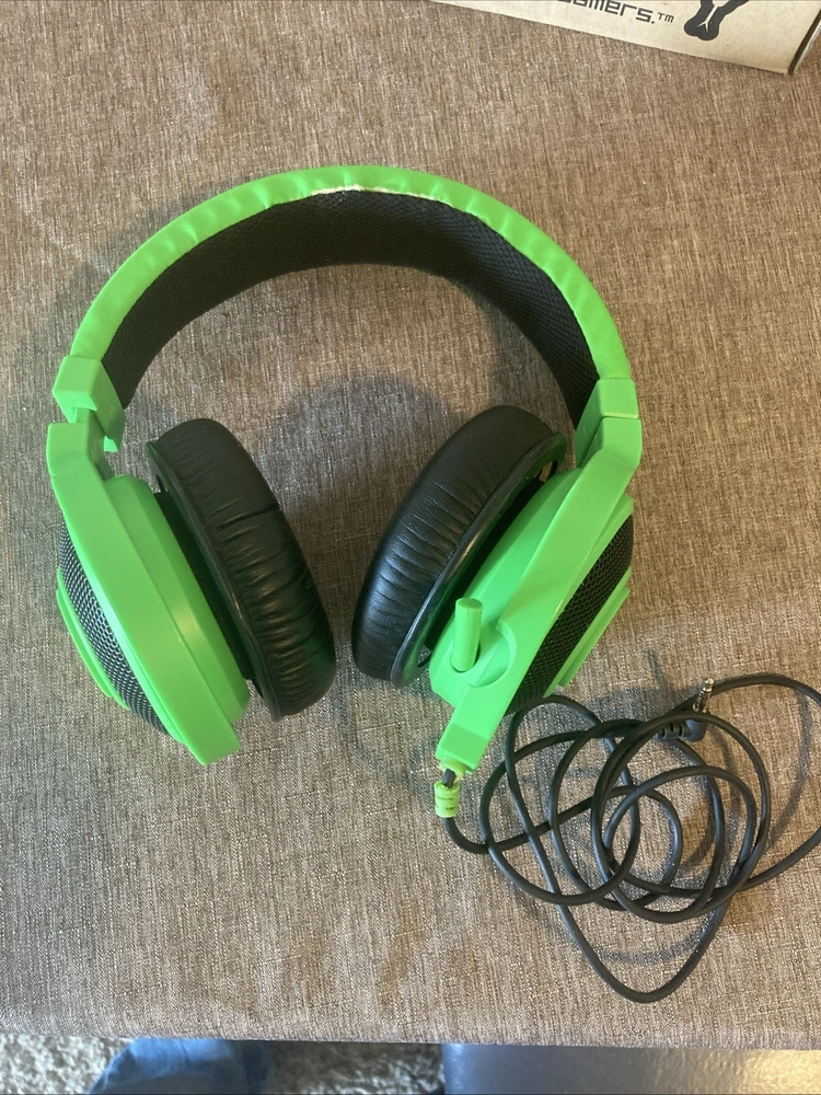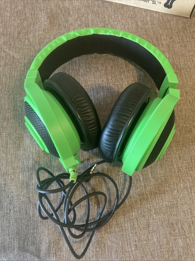 The Razer Kraken Gaming Headset in green offers a comfortable and immersive gaming experience with its over-the-ear design and noise cancellation feature. The headset includes a built-in microphone, volume control, and mute button for easy customization during gameplay. Compatible with PC, Xbox, PS4, and Nintendo Switch, this headset provides a wired connection for stable audio transmission. With its sleek headband form factor and double earpieces, the Razer Kraken headset is designed specifically for gaming enthusiasts looking for high-quality sound and convenience. ***PRE - OWNED*** Some very minor cosmetic scuff marks and wear headphones an on exterior of box. Overall in great working condition! ( SEE PICS ) VOLUME DISCOUNTS APPLIED CHECK OUT OUR OTHER LISTINGS FOR SIMILAR PRODUCTS LIKE THIS !
