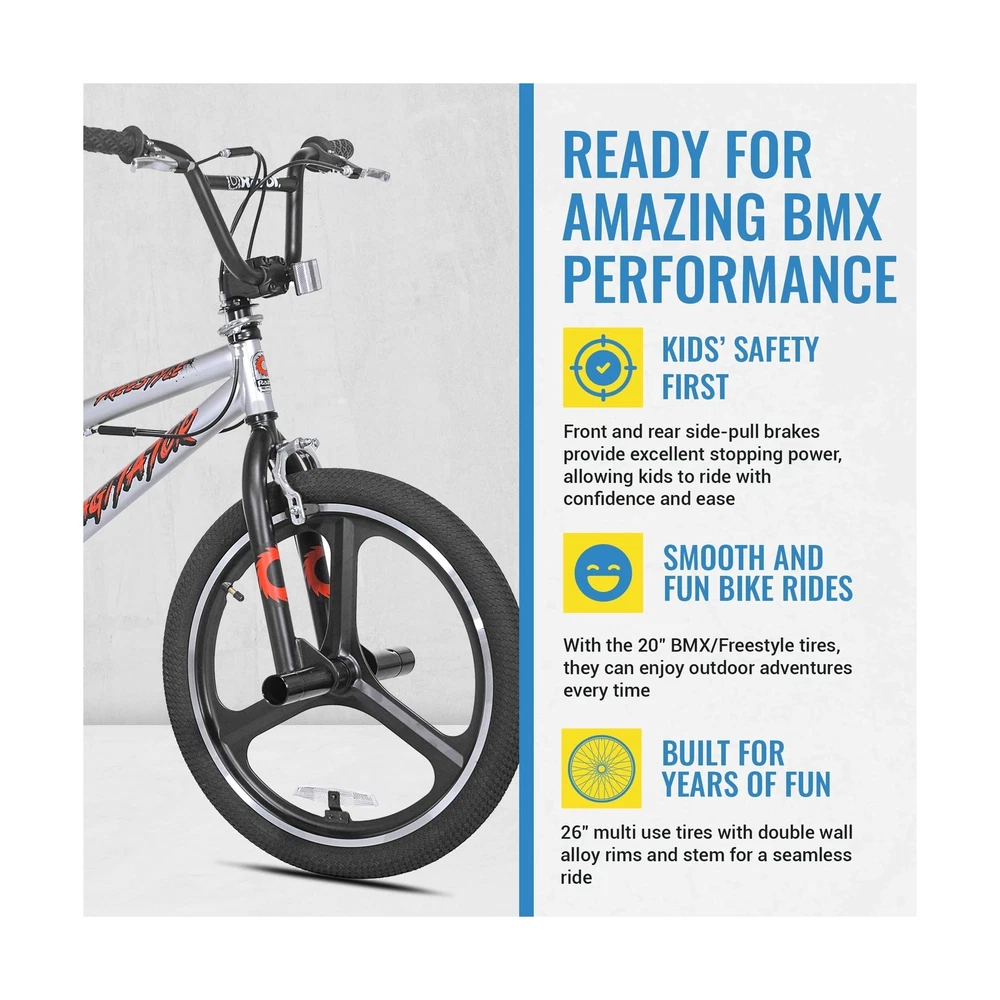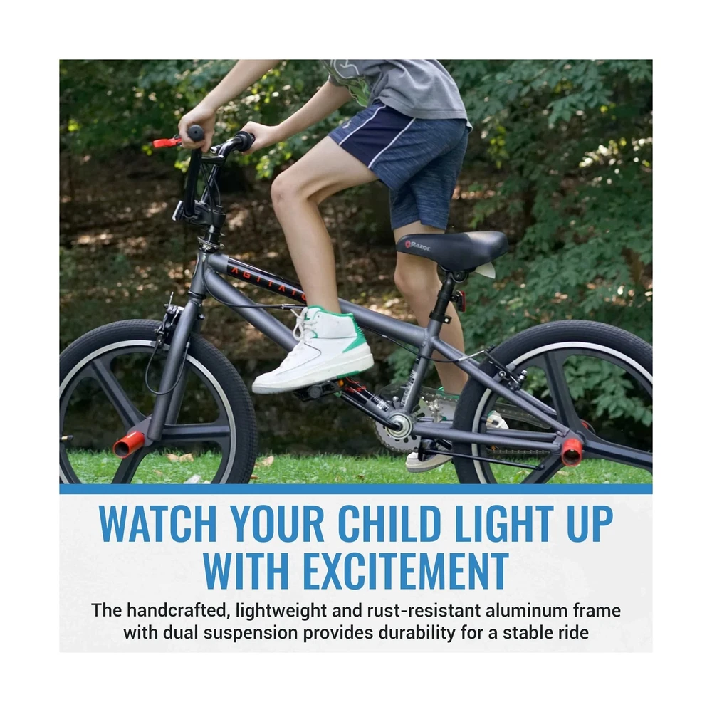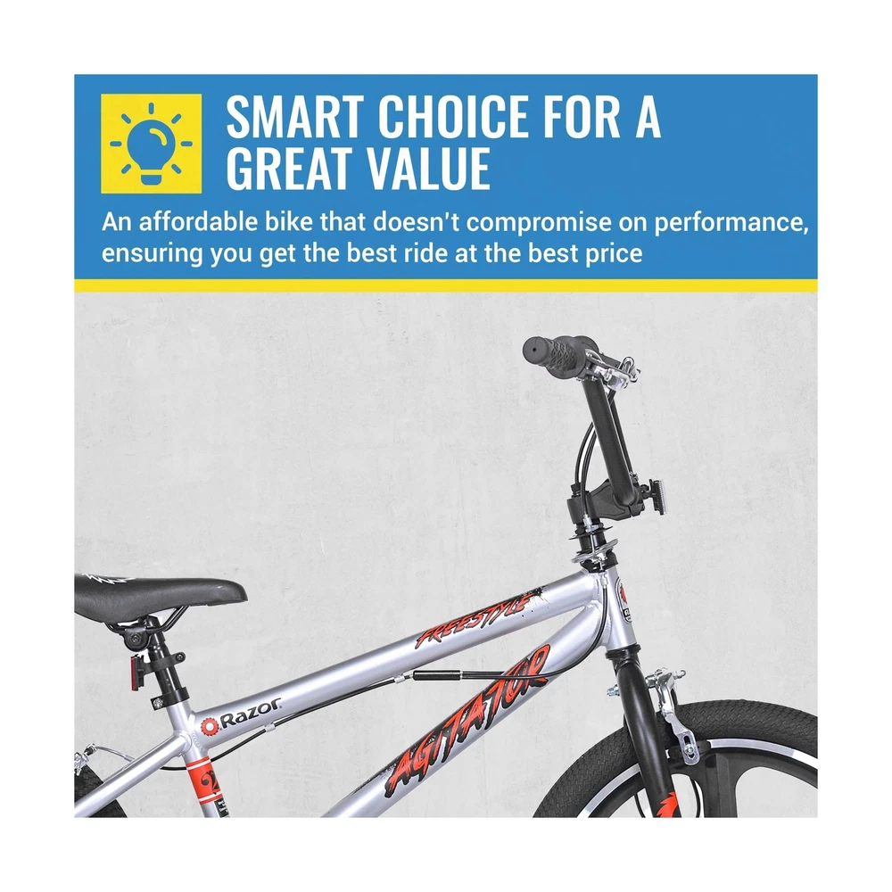 Razor Agitator BMX/Freestyle Bike - 20 Inch Bike for Boys - Quick Release Adjustable Seat Post - BMX Bicycle with Front and Rear Brakes, Steel Frame and Fork, and Front and Rear Pegs Description The Razor Agitator BMX/Freestyle Bike is perfect for young riders looking for a fun and stylish ride. With its sleek design and vibrant color, this bike is sure to impress in any park or neighborhood. The front and rear hand brakes provide excellent stopping power, while the 20-inch BMX/Freestyle tires and lightweight alloy mag wheels ensure a smooth and safe ride. Designed for comfort, the Razor Agitator features a quick-release adjustable seat post, adjustable handlebar, and padded saddle, offering a perfect fit for your child’s adventures. Built with a tig-welded steel frame and a hi-tensile steel fork, this durable 20 inch boy’s bike is made to handle the excitement of BMX and freestyle riding for years of fun. Features: Sleek and Cool BMX Bike for Kids: Featuring a sleek design with vibrant colors and cool front and rear pegs kids love, the Razor Agitator is a showstopper for BMX and freestyle fun. Simple yet stylish, watch your child smile ear to ear as they ride! Custom Comfort: This 20 inch BMX bike features a quick-release adjustable seat post, adjustable handlebar, and a padded saddle, ensuring the perfect height and comfort for your childs ridewhether practicing tricks or cruising the neighborhood. Ride with Confidence: Ensure your child's safety with front and rear hand brakes providing excellent stopping power, while the 20-inch BMX/Freestyle tires and lightweight alloy mag wheels ensure a smooth ride and enhanced braking efficiency. Safe and Sturdy: Sporting a tig-welded steel frame and hi-tensile steel fork with neon red accents, the Razor Agitator is designed to withstand rigorous use and tricks for years of fun in the park or neighborhood. Trusted Brand: Razor, the most trusted name in scooters since 2000, brings you this amazing kids bike! We design our products to grow with your kids, encouraging the whole family to step away from screens, get outdoors, and bond in new ways. Product Details: Bike Type: Multi-Use Bike, BMX Bike Age Range (Description): Kids Brand: Razor Number of Speeds: 1 Color: Silver Wheel Size: 20 Inches Frame Material: Alloy Steel Suspension Type: Rear, Front Special Feature: freestyle Included Components: Kickstand, Owner's Manual CPSC Reflectors Bike Type: Multi-Use Bike, BMX Bike Age Range (Description): Kids Brand: Razor Number of Speeds: 1 Color: Silver Wheel Size: 20 Inches Frame Material: Alloy Steel Suspension Type: Rear, Front Special Feature: freestyle Included Components: Kickstand, Owner's Manual CPSC Reflectors Size: 20 inch Brake Style: Linear Pull, Caliper Specific Uses For Product: Road Item Weight: 37.5 Pounds Theme: Freestyle Bmx Style: Freestyle Bmx Model Name: Razor agitator bmx freestyle bike Power Source: Pedal power Wheel Material: Aluminum Year: 2019 Seat Material Type: Durable synthetic leather or rubber Maximum Weight Recommendation: 250 Pounds Assembly Required: Yes Number of Handles: 2 Skill Level: Intermediate Global Trade Identification Number: 62 UPC: 016751920962 Manufacturer: Kent International Inc. Item Package Dimensions L x W x H: 45 x 23 x 8 inches Package Weight: 17.17 Kilograms Item Dimensions LxWxH: 50 x 25 x 35 inches Brand Name: Razor Warranty Description: 1 year Parts, Limited Lifetime on Frame Material: Steel Suggested Users: unisex-teen Number of Items: 1 Part Number: 92096 Date First Available: June 19, 2019 Delivery We Do Not Ship Outside of the Continental US. Return Policy All items qualify for returns within 30 days of receipt. Buyer is responsible for return shipping on any item that is not damaged. Feedback We take our reputation seriously, we buy and sell online, so we understand the value of trust. If you are unsatisfied with your order, please contact us and we will work with you to resolve it to your satisfaction.