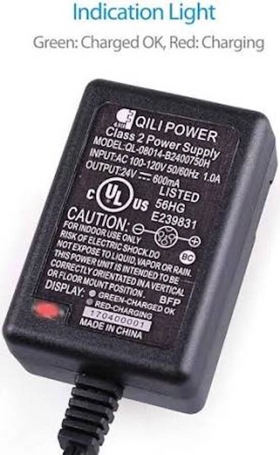 This charger has an output of 24 volts and 600mA and is suitable for charging electric scooters. Qili Brand, Power Class 2 power supply charger designed for Razor electric scooters. It is black. Model number of QL-09002B-B2400600H. UL Listed Class 2 Power Unit UL APPROVED Short circuit and over voltage protection. This charger is certified to UL standard: UL 1310.