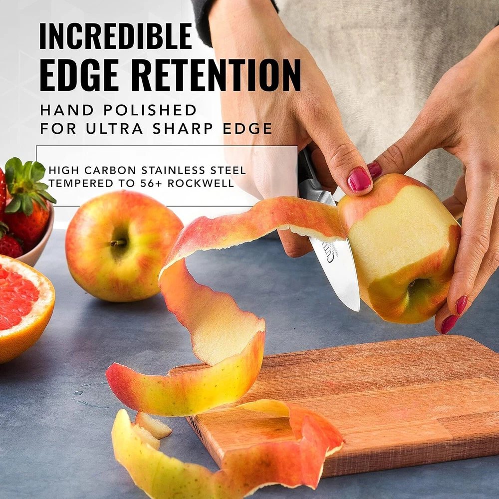 PROFESSIONAL KNIFE SETS FOR CHEFS: Elevate your culinary skills with this 5 piece knife set of 8" Chef Knife, 7" Santoku Knife, 5.5" Kitchen Utility Knife, 9” Carving Knife and 3.5” Paring Knife. Ideal for chefs and home cooks alike! RAZOR-SHARP BLADE EDGE: Experience precision cutting with our kitchen knife sets razor-sharp blade edge, ensuring every slice is perfect. PERFECT GIFT: This 5 piece knife set makes for an ideal gift for weddings, housewarmings, holidays and anyone passionate about culinary arts. FULL TANG ERGONOMIC DESIGN: Designed for comfort and control, our culinary knife set features a full tang ergonomic design that fits perfectly in your hand, reducing fatigue during use. Blade Material High Carbon Stainless Steel Color Silver Handle Material Pakkawood Blade Edge Plain Blade Length 8 Inches Construction Type Forged Blade Color Silver Is Dishwasher Safe No Item Length 37.26 Centimeters Size 5 PCs Knife Set UPC 855532008617 Item Weight 4.27 pounds On Feb 7, 2025 at 07:48:36 PST, seller added the following information: