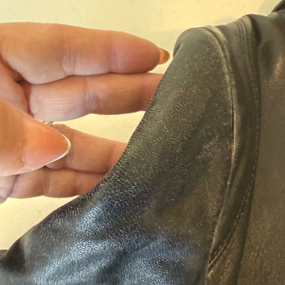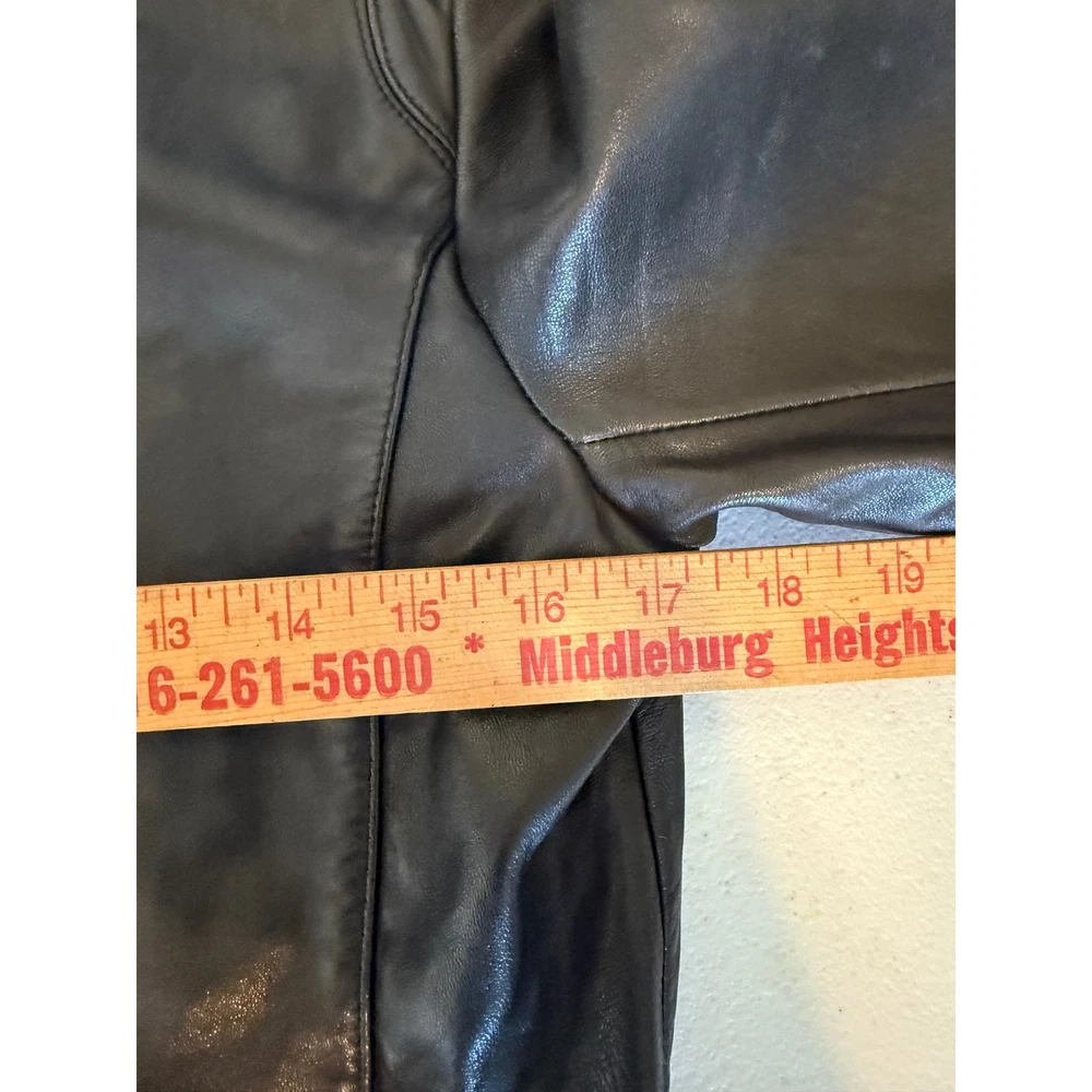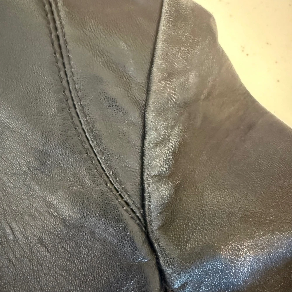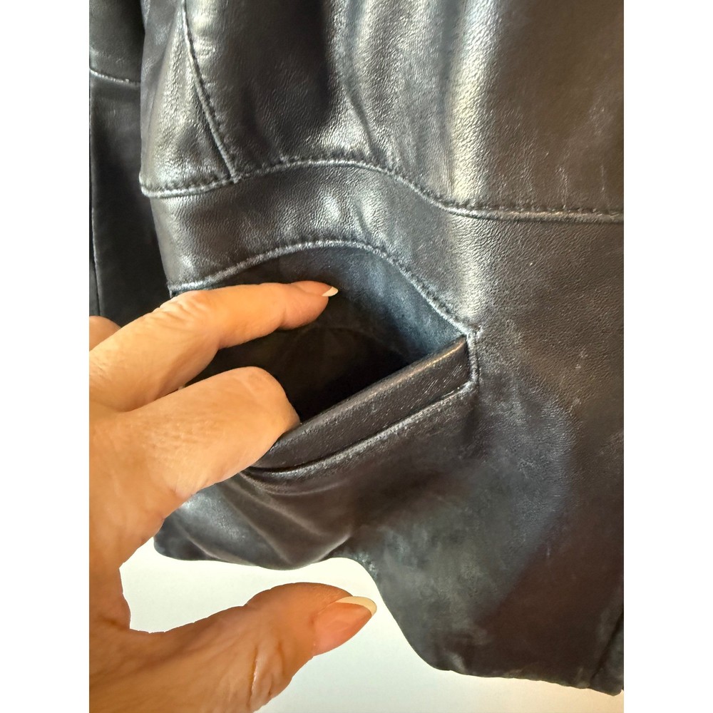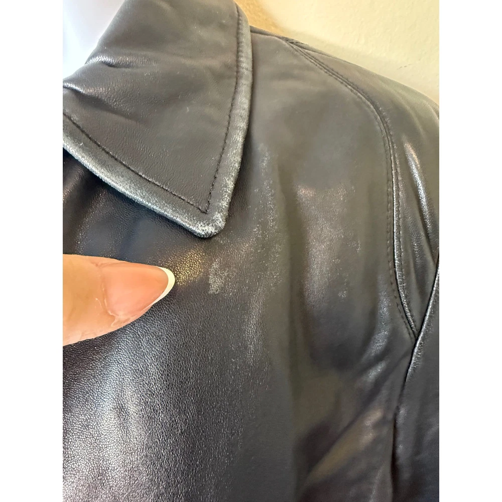 ** see pictures of general wear in areas***Command attention with this Reaction Kenneth Cole leather jacket. Luxurious and undeniably chic, this jacket features a classic collared design that exudes timeless sophistication. The smooth, full zip closure allows for effortless layering, while the tailored silhouette enhances your figure. Its sleek black finish is versatile enough to complement any outfit, seamlessly transitioning from day to night. Imagine yourself confidently navigating a bustling city street, or adding an edgy touch to a sophisticated evening ensemble. Perfect for a stylish coffee run or a casual Friday at the office, this jacket is a must-have for the modern woman. Type: Jacket Outer Shell Material: Leather Style: Basic Jacket Department: Women Color: Black Lining Material: Polyester Features: Full Zip, Pockets, Collared Accents: Zipper Pattern: Solid Jacket/Coat Length: Short Insulation Material: Synthetic Season: Fall, Spring Closure: Zip Occasion: Casual Keywords: Reaction Kenneth Cole leather jacket, womens leather jacket, black leather jacket, zip up leather jacket, collared jacket, small leather jacket, designer jacket, classic leather jacket, outerwear, fashion jacket, leather coat,