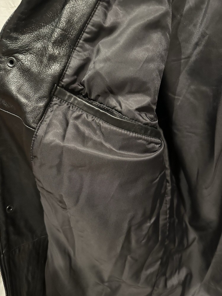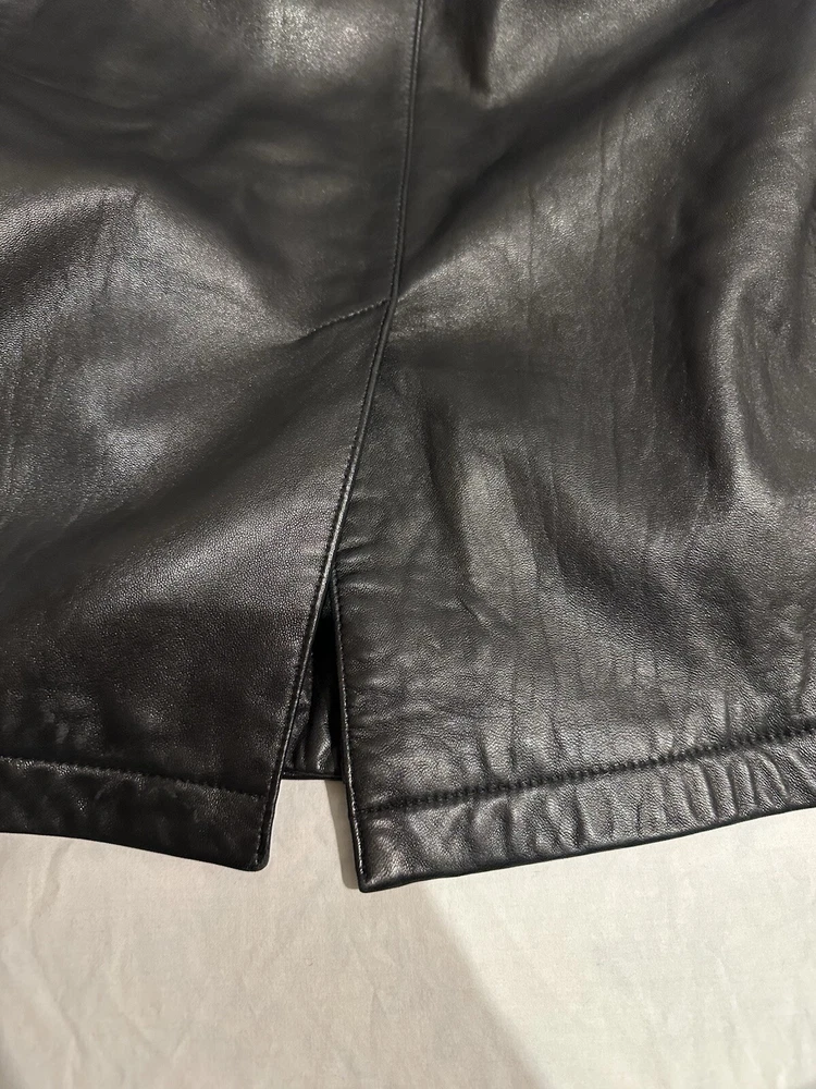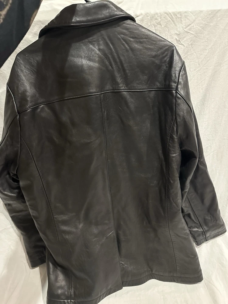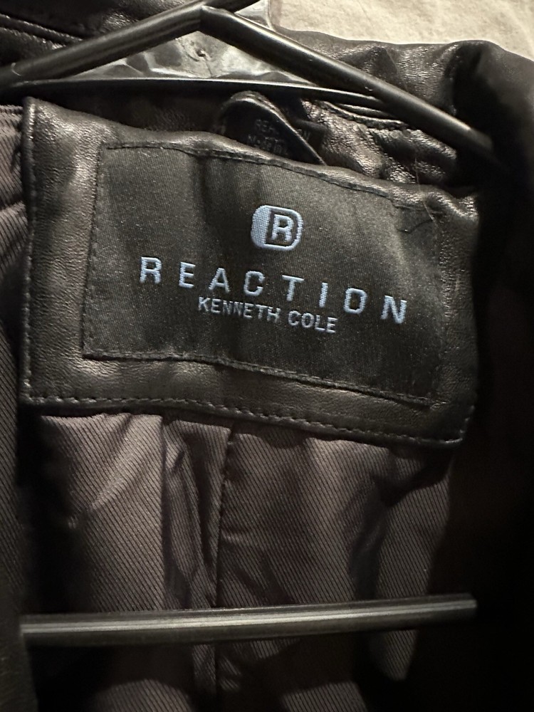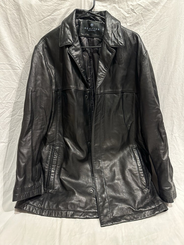 A stylish and versatile women's black leather jacket from Kenneth Cole in size L. Suitable for men or women. This mid length- long jacket features a full zip closure, long sleeves, and is lined with polyester for warmth. It is made of real genuine leather, has a classic solid pattern and a back slit. Ideal for travel or casual wear during fall and winter seasons, this jacket also includes pockets, including a hidden inside pocket, for convenience.