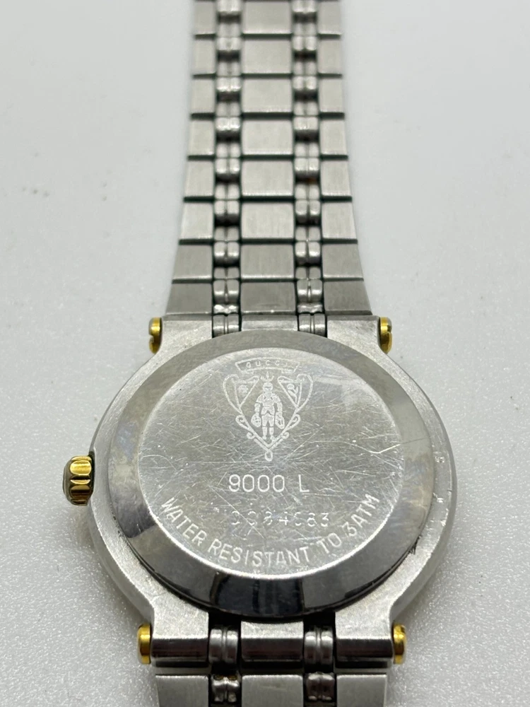 Model: Gucci 9000L Indices: does not apply Bezel Color: Gold Case Material: does not apply With Papers: No Band Material: Stainless Steel Seller Notes: “Not tested For Parts” Band Color: Silver Water Resistance: Not Water Resistant Brand: Gucci Movement: Quartz Features: 12-Hour Dial With Original Box/Packaging: No Customized: No Dial Color: Gold Year Manufactured: does not apply Department: Women Case Color: Silver Case Size: 25 mm Style: Classic, Dress/Formal Type: Wristwatch Reference Number: 9000L Display: Analog