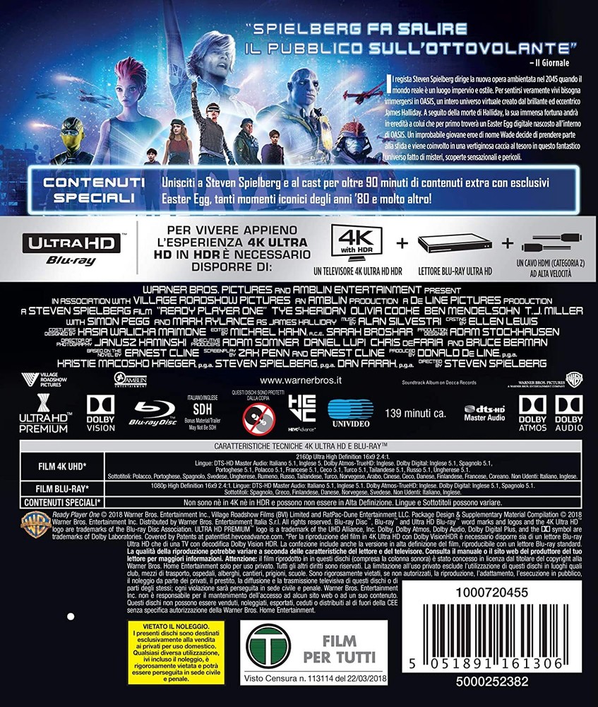 Further Details Title: Ready Player One (4k+Br) Condition: New Format: 4K UHD Blu-ray EAN: 5051891161306 Release Date: 09/12/2018 Studio: Warner Bros. Language: Italian, English, Latin Spanish Subtitle Language: Italian, English, Latin Spanish Director: Spielberg Steven Actor: Sheridan, Cooke, Mendelsohn, Waithe, Miller, Spielberg Steven No Of Discs: 1 Run Time: 140 minutes Description: NOTICE: The disk has English audio. Release Year: 2018 Missing Information? Please contact us if any details are missing and where possible we will add the information to our listing.