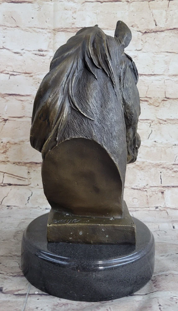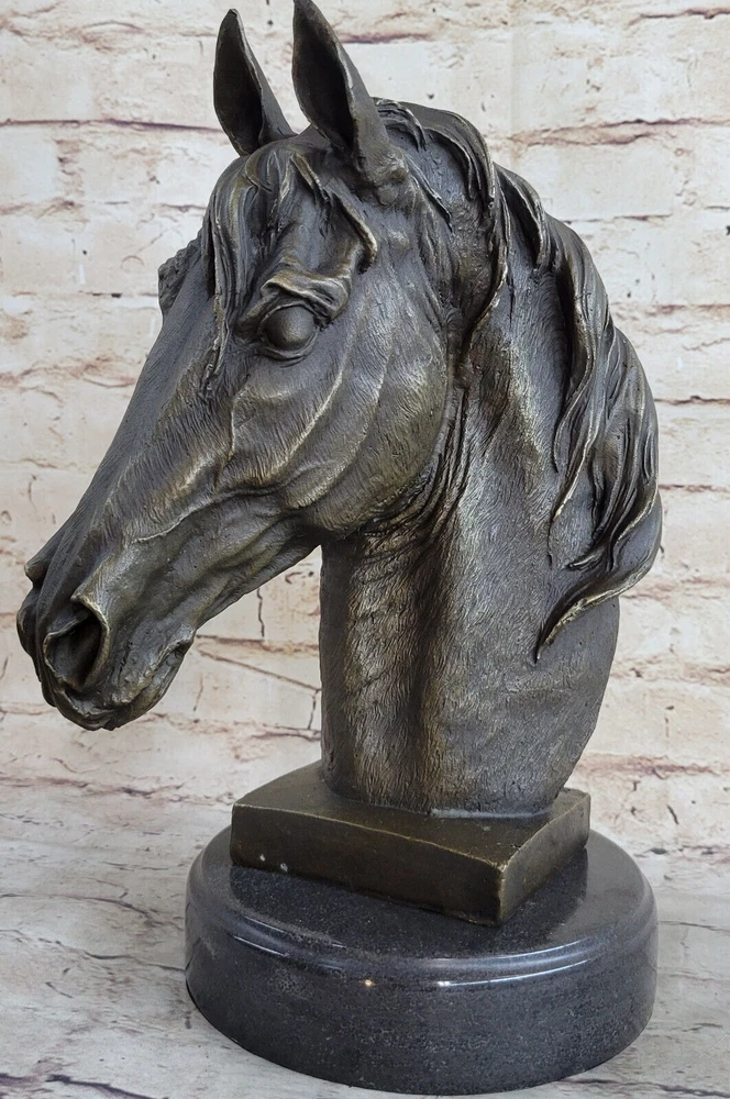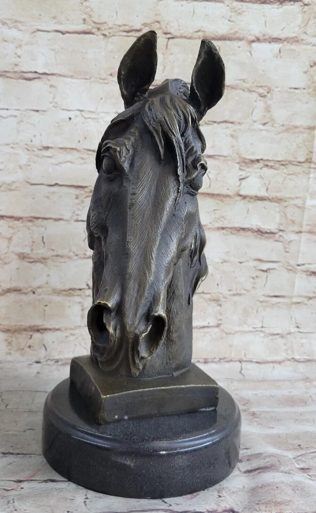 Condition : This sculpture is in perfect condition. Bronze Dimensions with Marble Base: Height 12" X Width 10" Marble Dimensions: Diameter 6.5" Height without base:11" Weight:13 LBS Inventory:32Y6705223 Dynamic Motion and Equine Spirit This striking bronze bust captures the raw energy and grace of a horse in motion, with its head bent downward and its mane flowing dramatically upward. The open mouth, as if mid-neigh, adds a dynamic element that brings the sculpture to life. Every aspect of the horse's pose reflects a moment of spirited movement, making it a powerful representation of the equine spirit. Exquisite Craftsmanship and Detail Crafted with extraordinary attention to detail, this sculpture is a testament to the artist's dedication and skill. Utilizing the traditional "Lost Wax Method," the piece is cast in 100% bronze, preserving every intricate feature of the original design. The rich brown patina and the smooth marble base enhance its elegance, while the flowing lines and textured surfaces demonstrate the artist's mastery in capturing the essence of the horse. A Timeless Tribute to Equestrian Art This bronze horse bust is more than just a decorative piece; it is a work of art that embodies the timeless beauty and majesty of equestrian subjects. The signature of the artist, Barye, adds to its authenticity and collectible value, making it a centerpiece for any art collection or a striking focal point in a room. Whether displayed on a mantelpiece, shelf, or table, this sculpture commands attention and admiration, celebrating the enduring bond between humans and horses. Signed Barye Unique Bronze Bust Horse Head Sculpture Marble Base Statue Figure YRD-670 Video will open in a new window Using the eBay App? Paste link into a browser window: [isdntekvideo]