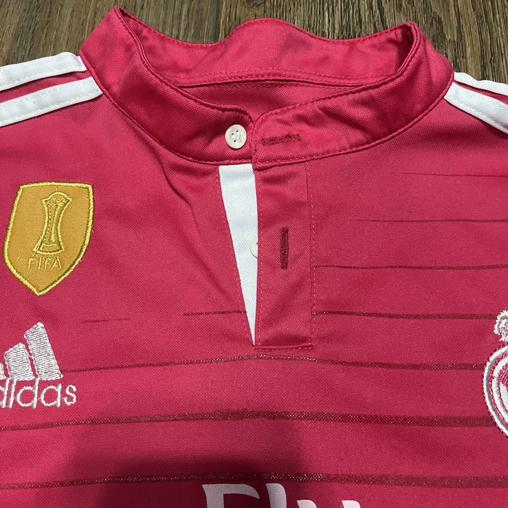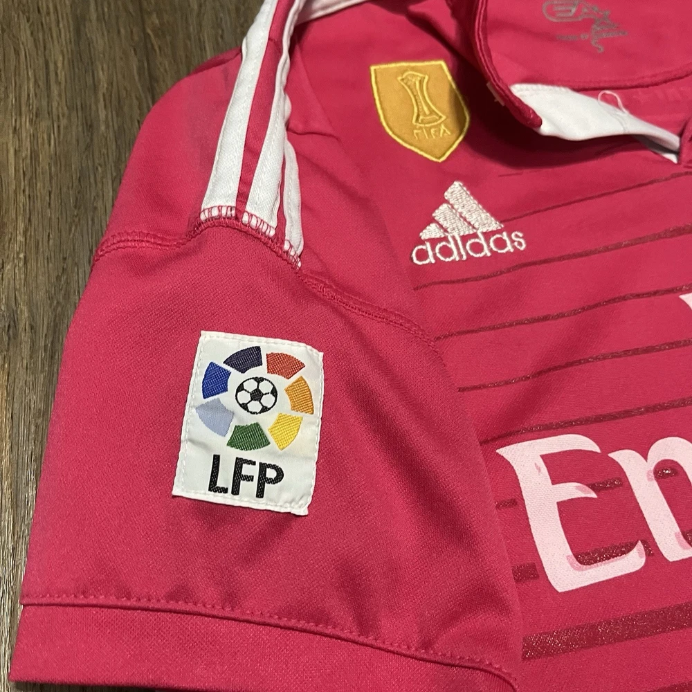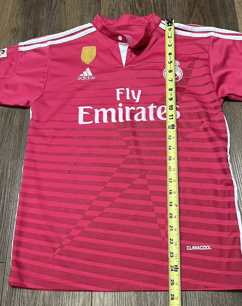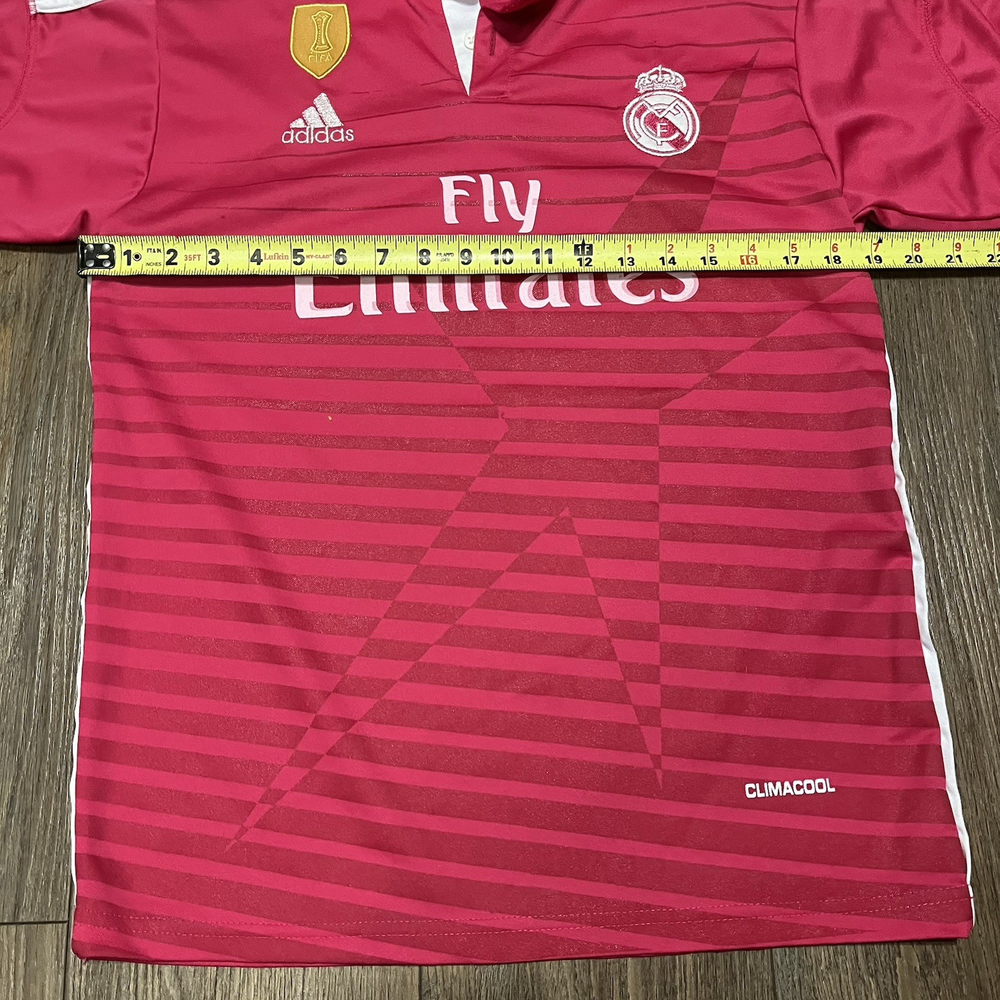 The product is a Real Madrid 2014-2015 away soccer jersey for men in size small, made by Adidas. The jersey is in a vibrant pink color and features the Climacool technology for breathability. This officially licensed jersey is a must-have for any Real Madrid fan looking to show their support from the sidelines of the game. With its authentic design and high-quality materials, this jersey is perfect for representing your favorite international soccer club in style.