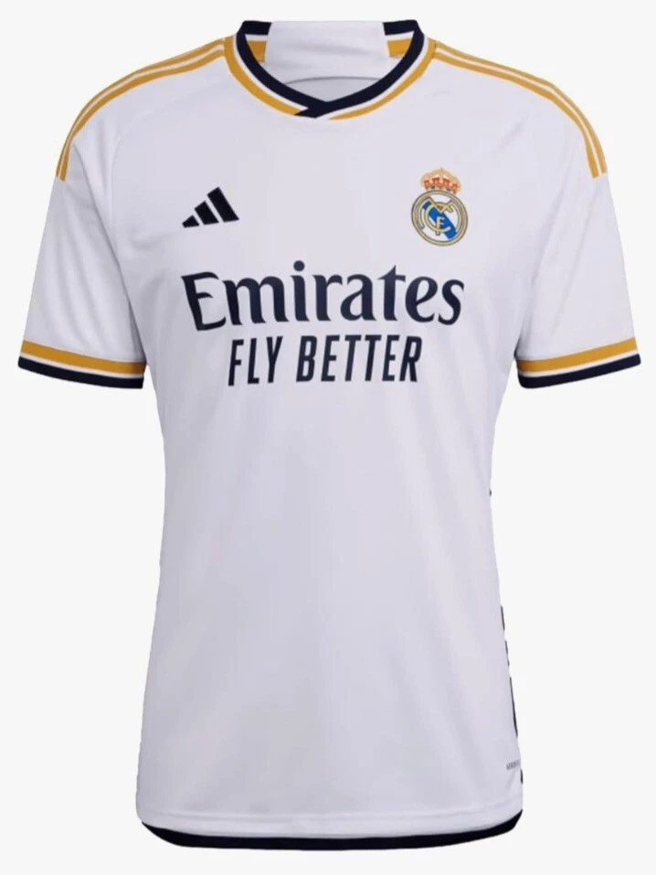 The Real Madrid 23/24 Adidas Home Jersey is a soccer jersey designed for fans of the Real Madrid team. It is in size L and features the Adidas brand logo. This jersey is specifically for supporters of Real Madrid looking to show their team pride during matches or as casual wear.