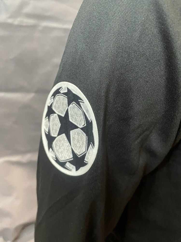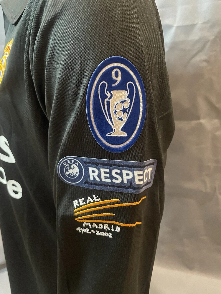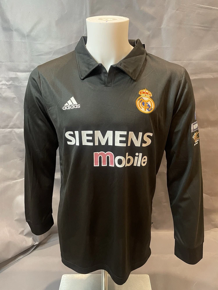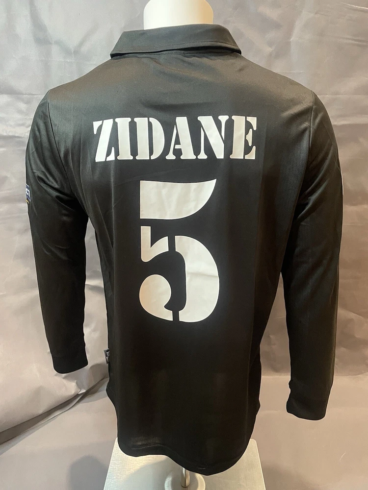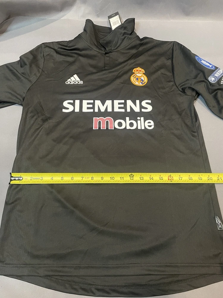 Immerse yourself in the glory of Real Madrid's historic era with this retro 02/03 away jersey, featuring the legendary Zinedine Zidane's name and number, #5. A must-have for any soccer aficionado, this black jersey celebrates the finesse of La Liga giants with a timeless design. Tailored to a men's large size, it offers both comfort and a stylish tribute to the sport. Whether you're cheering from the stands or reliving classic football moments at home, this jersey is perfect for fans who appreciate the sport's rich history. Its long sleeves make it an ideal choice for cooler weather, ensuring you can display your team pride year-round. With a capacity to hold 8 oz of your favorite beverage, it's also practical for game day essentials. Order as soon as possible to receive before holidays if you have any questions lemme know!