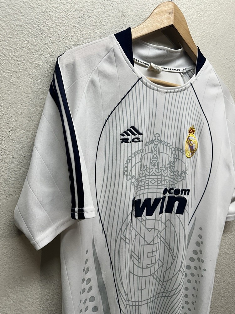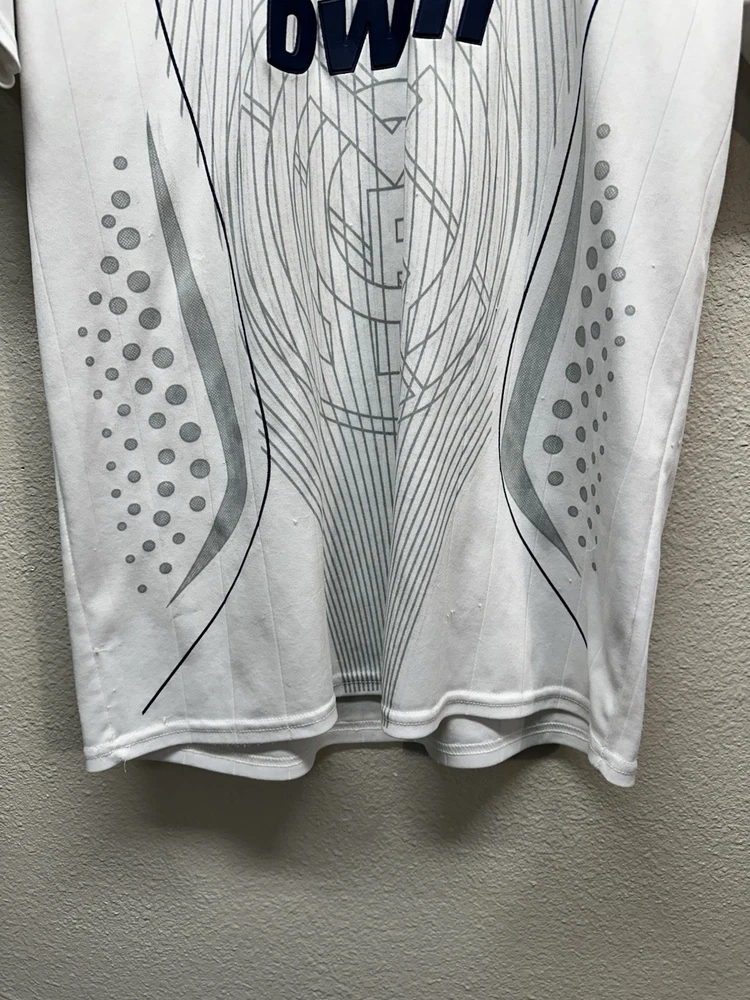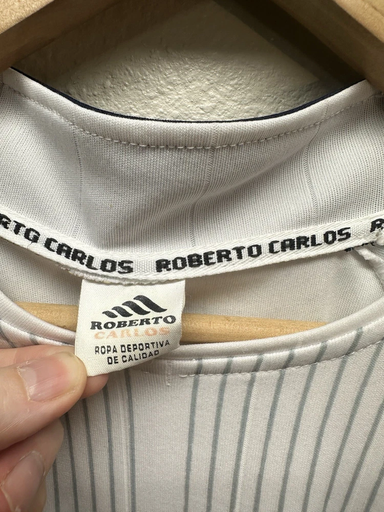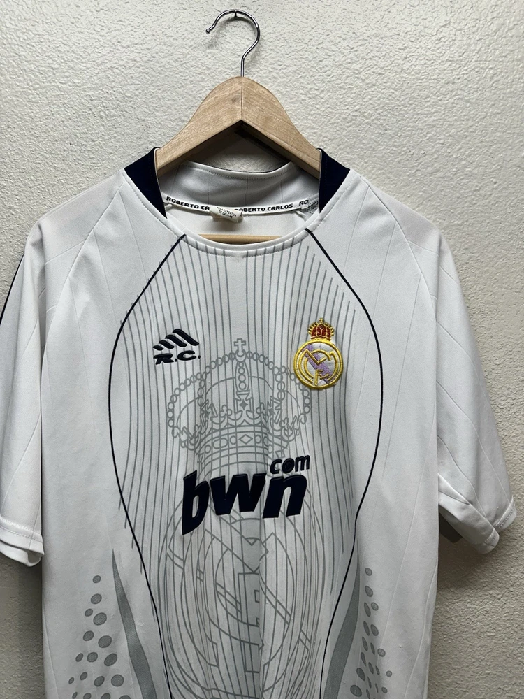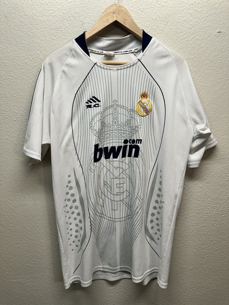 Authentic-looking Real Madrid style football jersey featuring Bwin sponsor print, embroidered club crest, and “Roberto Carlos” branded inner collar. This appears to be a fan/tribute jersey, not an official Adidas release. Lightweight athletic fabric, grey graphic crown + RM design on the front, and navy accent stitching. Size: No size tag — please refer to measurements below for best fit. Measurements (flat): • Pit to pit: 23” • Length: 30” • Sleeve: 9” Condition: Great pre-owned condition with normal light wear. No major flaws seen. Please see photos for full details. Features: • Bwin front sponsor • Embroidered Real Madrid crest • Roberto Carlos–branded tag • Lightweight performance material • Fan/collector piece