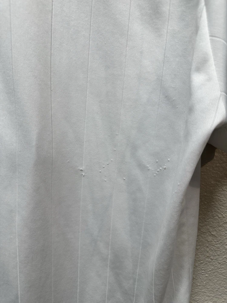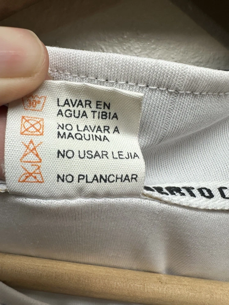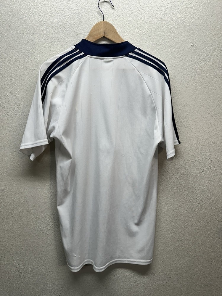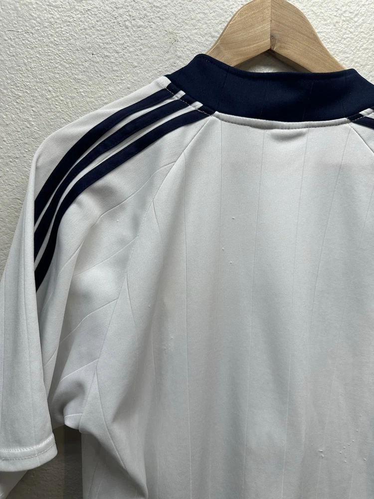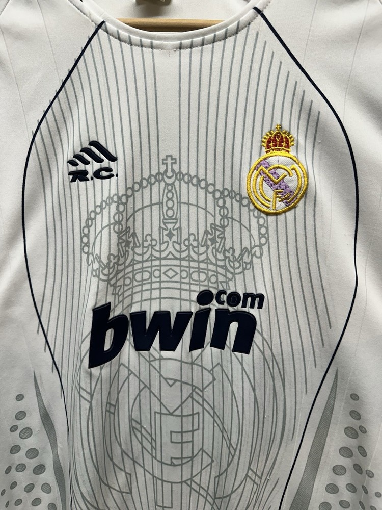 Authentic-looking Real Madrid style football jersey featuring Bwin sponsor print, embroidered club crest, and “Roberto Carlos” branded inner collar. This appears to be a fan/tribute jersey, not an official Adidas release. Lightweight athletic fabric, grey graphic crown + RM design on the front, and navy accent stitching. Size: No size tag — please refer to measurements below for best fit. Measurements (flat): • Pit to pit: 23” • Length: 30” • Sleeve: 9” Condition: Great pre-owned condition with normal light wear. No major flaws seen. Please see photos for full details. Features: • Bwin front sponsor • Embroidered Real Madrid crest • Roberto Carlos–branded tag • Lightweight performance material • Fan/collector piece