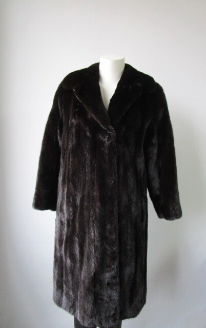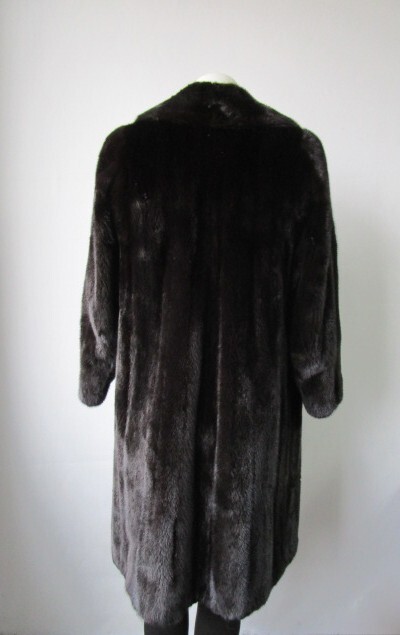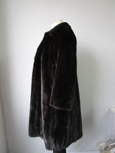I tem Description: Luxurious natural dark ranch mink fur coat for ladies. Top quality full and super soft mink fur pelts, mink fur collar, side slit pockets, front furrier closures, and satin lining complete the look of this elegant fur coat. Fur and lining EXCELLENT condition. SIZE: 6 Chest closed 40" LENGTH: 38" SLEEVES: 26" Stylish 3/4 Sleeves