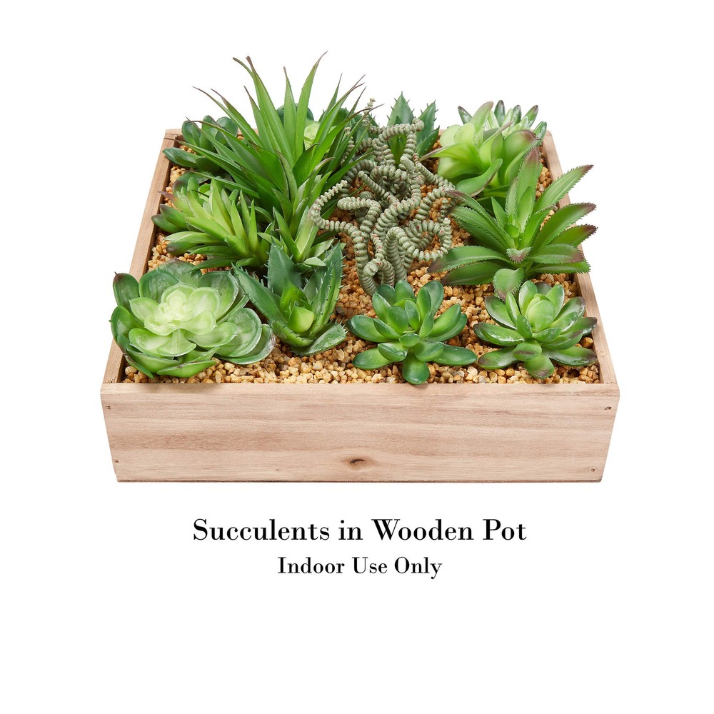 Enjoy beautiful greenery all year long with the Assorted Faux Succulent Arrangement by . These artificial plants are great for busy folks who want a bit of color and greenery in their home, but don’t have time to care for living plants. The plants are made of polyethylene plastic to appear more realistic than other artificial greenery. The plants come in a wooden box container for rustic charm. Each succulent and wooden box space is generously sized to add beauty to any room in your home and they make ideal gifts for housewarming parties, weddings or holidays. SATISFACTION - is committed to providing the consumer with the absolute best price and value on our entire line of products, which we ensure by applying a rigorous quality control process. NOTE: This is an exclusive product of and ONLY Faux Succulent Arrangements by are to be genuine IMPORTANT: Avoid buying counterfeit products and transacting with unauthorized sellers. Look for our logo on the packaging for every of our products. VERSATILE HOME ACCENT- These faux plants are designed for busy folks who want color and greenery in the home, but don’t have time to care for living plants. The bright colors and realistic look will add beauty to any room. HIGH QUALITY- Each artificial plant is made of high-quality polyethylene plastic. This gives each succulent a more lifelike look than other fake plants. The planter box is made of wood be lightweight and durable. GENEROUS SIZE- This set of faux succulents isn’t like others that are miniature and are too small for decoration. Each plant stands 5 inches tall with a 10-inch box and comes in a different style to create a unique display. PERFECT GIFT- Each piece of this artificial greenery arrangement is designed to add attractive charm and complement almost any décor. They make great gifts for housewarming parties, weddings, holidays and other special occasions. PRODUCT DETAILS- Materials: Polyethylene Plastic and Wood. Plant Dimensions: 10” L x 10” W x 5” H.