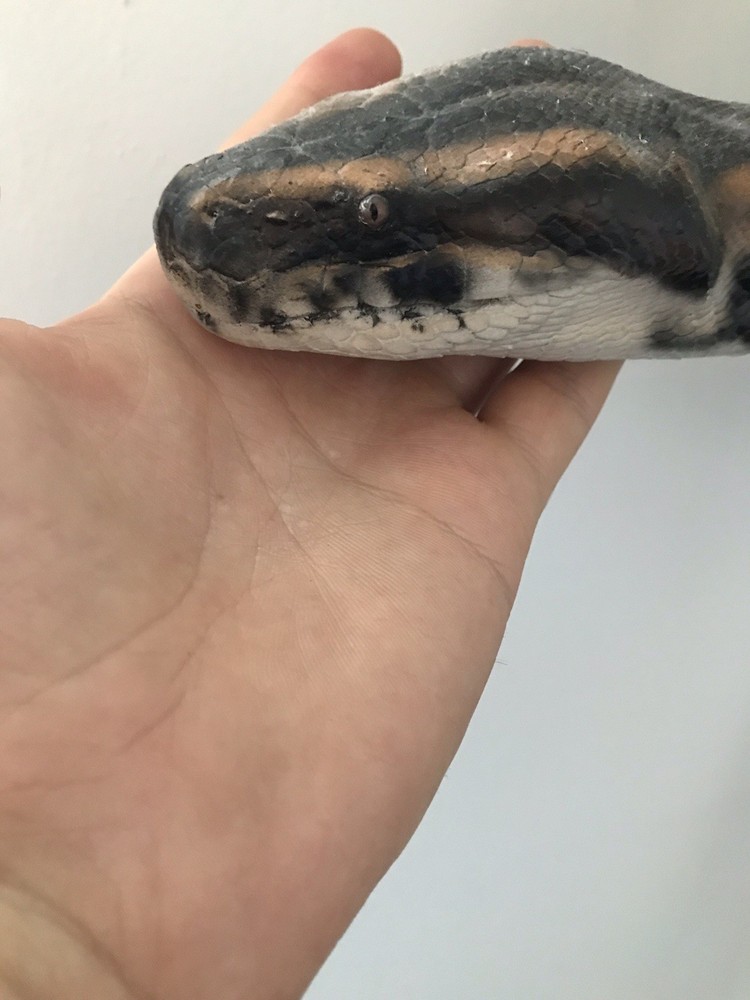 Contact before buying please! Gorgeous, unique, very real like sculpture of an Burmese Python 4’x2’ diameter. Life size sculpture, the snake is about 9’ long, head to tail . Fiberglass made in mold technique Snake and real wood trunk support base. This sculpture was a decor for a reptilian museum.