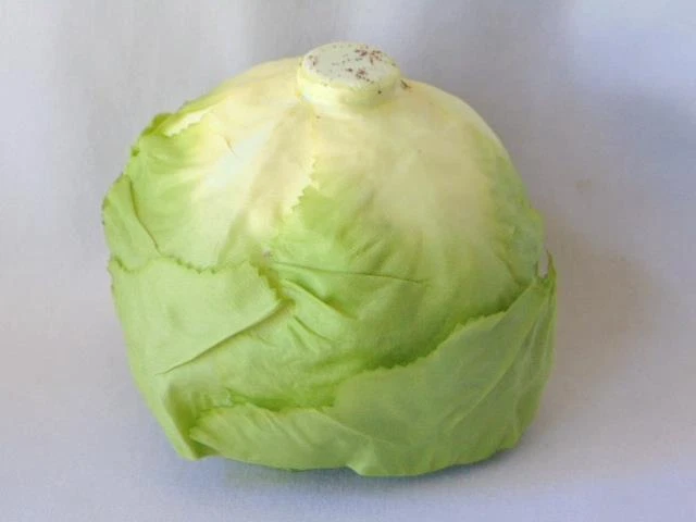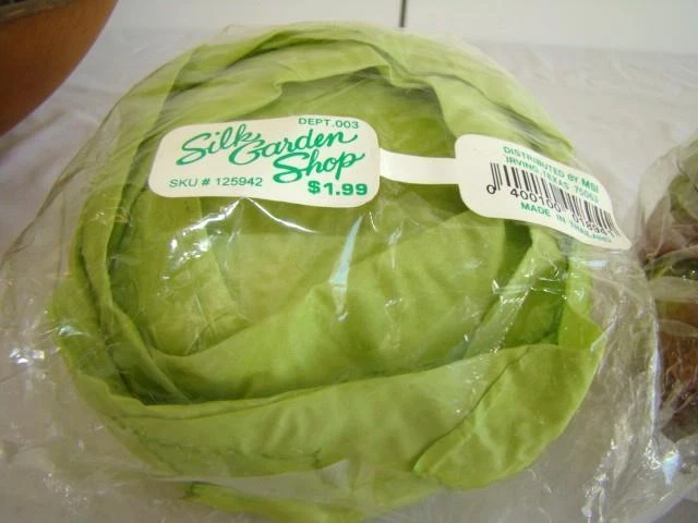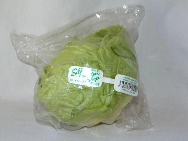 Realistic LETTUCE CABBAGE HEAD, Grocery Store Display, Food Replica, 1990s Realistic LETTUCE CABBAGE HEAD, Grocery Store Display, Food Replica, 1990s Click images to enlarge Description VINTAGE DISPLAY FAUX CABBAGE LETTUCE Fun and realistic vintage faux lettuce or cabbage head, measuring about 5-1/2" in size. Featuring a food prop, this was purchased in the 1990s for use in my general store display - so realistic stacked with other similar fake fruits and veggies. Sold through the SILK GARDEN SHOP and made in Thailand, I will include the original cellophane wrapper. Head is made of a silk or rayon blend to mimic the sheen and pliability of leaves. Designed into a tight ball, I'm guessing this is a cabbage - even the underside is toned to resemble how a head would have been cut from the ground. This has been stored in the bag for years - no smell to the cabbage, but the cellophane has a slight plastic scent. Fun addition to any display or staging! If questions, please contact me - thanks! Images sell! Get Supersized Images & Free Image Hosting Create your brand with Auctiva's Customizable Templates. Attention Sellers - Get Templates Image Hosting, Scheduling at Auctiva.com. Track Page Views With Auctiva's Counter