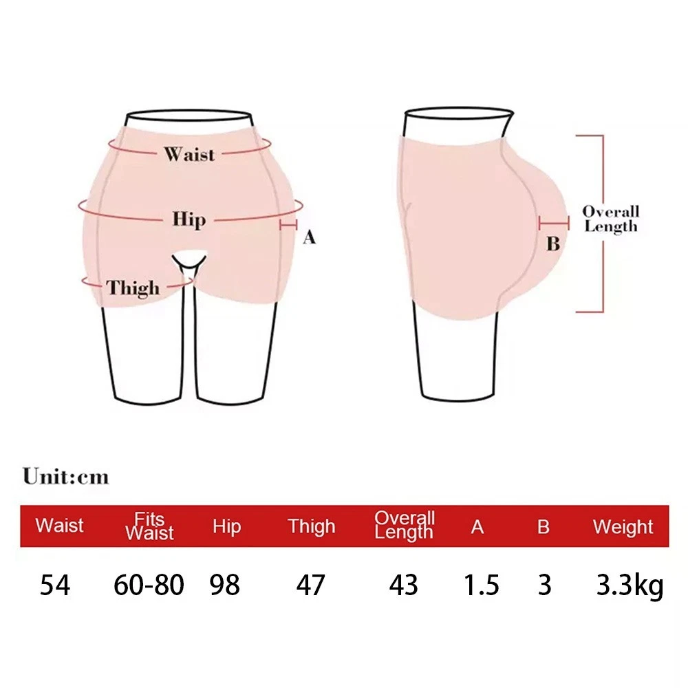 Features: 1.Hip enhancer-adds about 1.5cm thickness to the hip 2.Buttocks enhancer-adds about 3cm thickness to the buttocks 3.crotch is empty, which is simple and convenient.(Can be insert) Material: Medical Silicone Item weight: 3.3KG Suit for people: Suit for waist:60-80cm(23in-32in)Suit for height:162-189cm, Suit for weight:50-95kg FAQ: Q1 How to wear the silicone pants? &It maybe little tight to wear first time ,you can take bath ,use powder . Will be more and more adaptable to your body after used several times Q2 How to care the silicone pants ? & Clean them in lukewarm water with mild soap, air-dry or with towel gently; & Keep away from hot temperature, sunshine, sharp pointy things, washing machine, chemical material; & To avoid discoloration of other clothes, do not clean the products with other clothes;