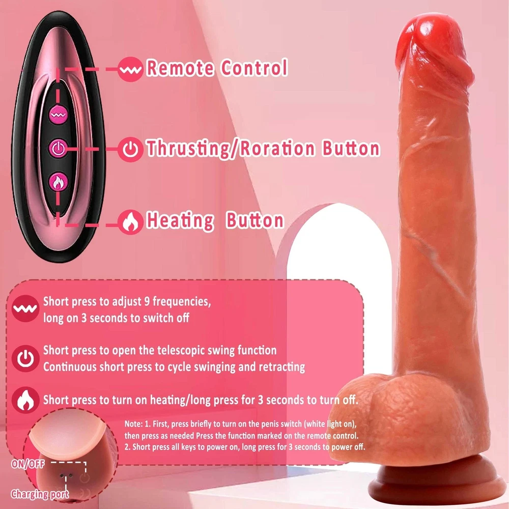 Thrusting Rotating Heating Suction Cup Dildo G-Spot Vibrator Sex Toys for Women <> <> <> Product Description: Experience Realistic Pleasure with the Telescopic Thrusting Dildo Vibrator Are you ready to elevate your intimate experiences to new heights? Our Telescopic Realistic Thrusting Dildo Vibrator is designed to provide you with the most realistic and pleasurable sensations. With its advanced features and versatile design, this vibrator is perfect for women who seek intense and satisfying pleasure, whether alone or with a partner. Key Features 1. Realistic Thrusting and Vibrating Modes Our Telescopic Thrusting Dildo Vibrator offers a combination of realistic thrusting and powerful vibrating modes. With multiple settings to choose from, you can customize your experience to suit your mood and preferences. The thrusting action mimics real-life movements, providing a lifelike and pleasurable experience. 2. Telescopic Design for Enhanced Realism The telescopic feature allows the dildo to extend and retract, adding an extra layer of realism to your play. This innovative design enhances the thrusting action, making it feel even more authentic. The adjustable length ensures a perfect fit for your comfort and pleasure. 3. Remote-Controlled Fun Take control of your pleasure with the included remote control. Adjust the thrusting and vibrating modes from a distance, allowing you or your partner to change the intensity and rhythm at any time. This feature adds an element of surprise and excitement to your intimate moments. 4. Body-Safe and Comfortable Materials Crafted from high-quality, body-safe materials, our vibrator is designed for your comfort and safety. The smooth, non-porous surface ensures a gentle touch and feel, making it suitable for all skin types. You can enjoy your pleasure with confidence, knowing that this toy is made with your well-being in mind. 5. Waterproof and Easy to Clean Fully waterproof, this vibrator is safe to use in the shower or bath, adding versatility to your intimate moments. The waterproof design also makes cleaning the toy easier and more convenient. Simply rinse with warm water and mild soap after use to keep your device hygienic and ready for the next time. 6. Discreet Packaging and Privacy Your privacy is our top priority. This product is delivered in discreet packaging, ensuring that your purchase remains confidential. You can order with confidence, knowing that your personal information and purchase details are secure. Why Choose Our Telescopic Thrusting Dildo Vibrator? 1. Realistic and Intense Pleasure The combination of realistic thrusting and powerful vibrations provides an authentic and pleasurable experience. The telescopic design enhances the thrusting action, making it feel even more lifelike. 2. Versatility Suitable for both solo play and couples, this vibrator offers a wide range of uses and experiences. The remote control functionality adds an extra layer of fun and excitement, making it perfect for spicing up your intimate moments. 3. Convenience The waterproof design and easy-to-use controls make this toy incredibly convenient and easy to incorporate into your intimate routine. The long-lasting battery ensures that you can enjoy your pleasure without interruptions. 4. Quality and Safety Made from high-quality, body-safe materials, our vibrator is designed for comfort, safety, and durability. The smooth surface and ergonomic design ensure a pleasurable experience, making it suitable for all users. 5. Privacy Discreet packaging ensures that your purchase remains private and secure. You can order with confidence, knowing that your personal information and purchase details are protected. How to Use Charge the Device: Connect the USB charging cable to the device and plug it into a power source. Allow it to charge fully for optimal performance. Clean the Toy: Before and after use, clean the vibrator with warm water and mild soap. Ensure it is dry before storing. Turn It On: Press the power button to activate the vibrator. Use the control buttons or the remote control to switch between thrusting and vibrating modes and adjust the intensity. Enjoy Your Pleasure: Position the vibrator as desired to target your sensitive areas. Experiment with different modes to find what feels best for you. Store Safely: After use, clean the toy again and store it in a cool, dry place. Keep it away from direct sunlight and extreme temperatures.