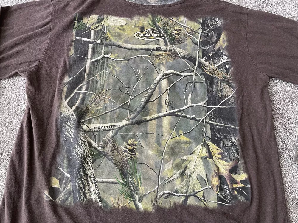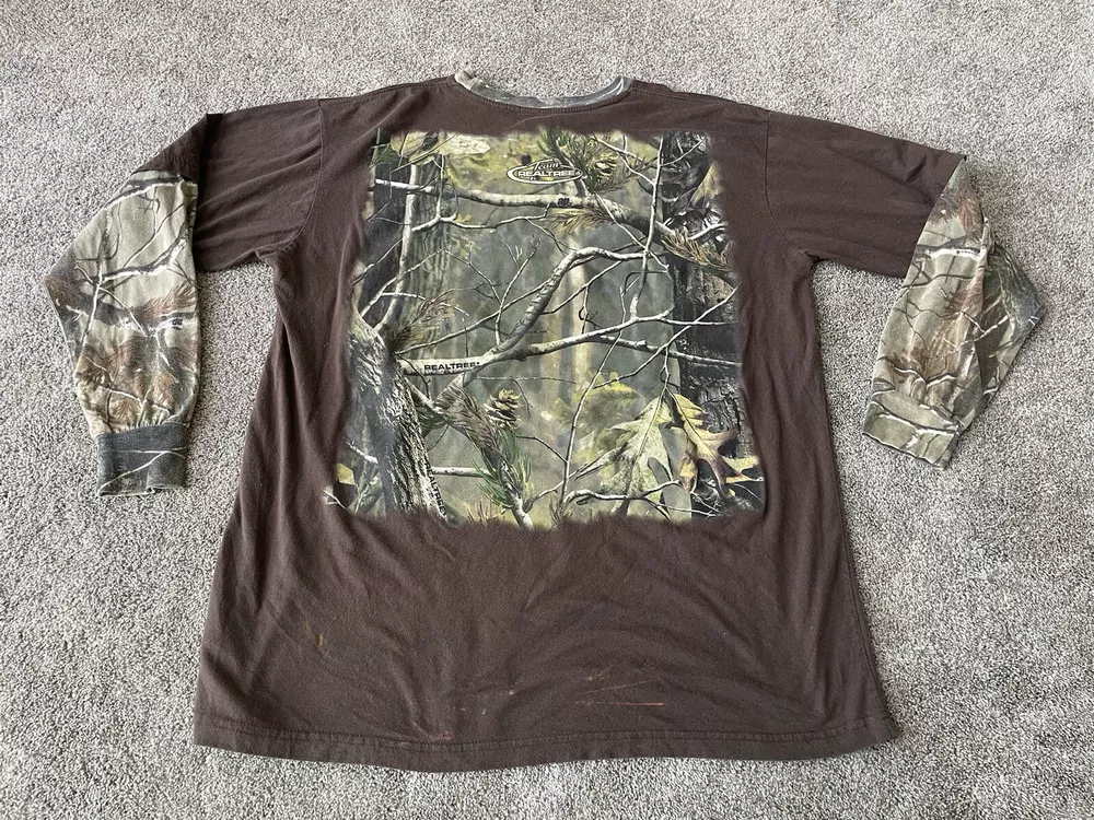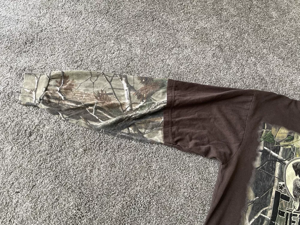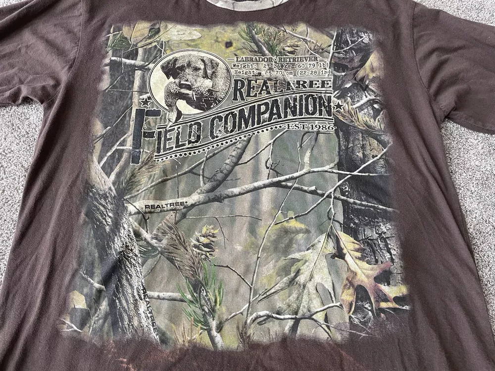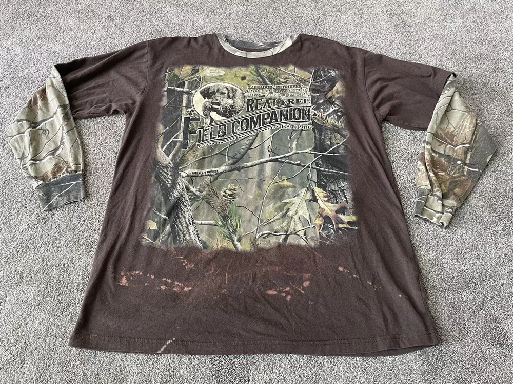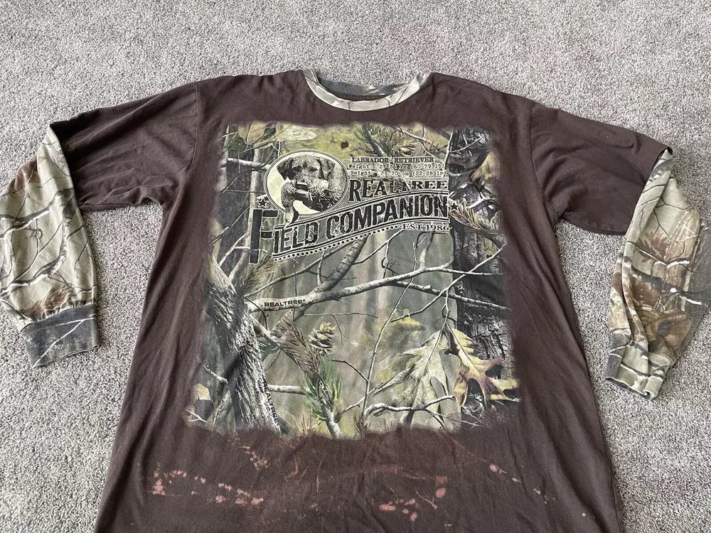 Get ready to hit the great outdoors with this Realtree Camo Shirt in size XL. The shirt features a Camouflage pattern with a Woodland Team Real Tree Labrador Dog theme, perfect for any nature or outdoor lover. The Long Sleeve shirt has a Crew Neckline and a Regular fit, making it comfortable and easy to wear in any season. Made from a knit fabric type, this T-Shirt is easy to care for and machine washable. The shirt also features a Double-Sided design with the Realtree logo accents. Whether you're going on a hike or just taking a walk in the park, this shirt is perfect for you.