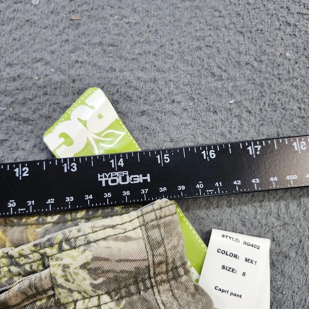 Realtree Girl pants in girls size 8 with a green camouflage cargo capri silhouette designed for casual outdoor play, camping, or hunting-inspired outfits. Tag details: Interior waistband label features AUTHENTIC REALTREE GIRL Est. 2006 branding, while a separate care tag lists 100% COTTON fabric content with Made in Guatemala text and wash instructions including machine wash cold, tumble dry low, do not bleach, wash before wearing, and wash dark colors separately. Color and fabric: Multi-tone green, brown, and tan MX1 camouflage print on midweight 100% cotton woven fabric for breathable comfort during warm-weather activities. Features: Mid-rise waist with zip fly and button closure, belt loops with coordinating removable fabric tie belt, front scoop pockets with a small coin pocket, dual cargo pockets on the legs with flap and button closures, and back patch pockets with buttoned flaps. Design details: Allover Realtree camouflage pattern with subtle printed MAX-1 logo hits, tonal stitching throughout, and small adjustment tabs with snaps at the leg openings to customize the capri-length fit. Hangtag information: Attached Realtree Outdoors hang tag lists Style: RG402, Color: MX1, Size: 8 and describes the garment as a Capri pant; barcode below the text shows UPC: 843763708281. Additional details: Pants are stored inside a clear plastic bag with a small white inventory sticker labeled "6831" on the exterior as pictured. Use: Versatile girls capri cargo pants suitable for outdoor adventures, school, or everyday casual wear; please review all photos for additional visual details and confirmation of style and design.