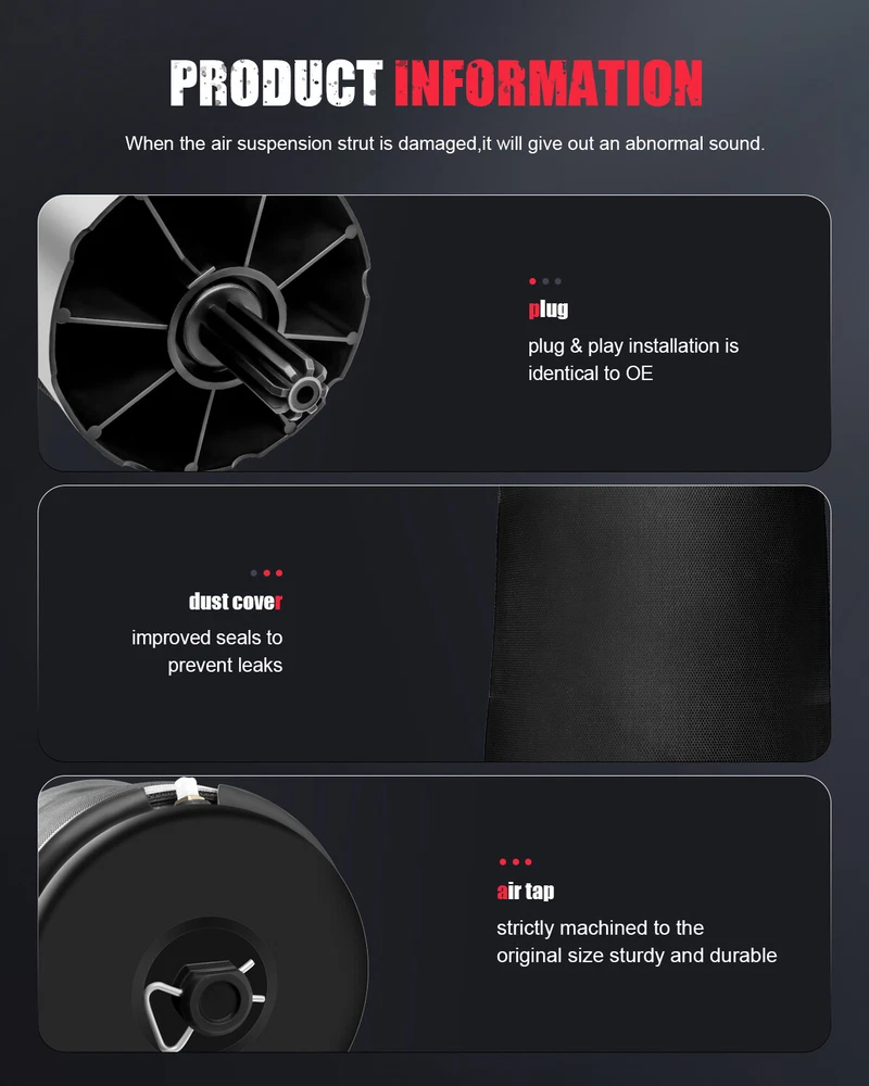 Notes: Please double confirm the compatibility as well as the OEM number before purchasing. Instruction is not included. Professional installation is recommended. *Fit For: 1, You can distinguish specific model of an automobile by VIN(Vehicle Identification Number). 2, VIN(Vehicle Identification Number) consists of total 17 English letters and arabic digits. 3, VIN does not include the letters I (i), O (o), and Q (q) (to avoid confusion with numerals 1 and 0). Rear Air Suspension Bag Air Spring For Land Rover Range Rover L322 RKB500082 Notes : Please double confirm the compatibility as well as the OEM number before purchasing. Instruction is not included. Professional installation is recommended. *Fit For: 1, You can distinguish specific model of an automobile by VIN(Vehicle Identification Number). 2, VIN(Vehicle Identification Number) consists of total 17 English letters and arabic digits. 3, VIN does not include the letters I (i), O (o), and Q (q) (to avoid confusion with numerals 1 and 0). Land Rover Range Rover L322 Autobiography Sport Utility 4-Door 5.0L 2012 Base Sport Utility 4-Door 4.4L 2003-2004 Base Sport Utility 4-Door 5.0L 2010-2012 HSE Lux Sport Utility 4-Door 5.0L 2012 HSE Sport Utility 4-Door 4.4L 2003-2009 HSE Sport Utility 4-Door 5.0L 2010-2012 Supercharged Sport Utility 4-Door 4.2L 2006-2009 Supercharged Sport Utility 4-Door 5.0L 2010-2012 If you need to any other air suspension shock strut( With Variable Damping Suspension ) please click > Front Right Air Suspension Struts please click > Front Pair air Suspension strut please click > Front Left air Suspension strut If you need to any other air suspension Shocks Struts( Without Variable Damping Suspension ) please click > Front Right Air Suspension Struts please click > Front Pair air Suspension strut please click > Front Left air Suspension strut please click > Front Pair Air Suspension St ruts + Rear Pair air Suspension spring If you need to any other air suspension Springs ( Range Rover L322 2002-2012 ) please click > Front Right Air Suspension Springs please click > Front Pair air Suspension spring please click > Front Left air Suspension s pring please click > Rear pair air Suspension Springs please click > Front Rear air Suspension Springs please click > Front Rear air suspension Springs + Air Suspension compressor *Generation & Evolution: Range Rover Classic First generation (1970-1996) P38A Second generation (1994-2002) L322 Third generation (2002-2012) L405 Fourth generation (2012-present) Expanded Line Range Rover Sport L320 First generation (2005-2013) L494 Second generation (2013-present) SVR (2015 Pre-Facelift) SVR (2018 Facelift) Range Rover Evoque L538 First generation (2011-2018) L551 Second generation (2018-present) Range Rover Velar First generation (2017-present) *Platform Drive Layout: Front Engine-Four Wheel Drive Layout *Specifications: Key Words: Rear Air Suspension Spring Bag For 2002-2012 Land Rover Range Rover L322 Package Includes: Single for Rear Left or Right Air Suspension Spring Bag * Frequently Asked Questions : How to prevent the damage of air springs/How to extend the service life of air springs/struts etc.? An air strut with separable air springs If your vehicle offers a separable air suspension (Audi Allroad A6 C5, Mercedes-Benz W164, BMW X5, etc.), you should regularly (about once a week) lift the car to the maximum position, and remove dirt with a high-pressure cleaner (keep the cleaner at a distance to the air spring about 30 cm/12 inches, otherwise water pressure can damage the air spring). The highest position may vary depending on your model and regulation options. Therefore, please test this by trying the different modes available to you (Sport, comfort, dynamic, off-road) and choose the one that sets your vehicle to the highest position. The dirt will most likely be found under the fold of the pneumatic chambers. If you find a frozen layer of bitumen on the piston guide (the part of a strut on which the air spring is installed), it is recommended to clean it as well. Whenever possible, avoid riding on fresh asphalt, as fresh bitumen mixed with sand immediately results in a build-up of abrasives on the piston and in turn contributes to accelerated wear and tear of the air spring. A complete air suspension shock Many cars such as Mercedes W220 or W211 are set up with a complete air strut - shock absorber and air spring visually form a complete spare part. In many cases, you can easily recognize these by the metal cups with which the air spring is tightly mounted. To best avoid any damage, we highly recommend to regularly check the condition of the dust protection seals of the air strut. What is the difference between an air spring and an air strut? The air spring is a part of the air strut. Some vehicles (e.g. Mercedes ML) allow you to change the air spring separately. At our online shop you have the opportunity to buy either the whole air strut or only the air spring. For some type of vehicles it is not possible to change the air spring separately. In this case the whole air strut should be replaced. Which side of my car is the Right and Left? The right and left sides of an automobile are determined as if sitting in the car facing forward. Thus, the left side is on the left when sitting in the car facing forward, and the right side is on the right. For American cars, the driver’s side is on the left, and the passenger sits to the right of the driver. For cars in Japan, Britain, Ireland, the Bahamas and some other former British colonies -- where they drive on the left side of the road -- the passenger sits on the left side, and the driver (along with all the driving controls) is on the right. Item Specifics Placement on Vehicle Left Right Rear Type Air Suspension Air Spring Fitment Type Direct Replacement Size Single Dimension(CM) 37.00(Length)*18.00(Width)*18.00(Height) Single Weight(KG) 2.200 Upper Mounting Isolator Included No Isolator Required Lower Mounting Isolator Incl