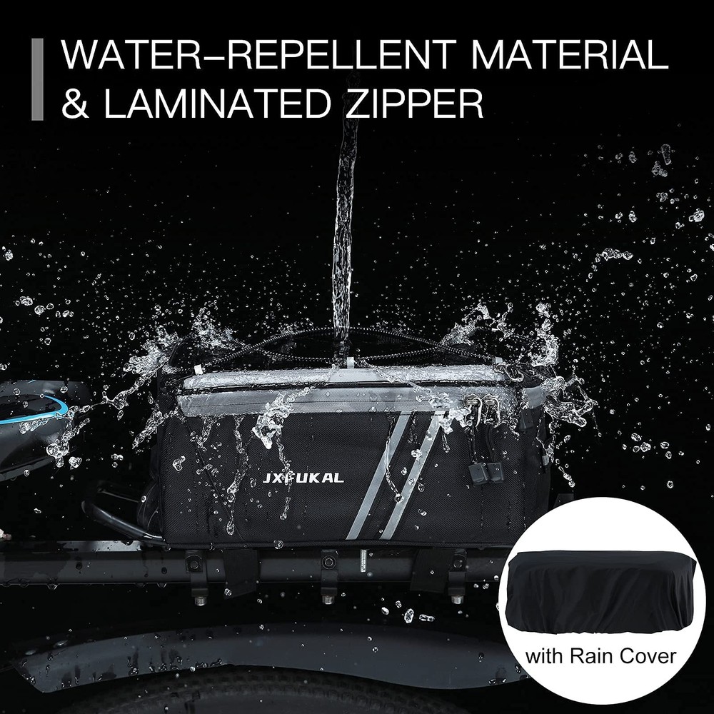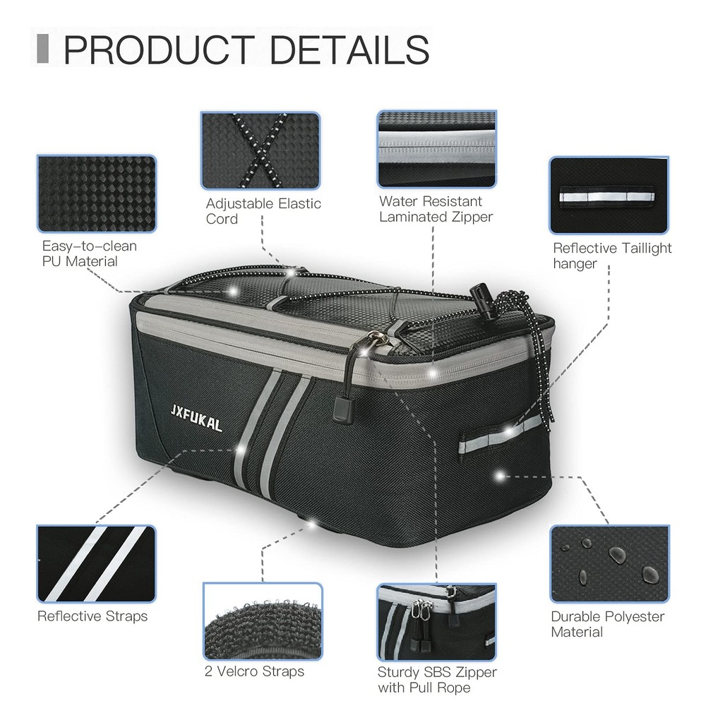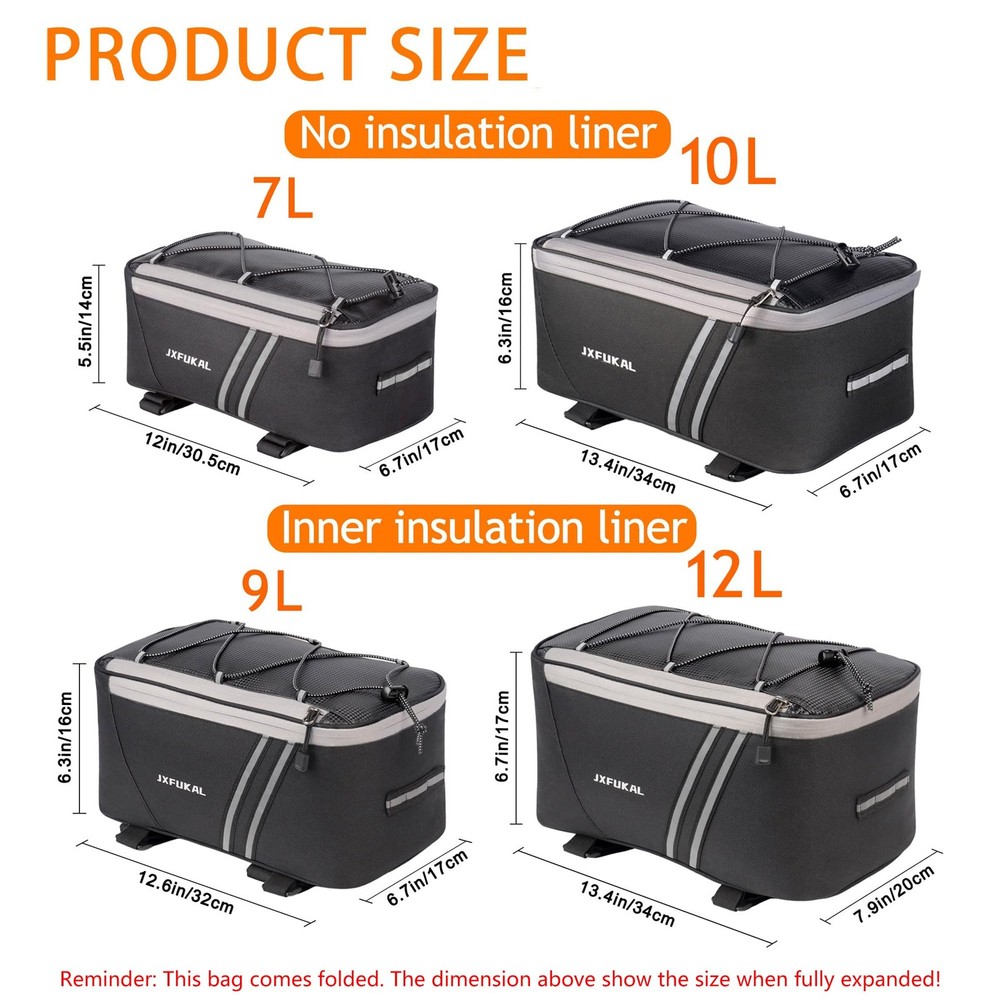 WATER RESISTANT & STURDY: The bicycle rack bag is made of PU leather & polyester, which is durable, water repellent and easy to clean. It even comes with rain cover that completely helps protect the trunk and the stuffs in it from dirt, sand, water, rain and snow. 7L CAPATITY: Our bike carrier bag includes a main compartment, a extra top zippered pocket and adjustable elastic cord, which helps keep your riding essentials well organized. Dimension of 12 x 6.7 x 5.5inch (L x W x H), 7l capacity enough to contain wallet, phones, power bank, small speaker, towels, T-shirt,food, drinks,bike locks , small tools, water bottles, sunglasses etc. REFLECTIVE STRIPS: The reflective strips increase visibility at night, together with the rear belt for taillight(not included), which make you riding more safe. EASY TO INSTALL: This trunk attaches easily to the rear bike/e-bike rack with 2 velcro straps; Interior equipped with thin PE foam for better protecting the gears in the bag. It could collapse flat when you don’t use it. YOUR GREAT BIKING BUDDY: This bag features portable and lightweight. No matter what kind of occasion, such as picnics, backpacking, commuting and hiking, it will be your good partner. If you have any problem with it, don’t hesitate to contact us, we’re always at your service.