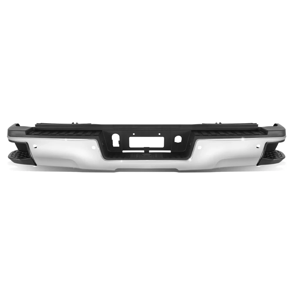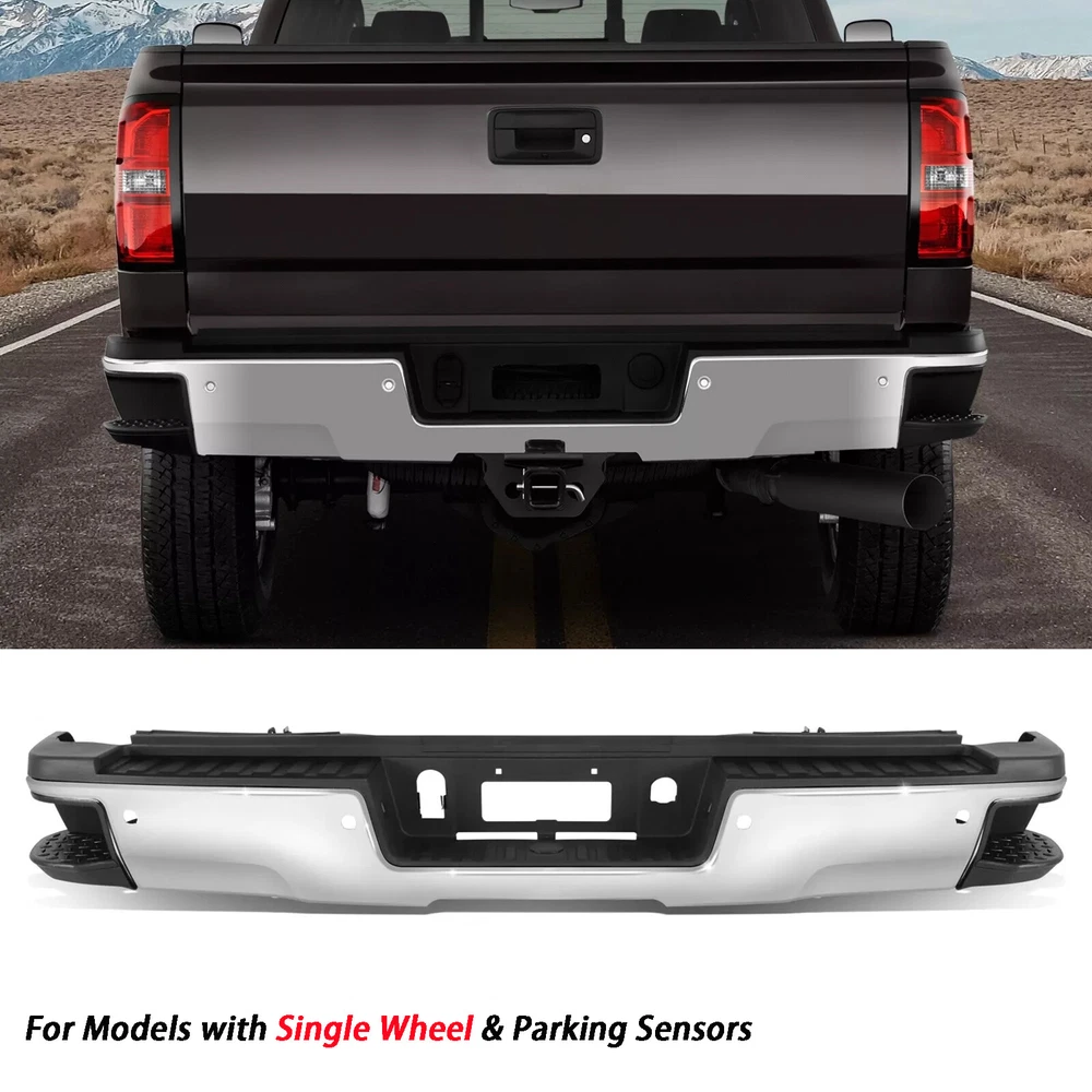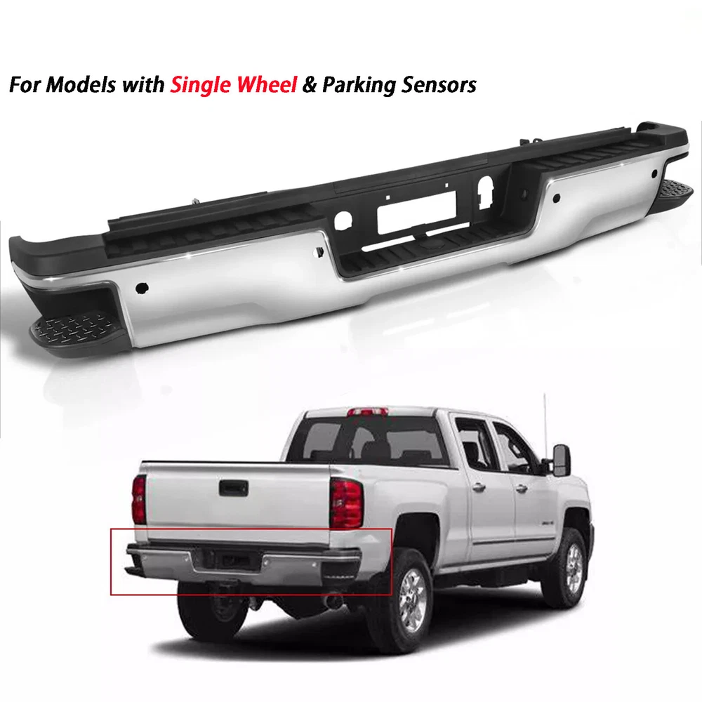 Fitment: 2015-2019 Chevrolet Silverado 2500 HD 2015-2019 Chevrolet Silverado 3500 HD 2015-2019 GMC Sierra 2500 HD 2015-2019 GMC Sierra 3500 HD For Models With Park Sensors For Use With Factory Tow Hitch (Hitch Plate Not Included) High Polished Chrome Finish For Rear Single Wheel Models ONLY Includes Reinforcement, Brackets, Hardware, Lamps and Step Pad Direct OE Replacement