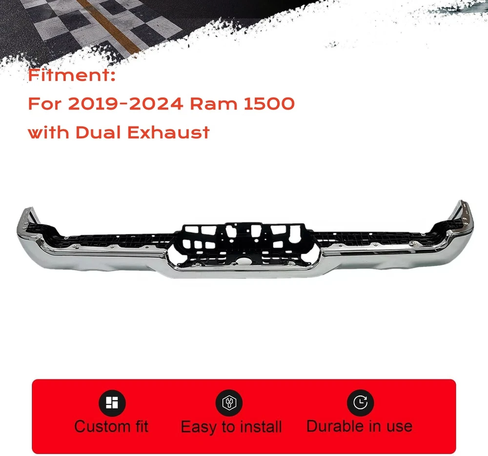 Rear Bumper Face Bar For Dodge Ram 1500 2019-2024 with Dual Exhaust Steel Chrome