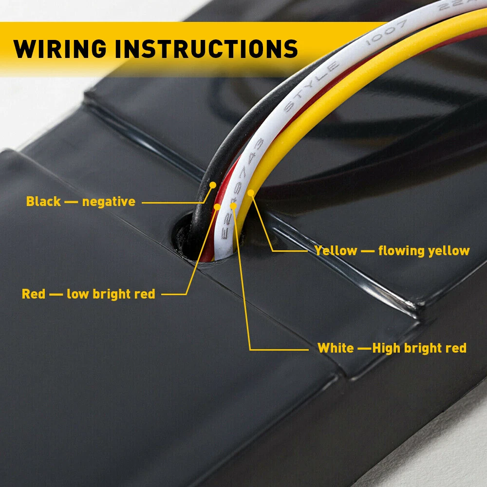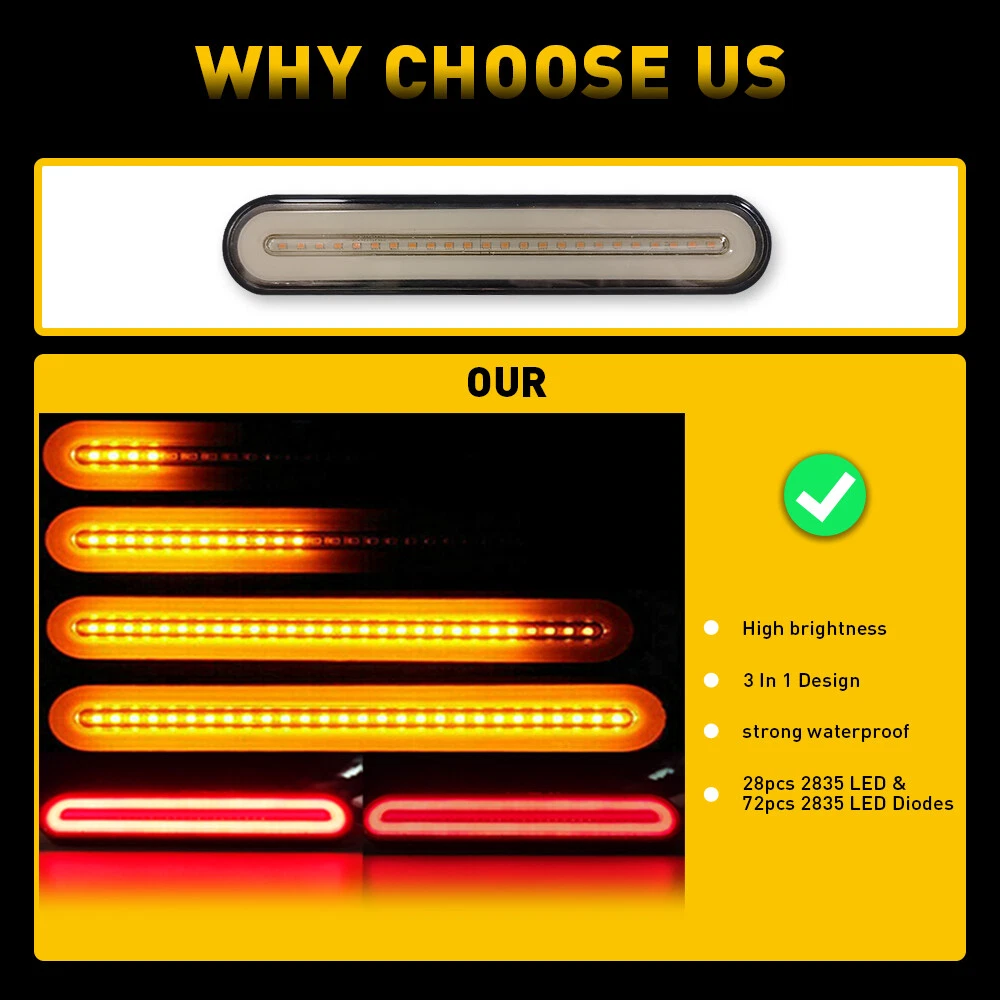 LED Flowing Reverse Stop Brake Turn Signal Rear Tail Light For Truck Trailer RV Specification Waterproof level: IP68 Voltage:12-24V LED Type:2835 SMD LED quantity: 100pcs Light Color:Red+Yellow Material: PC+ABS Service life: 50000h+ Suitable: for use on heavy duty trucks, RV,semi-trailers, cargo trailers, boat trailers, work vehicles and a wide or narrow overland vehicle. Funciton: as clearance, side marker or identification light, stop, turn, tail and brake light Wire Connection: Black wire : negative Red wire : low brightness (red) White wire : high brightness(red) Yellow wire: dynamic light(yellow) Rear DRL Truck Car Light LED Brake Bar Flowing Turn Signal Stop Tail Strip 12-24 LED Flowing Reverse Stop Brake Turn Signal Rear Tail Light For Truck Trailer RV Specification Waterproof level: IP68 Voltage:12-24V LED Type:2835 SMD LED quantity: 100pcs Light Color:Red+Yellow Material: PC+ABS Service life: 50000h+ Suitable: for use on heavy duty trucks, RV,semi-trailers, cargo trailers, boat trailers, work vehicles and a wide or narrow overland vehicle. Funciton: as clearance, side marker or identification light, stop, turn, tail and brake light Wire Connection: Black wire : negative Red wire : low brightness (red) White wire : high brightness(red) Yellow wire: dynamic light(yellow) Features: *3-in-1 design: 3 In 1 Design,Neon Halo Ring Tail & Brake Light,Sequential Flowing Signal Light. *High brightness: The 2835 super bright LED with high brightness ensures its strong waterproof function and long service life,it is suitable for all outdoor inclement weather. *Waterproof: The tail light is highly silicon sealed with an IP67 waterproof rating, which works even under extreme conditions such as rain and snow. *Easy to install: Direct replacement,drilling and hardwiring are not required *Wide application: Fit for heavy-duty trucks, RV,semi-trailers, cargo trailers, boat trailers, work vehicles and a wide or narrow overland vehicle. Note: Please check the detail information carefully before purchasing Please allow 1-2mm in size measurement chart for variance due to manual measurement Your satisfaction is our utmost concern, please feel free to contact us for any questions and concerns Package Include: flowing tail light*1 Item Specifics Type 9 INCH LED light bar Manufacturer Part Number WD-RY-FLOW-EA LED Brand 2835 SMD LED CHIPS Working Temperature -40 to ++++ 80 centigrade Waterproof Ip67 To Fit parking,brake turn signal/Driving Lights Number of Bulbs 100LED Voltage DC 12-24V Color Red++++ Yellow Lens Color Smoke Placement on Vehicle Front, Rear, Left, Right, Inner Other Part Number Each light has 28pcs 2835 Super Bright LED Brand Unbranded Fitment Type Direct Replacement Fit For 1 Jeep、Mini、Nissan、Toyota、BMW、Ranger、 Land Rover Fit For 2 Pickup、Wagon、UTB、Cab、ATV、SUV、Jeep、Truck、Boat、Bus Fit For 3 Sport Utility、4WD 4X4、Chevrolet Silverado、GMC Sie Other Part Number 2 72Pcs 2835 SMD LED Diodes for a Bright Performance Position Stop turn tail brake marker Clearance Lamp Manufacturer Warranty Lifetime Lighting Technology LED Payment We only accept PayPal payment, should be received within 3 days from the date of purchase. Please keep the consistency of Paypal address and ebay address. Payment should be made within 4 days once you won a item ,or ebay will launch Unpaid Reminder agaist you and there will be bad record on your ebay account . Buyers are responsible for import duties, custom fees and taxes.Please check with your country's custom office to determine the additional costs before you finally make the purchase Shipping All items will be shipped in 48 hours after receiving your payment . We ship this item to US only via USPS first class mail. It usually takes 3-6 working days to deliver. Returns We offer 30 days return policy. Please contact us within 30 days t from the date you receive your order if you have any issues with the product or want return .Refund will be send after we got your resend package. All returned items should be in the original packaging , return tracking information should be provided .. Buyer is responsible for return shipping cost due to the problem not caused by item quality itself . Contact Us Our office hours are MONDAY - FRIDAY 9:00PM - 6:00PM PST, but we will response you once we get your message .There will be some delay on response if you send message or E-Mail on weekend. FAQ Q1: Will this bulb fit my vehicle? A: We can match almost any vehicle to one of our bulb sizes. eBay only lets us include partial vehicle fitments per listing, but if your vehicle does not show up on the compatibility table at the top of our listings, welcome you to contact us for free consulation before purchasing a product. Q2: My item has not arrived, what's taking so long? A: Sometimes items take longer than expected, especially if it’s going far or to rural area. Check with your post office to see if your item has been held up. Sometimes USPS will not update a tracking number until it has arrived at its destination. If your item still has not arrived after a few days, let us know so we can double check for you and help solve it asap. Q3: Do I need to mention the Year, Make and Model in the notes when place order? A: YES. Please include the Year, Make, and Model in the notes section during checkout to ensure you receive everything needed for your kit! Q4: My bulbs won't fit, help! A: Special bulb holder may be required. See if you can take the holder from the stock bulb. If not, let us know. The bulb size may be wrong, double check the item you received with the item you ordered. Do you have an aftermarket lighting housing? These may not be perfectly fitted for aftermarket bulbs and will require some manual modifications. Q5: Neither side lighting up? Both sides flicker, flash, or work inconsistantly. A:Check the headlight fuses, and then check the ballast plugs to insure correct installation. If this doesn't work, there may be a voltage problem with