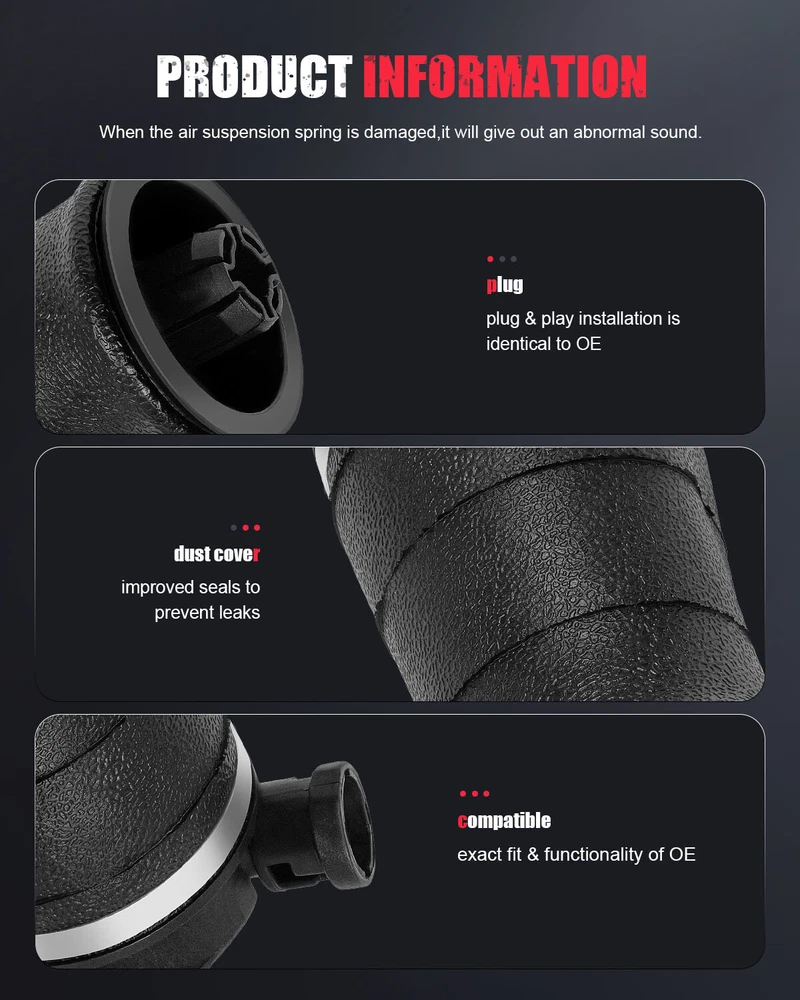 Notes: Please double confirm the compatibility chart as well as the OEM number before purchasing. Instruction is not included. Professional installation is recommended. *OEM Part Number: 3U2Z5580JA,3U2Z5580NA *Item Specifications: Key Words: Rear Left Air Suspension Spring Bag For 1995-2002 Lincoln Continental Package Includes: Single for Rear Left Air Suspension Spring Bag *Compatibility Chart: 1, You can distinguish specific model of an automobile by VIN(Vehicle Identification Number). 2, VIN(Vehicle Identification Number) consists of total 17 English letters and arabic digits. Rear Left Air Suspension Air Spring For Lincoln Continental Anniversary Notes : Please double confir m the compatibility chart as well as the OEM number before purchasing. Instruction is not included. Professional installation is recommended. *OEM Part Number: 3U2Z5580JA,3U2Z5580NA *Item Specifications: Key Words: Rear Left Air Suspension Spring Bag For 1995-2002 Lincoln Continental Package Includes: Single for Rear Left Air Suspension Spring Bag *Compatibility Chart: 1, You can distinguish specific model of an automobile by VIN(Vehicle Identification Number). 2, VIN(Vehicle Identification Number) consists of total 17 English letters and arabic digits. 3, VIN does not include the letters I (i), O (o), and Q (q) (to avoid confusion with numerals 1 and 0). Lincoln Continental Anniversary Sedan 4-Door 4.6L 1996 Continental Base Sedan 4-Door 4.6L 1997-2002 Continental Diamond Anniversary Sedan 4-Door 4.6L 1995 Continental Signature Sedan 4-Door 4.6L 1995 Continental Spinnaker Edition Sedan 4-Door 4.6L 1995-1997 * Generation & Evolution: Lincoln Continental Edsel Ford prototype (1939) First generation (1939-1948) Second generation (1956-1957) Third generation (1958-1960) Mark III (1958) Mark IV (1959) Mark V (1960) Fourth generation (1961-1969) Fifth generation (1970-1979) Sixth generation (1980) Seventh generation (1982-1987) Eighth generation (1988-1994) Ninth generation (1995-2002) Tenth generation (2017-present) *Platform Drive Layout : Front Engine-Front Wheel Drive Layout *Installation Guideline: 1.Place new air spring into lower suspension seat. Press down on piston until the plastic locking clips snap into place.(reverse step#7) 2.Pull up on the air spring cap and lock it back to the top body bracket.(reverse step#6) 3.Replace o-rings and install the solenoid in the new air spring.(reverse steps 4 and 5) 4.Replace wheel and lower suspension. 5.Turn air suspension switch back to the on position and start vehicle. Suspension will automatically return to its normal trim height. *Warning & Notice: Vent all air pressure from the air suspension system prior to disconnecting or removing any air suspension components. It is dangerous to remove air suspension components while under pressure. Failure to follow this instruction may result in serious personal injury. Any air spring which is unfolded must be refolded prior to being installed in a vehicle. Refer to the procedure. An incorrectly folded air spring could rupture, altering the handling characteristics of the vehicle. If a vehicle has been driven with an incorrectly folded air spring, a new air spring must be installed. Failure to follow these instructions may result in serious injury to vehicle occupant(s). Failure to observe the following instructions may result in a sudden failure of the air spring or suspension system. Any rear spring which is unfolded must be refolded prior to being installed in a vehicle. The air spring refolding procedure should only be used for an air spring which has never supported the vehicle's weight while in the incorrectly folded position. Incorrectly folded air springs found on vehicles during pre-delivery inspection or after use must be installed new. Do not attempt to inflate any air spring which has been collapsed while uninflated from the rebound hanging position to the jounce stop. When installing a new air spring, care must be taken not to apply a load to the suspension until springs have been inflated using the air spring fill procedure. After inflating an air spring in the hanging position, it must be inspected for correct shape. 1.NOTE: The vehicle must be positioned on a suitable lifting device prior to deflating the air suspension system. With the vehicle in NEUTRAL, position on a hoist until the wheel and tire assemblies are slightly above the ground. 2.Using the scan tool, vent the air springs. 3.Remove the air spring retainer. 4.Detach the air spring from the rear axle. 5.Remove the air spring in the following sequence. 1.Disconnect the air spring solenoid electrical connector. 2.Compress the quick connect locking ring and pull out the air tube. 3.Remove the air spring. * Frequently Asked Questions : How to prevent the damage of air springs/How to extend the service life of air springs/struts etc.? An air strut with separable air springs If your vehicle offers a separable air suspension (Audi Allroad A6 C5, Mercedes-Benz W164, BMW X5, etc.), you should regularly (about once a week) lift the car to the maximum position, and remove dirt with a high-pressure cleaner (keep the cleaner at a distance to the air spring about 30 cm/12 inches, otherwise water pressure can damage the air spring). The highest position may vary depending on your model and regulation options. Therefore, please test this by trying the different modes available to you (Sport, comfort, dynamic, off-road) and choose the one that sets your vehicle to the highest position. The dirt will most likely be found under the fold of the pneumatic chambers. If you find a frozen layer of bitumen on the piston guide (the part of a strut on which the air spring is installed), it is recommended to clean it as well. Whenever possible, avoid riding on fresh asphalt, as fresh bitumen mixed with sand immediately results in a build-up of abrasives on the piston and in turn contributes to accelerated wear and tear of the air spring. A complete air suspension shock Many 