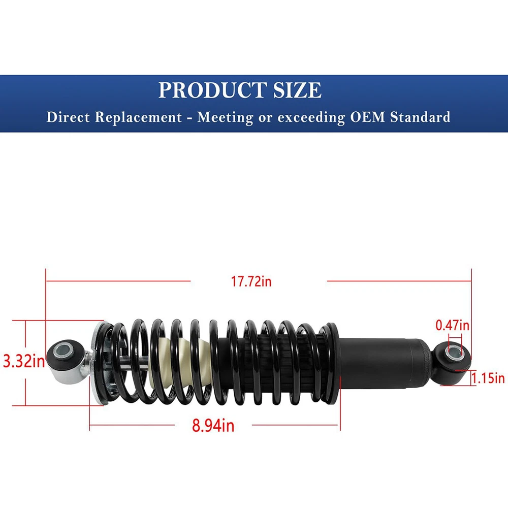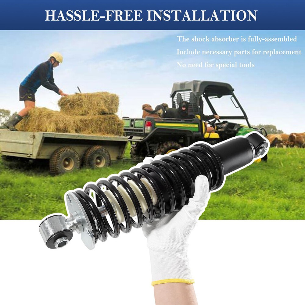 Fitment: Fits for John Deere Gator HPX 2004-2017, for John Deere Gator HPX 615E, 815E 2018-2020, for John Deere Gator XUV620i 2007-2010, for John Deere Gator XUV850D 4x4 Diesel 2007-2010 Features: 1) The shock absorber is fully-assembled, including necessary parts required for replacement. No need for special tools 2) Precisely machined from fully heat treated alloy steel with slick black oxide finish, higher strength, better corrosion and impact resistance, ensuring reliable and long-lasting durability 3) Package includes 2Pcs coil-over shock absorber for use on rear left and right strut (Replaces OEM# AM135375), manufactured and tested to meet original equipment standards and performance Package included: 2Pcs coil-over shock absorber