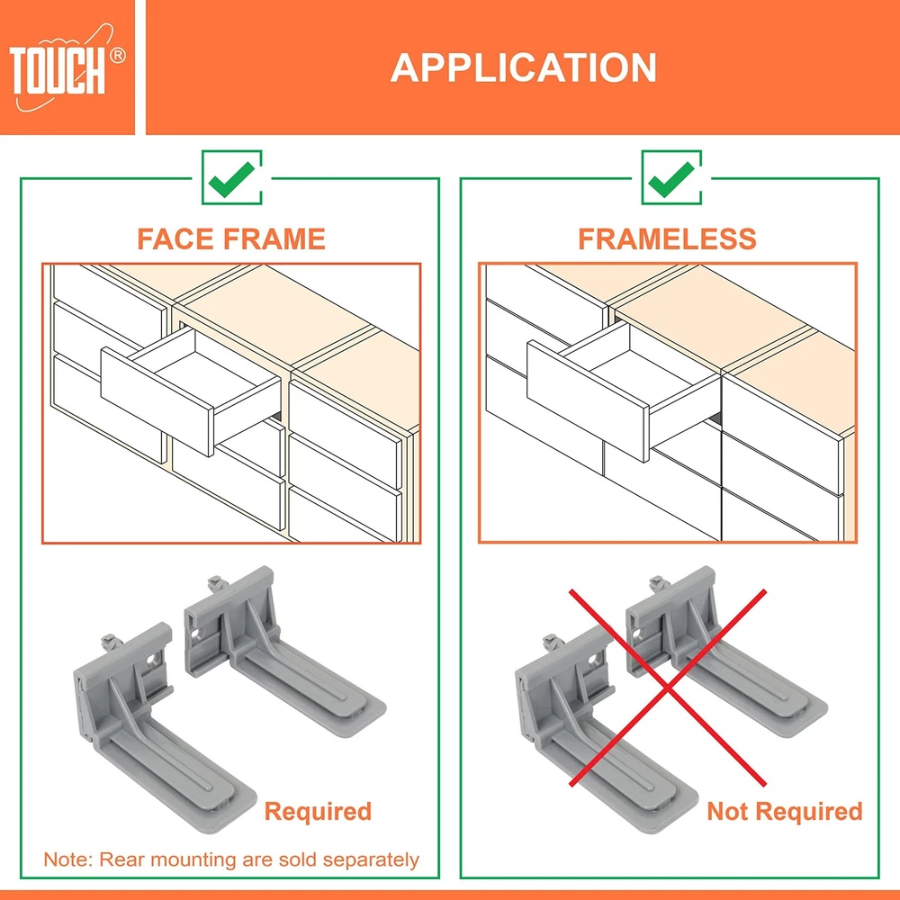 TOUCH Rear Mounting (5 Pairs, 10 Pcs) for Undermount Soft-Close Drawer Slides Socket, Drawer Track Back Mount Brackets for Face Frame Cabinets Drawer Gildes Product Details Size: Rear Mount Unit Count: 5.0 Brand: Touch MPN: TCH-23104 19.R.P UPC: 810089434715 EAN: 0810089434715 Color: Gray Material: Plastic Brand: Touch Finish Type: Galvanized Mounting Type: Under Mount Weight Limit: 75 Pounds Drawer Type: Under Mount Manufacturer: TOUCH Cabinets Hardware UPC: 810089434715 Number of Items: 5 Part Number: TCH-23104 19.R.P Item Weight: 8.8 ounces Product Dimensions: 3.5 x 2 x 1.5 inches Item model number: TCH-23104 Size: Rear Mount Finish: Galvanized Maximum Weight Capacity: 75 Pounds Included Components: Mounting Screws Batteries Included?: No Batteries Required?: No Date First Available: December 19, 2021 Support drawer glides: These rear drawers track back plates are used to support under mounted drawer glides. Constructed of a thick, durable plastic. These rear drawer track brackets are designed to serve you for a long time. Maximum load rating: The maximum load rating is 75 lbs. per pair. Applications: If you have a face frames cabinets, then you need a face frame kit to support the rail, our rear mounting brackets are applied to support undermounted drawer glides, and drawer track systems. Note: Please double check all measurements on your drawer slides before purchase. Mounting hardware included: Rear mounted include mounting screws and instruction manual for easy installation. You can contact us at any time if you have any questions or suggestions, we will be more than happy to answer your questions. Wish you have a happy shopping.