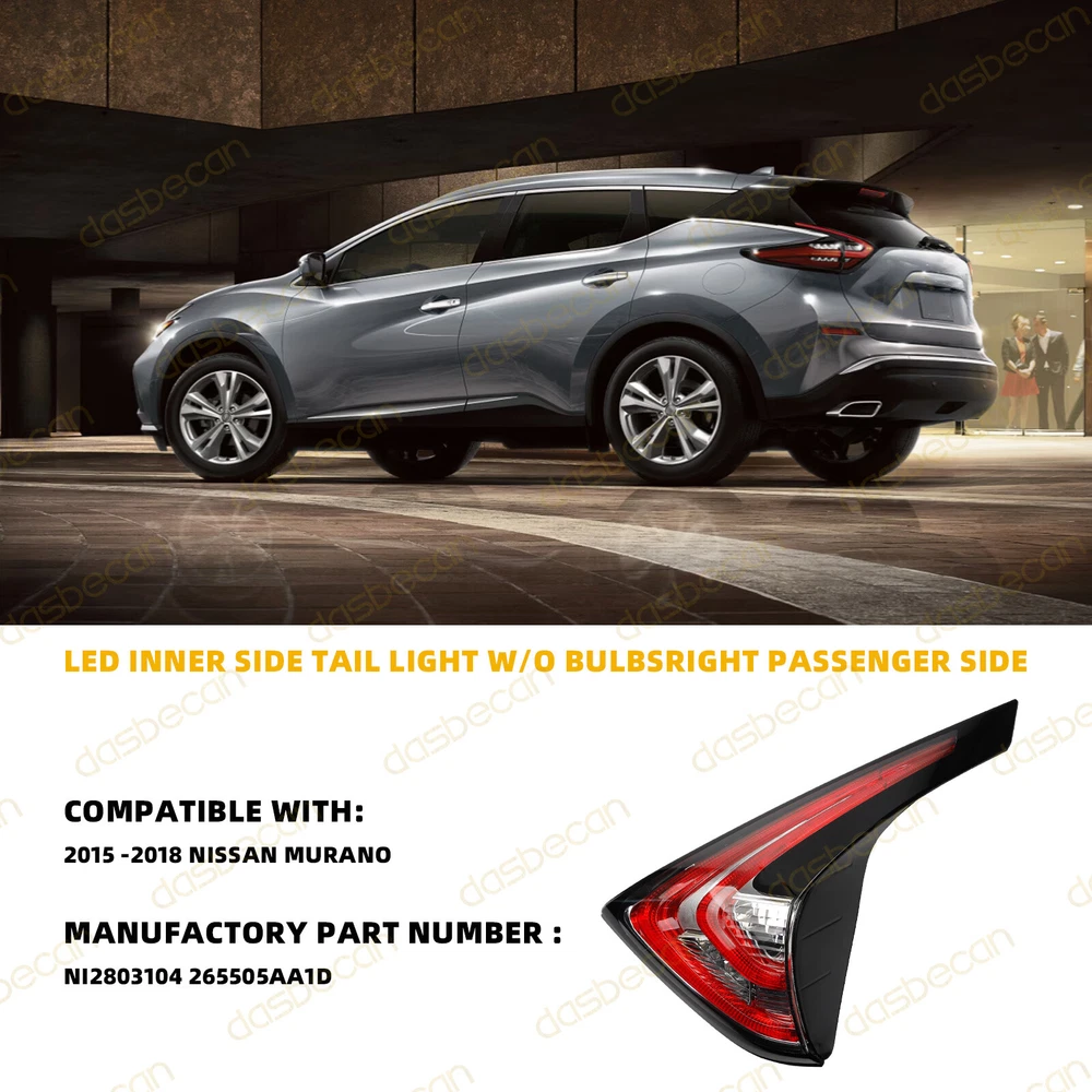 Features & details 【 Compatible with 】2015-2018 Nissan Murano Platinum, S, SL, SV| 4 Cyl 2.5L, 6 Cyl 3.5L 【 OE Replace Number 】NI2803104, 265505AA1D, 26550-5AA1D Please confirm the product if it matches your car before you purchase. 【Description】 T ype: Tail Light Assembly Condition: 100% Brand New Placement On Vehicle: Rear Inner Right , Passenger Side Housing Material: Plastic Lens Material: Plastic Lighting Technology: LED Housing Color: Black Items Included: Without bulb(s) Running Light: Yes ( Bulb Not Included ) Reverse Light: Yes ( Bulb Not Included ) 【Features】 Easy Installation. Plug-n-play installation.OE-comparable harness ( no pigtail" connector ) for hassle-free installation."OE-comparable mounting provisions ensure drop-in precise fitment. Durable. Tail Light is made of high quality materials which is excellent durability, not easy to deformation and fracture. Our lens offer superior UV protection, does not fade under long-term sunlight, can be kept brand new even after long time use. Reliable. Premium components prevent fading, provide optimum illumination and long lasting reliability. No scraping hand, no miscellaneous edges, every corner is handLED delicately and smoothly. Superior durable Tail Light replacement component, reduce environmental damage, including freezing, fog, fading, corrosion, minor effects, and precipitation, helping your car look better and drive safer. 【 Package Includes 】 1 X Tail Light Assembly Without bulb(s) ( Rear Inner Right , Passenger Side ) This item doesn't come with manual installation. We strongly recommend professional installation. 【Service & Warranty】 Purchase from DASBECAN, enjoy 1 year no worries-warranty, whenever you met issue when installing or using, please contact us via eBay Message, and we will reply within 24 hours and help solve the problem. Customer Question & Answers Q1: Will This Part Fit My Vehicle? We list all the compatiblity, if your vehicle does not show up on the compatibility table at the top of our listings, welcome you to contact us for free consulation before purchasing a product. Q2: Does they come with warranty? All of our product comes with 1-year warranty, but some times you need to pay the shipping fee. Q3: How to use it? If you don't know how to install this accessory, welcome to contact us, we will provide you with a video guide. Payment Shipping Warranty & Service Returns/Exchanges Contact us Payment Most of the payment methods are available, such as Paypal, Payoneer, Credit Card. Within 1 day of receiving your payment, we will start processing your order. Shipping All Items Will Be Ship Within 1working Days, and We Will Ship out All Orders As Soon As Possible After Payment Verified, Please Allow up to 1-6 Business Days for Delivery. Why Choose the Us Stock? 1. Us Local Shipping, No Extra Customs Cost. 2. Fast Delivery: 1-6 Working Days Delivery. Warranty & Service All the product in our store come with a 1-year-warranty. If there is a problem with the product you purchased within 1 year, please contact us, we will provide you with after-sale protection. Our job is not complete until each customer is satisfied! Receiving positive feedback is extremely important to us. We give all our buyers positive feedback as soon as payment is received Negative feedback and bad ratings do not solve the problem! If you contact us via eBay, we will be more than happy to work with you! Returns/Exchanges If you received an incorrect, damaged, defective, or item not as described , contact us for a partial/full refund or replacement on our costs. If we shipped you the wrong part, we pay for the return shipment and send you the correct part. If you ordered the wrong part, contact us for a return address and simply return it,give us a tracking number. We will send you the new item as soon as the returned package is received; If you simply don't want the part, ship it back and give us a tracking number. After we receive the item, we will refund the item price minus shipping costs. All returns must be done within 30 days after receiving the package. Parts must be new and unused in the original condition: including box, packaging and all other accessories,or we will charge you a partial costs. Contact us If you encounter any problems during purchase or use, please contact us via eBay message directly. On Feb 8, 2025 at 01:13:18 PST, seller added the following information: