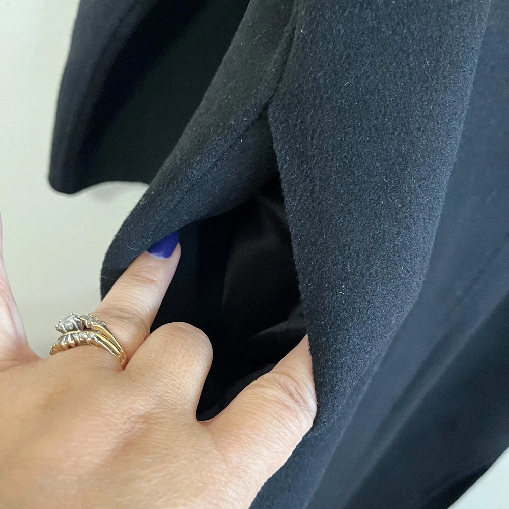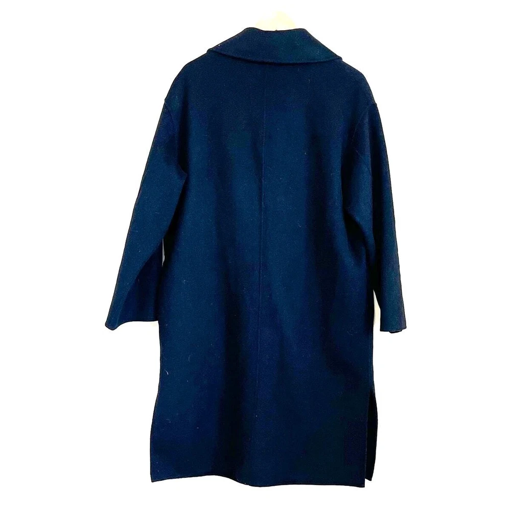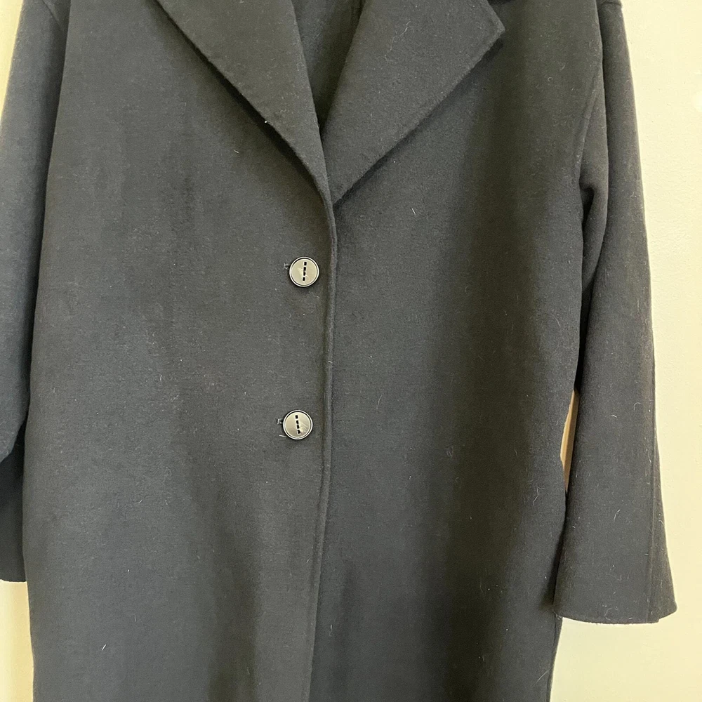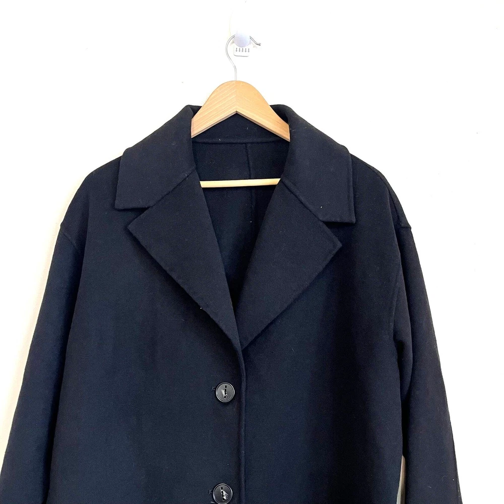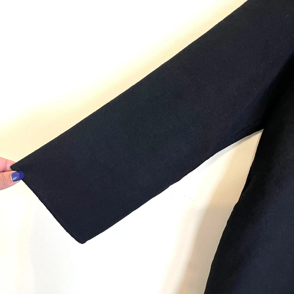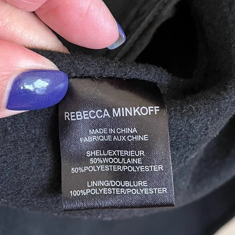 Black Wool Soft Cozy Collared Button Front Midi Length Minimalist Timeless Elegant Rebecca Minkoff Single Breasted Coat Button front closure Pockets Notch collar 50% wool 50% polyester Dry clean Sz No Size Tag (est XL) armpit 24 sleeve 21 length 42 Beautiful condition