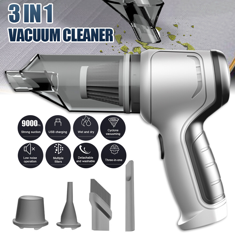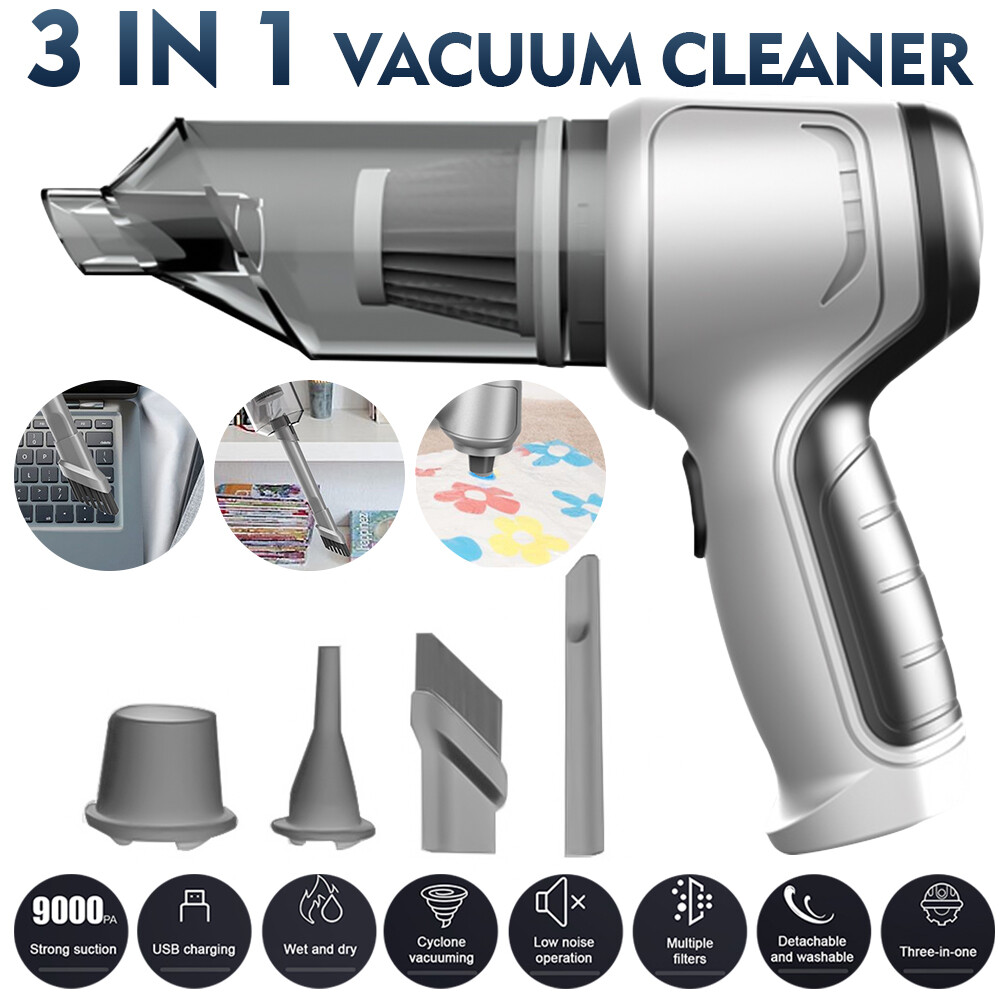 A:9000Pa Vacuum Cleaner Feat ure : HIGH POWER SUCTION : Our portable small vacuum cordless rechargeable is equipped with a digital high-speed motor, its battery capacity is 4000mAh which only takes 3-4 hours to charge once and can be used for half an hour. The strong motor can provide up to 9000pa powerful suction, which can easily clean dust, pet hair, sand, food residue, little liquids, debris hidden in cushions or sofa. It's a perfect gift for families or friends! MULTI-PURPOSE CORDLESS VACUUM : The small vacuum cordless rechargeable has an Ergonomic handle, light-weight and cordless and one-touch starting design, built-in high-efficiency motor, this is a multifunctional wireless vacuum specially designed for cleaning the car, home, and office. It is not only a small vacuum cleaner hand-held but also a practical air pump and blower. Able to inflate swim rings, and deflate storage bags. Help to make a fire with air-blow function on outdoor camping. HIGH-QUALITY DETAILS DESIGN: The cordless vacuum use a washable and reuse HEPA filter. And equipped with a dust collection cup, which adopts a double buckle design to effectively prevent the dust cup from falling off during use, rotate disassembly after use, quick dumping of garbage, convenient for cleaning and next use. CONVENIENT CORDLESS FEATURE: The small vacuum cordless rechargeable, lightweight and portable, without the trouble of clumsy and tangled wires, which can help you easily clean all places. The portable vacuum has a premium HEPA filter, good air permeability, washable and reusable. You can easily remove the HEPA filter and clean it. Note: Remember to dry it before putting it back in the vacuum. Specifications: Material: ABS Rated voltage: DC 7.4V Vacuum degree: about 9000Pa for wireless charging models Rated speed: 36000rpm/min Lithium battery battery capacity: 2*2000mAh Charging method: 5V USB boost charging cable Rated power: 120W Product noise: ≤84dB Operating temperature: -20℃~+50℃ USB cable length: about 1m Packa ge Included: 1x Handheld Vacuum Cleaner 1x Washable Filter 1x Slit Nozzle 1x Multifunctional Brush 1 x Pumping Port 1 x Blowing Nozzle 1x USB Charging Cable Note: 1. The filter must be installed when using 2. Do not expose to direct sunlight, and do not use in places with high temperature and high pressure 3. Do not wipe the body with gasoline or strong volatile detergent 4. The front shell cannot be removed when the motor is rotating 5. This product is a vehicle tool, and it is forbidden for children to use it alone to avoid danger 6. When absorbing moisture, pay attention to the water height of the front cover 7. When removing foreign matter in the gap, please put on the duckbill straw 8. Under normal conditions, it can usually be used for half an hour and has no effect on the car battery. 9. After using this product, please turn off the switch, *when removing the objects from the net bag, press the fastening button, and then pour out the foreign objects. B:6000Pa Vacuum Cleaner Feat ure : 1. Material: Using high-quality ABS material + electronic components, upgraded temperature control technology, no heat after long-term use, effective and fast suction of stubborn dust 2. Design: Lightweight design, change the gravity design, as light as 213g, you will not get tired when holding it for a long time, making cleaning a kind of enjoyment 3. Reuse: Nano dust-locking filter is used, which can be washed repeatedly, breathable and dust-proof, and more environmentally friendly after repeated use 4. Bass operation: Acoustic noise reduction design, sound <68 decibels, comfortable operation without disturbing, cleaning without worrying about affecting family rest 5. Charging method: smart USB charging interface, compatible with a variety of charging methods, notebooks, charging treasures, computers, etc., charging and using 6. Long-lasting battery life: built-in large-capacity lithium battery, 2000 mAh battery, can be used continuously for more than 30 minutes, easy to deal with daily cleaning 7. Applicable to: gaps in the car, sofa carpets, desks, computer keyboards, bookshelves, hair on the bed, drawers, pianos, etc. can be used in various scenes that cannot be cleaned Specific ation : Name: Wireless Vacuum Cleaner USB Rechargeable Handheld Mini Car Vacuum Cleaner Colour: Black Rated voltage: 7.4V Rated power: 120W Rated speed: 2000 (r/min) Vacuum suction: about 6000 Pa Dust cup capacity: 0.1L Charging method: Type-C charging Battery: built-in rechargeable lithium battery Battery capacity: 2000mAh Charging time: 3.5h Battery life: about 15minutes Product size: 18.5*5.5cm Product net weight: 213g Packa ge list: 1*vacuum cleaner 1*suction nozzle 1*hair brush 1*blowing hole 1×filter 1*charging cable 1*manual Instr uctions for use: 1. Check whether the charging is sufficient, and the filter must be installed when using it 2. Just turn on the switch, the front cover cannot be removed when the motor is rotating 3. Replace different suction nozzles according to different usage occasions 4. If the vacuum cleaner is dirty or the suction is not strong, please clean the filter in time to ensure the normal operation of the vacuum cleaner 5. Do not expose to direct sunlight, and do not use in places with high temperature and high pressure