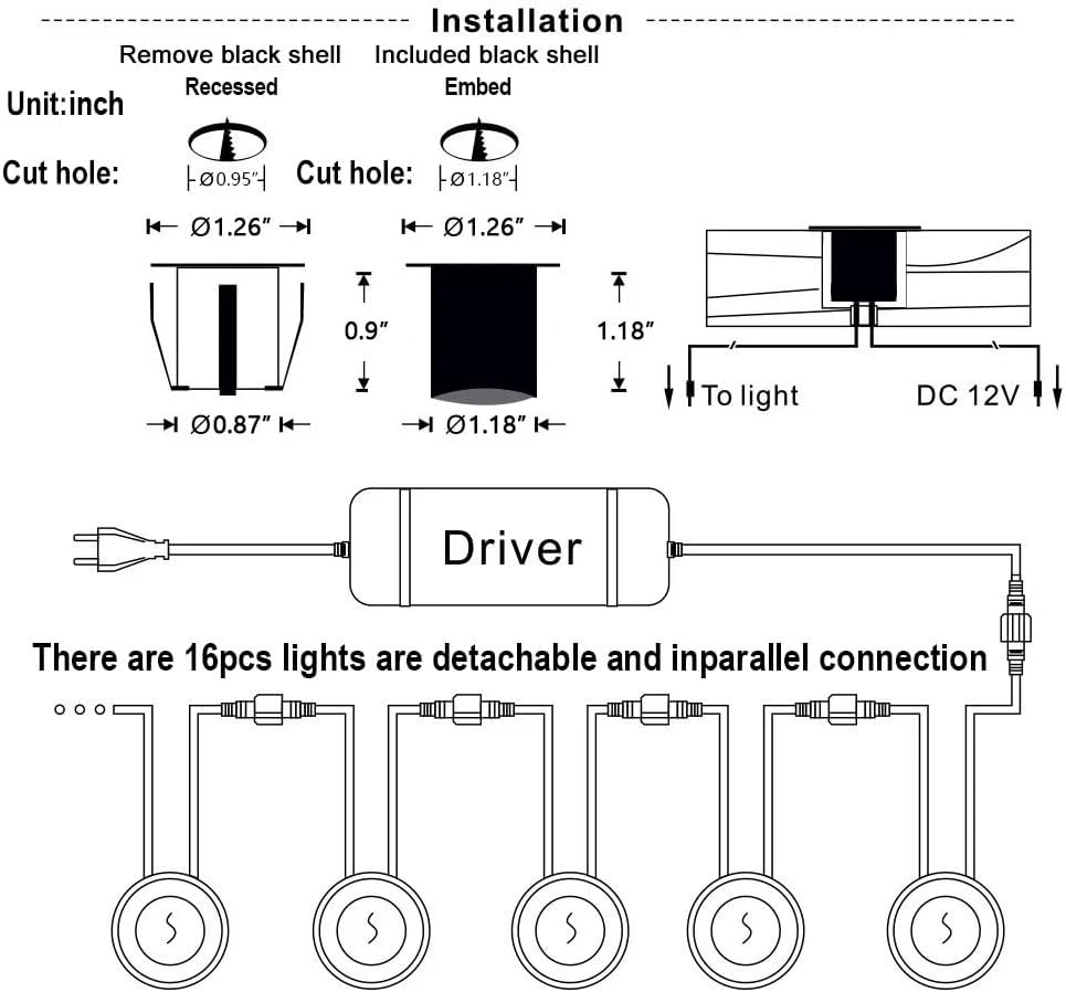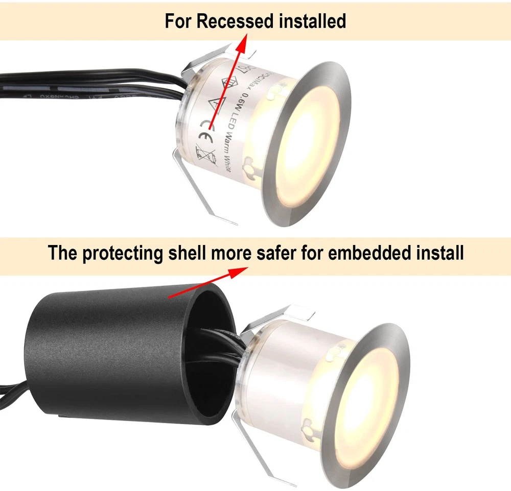 【High Bright &More Safe】Bright warm white LED deck lighting bring impressive starry effect, making you feel sweet and comfortable in your house. Add the black protecting shell for embedded installed on floor/stone stairs will be safer for led deck lights kit. 【Energy Saving with Long Lifespan】Super quality LED chips(0.6W/pcs), DC12V low voltage output, no flicker; Durable and stable copper 2 pin connector(DC 12V transformer Included,Support Max 16 pcs in series, if need extension cable for the deck lights can search ASIN:B07TYZJYZK) 【IP67 Waterproof&Dimmable】Made in high quality Acrylic/ABS and 304 stainless steel lights body and power supply are all glue-filled, completely insulated and water-proof IP67.(Compatible with a dimmer can search ASIN: B0DBDL1NBH) 【Detachable】The 16pcs led dot lights are detachable and in parallel connection, you can only install part of them based on your need. (The led deck light kits still work fine if one or two of the deck lights fails.) ( if you need an extra larger transformer that has a photocell sensor with a timer function to used for more quantity deck lights can search ASIN: B0BVR717PS ) or ASIN: B0CYBSB3JL 【Easy to Install &Warranty】Drill holes, push led deck lights in, connect cables.So it can be installed any where you can drill a hole, such as deck stair ,deck step,patio,floor, eaves, pool ,walkways, kitchen ,garden outdoor led landscape lighting, indoor&outdoor decoration. 12-month warranty for these deck lights. SMY Low Voltage DC12V Waterproof Outdoor Warm White LED Deck Lights Kit with transformer can create cozy and peaceful ambiance for your family indoor or outdoor. Specifications: 1. IP67 waterproof and insulated(Safe for Outdoor use) 2. Super Economical: Energy-saving 0.6W per pcs, long life span of 50,000 hours. 3.Warm white glow with a wide beam angle at 120 degrees. 4.Mini size: Φ32mm*23mm /Φ1.26inch*0.9inch【Φ32mm*30mm /Φ1.26inch*1.18inch with proect shell】,elegant design, keep tidy after installation. 5.Detachable and easily fitted. Technical data: Color: Warm white(2800-3200K) Output: DC 12V(Max 14.4W) Power: 9.6W/16pcs (0.6W per piece) Waterproof grade: IP67 Connection way: Parallel connection Surface Material: ABS, Acrylic & High Grade 304 Stainless Steel Light Size: Diameter :32mm(1.26");Depth :23mm(0.9") ;Cut out :30mm(1.18") WIithout Black Shell Light Size: Diameter :32mm(1.26");Depth :23mm(0.9") ;Cut out :24mm(0.95") Wire length: Double 0.5M(Max 1M between each light) Power cable length: 3M/118" 1xLight weight: 30g / 1.1oz Package weight: 921g / 32.5oz Application: Suitable for indoor and outdoor decoration, can be installed anywhere you can drill holes, such as kitchen’s plinth, deck stair ,deck step,patio,floor,eaves, pool ,walkways, kitchen , in sauna room, bathroom ,garden outdoor led landscape lighting, etc. Package list: 16 x LED Deck Lights 1 x DC12V Power Supply(Max 14.4W) 1x User Manual Note: 1.The deck light is NOT dimmable.But you can order a LED dimmer for this deck lights 2.Check all connections are linking tightly before connecting the main adapter to power outlet. 3.Disconnect the main adapter from power outlet if the LED deck lights kits are not working properly. 4.The pointing arrowhead must aim at the slot.