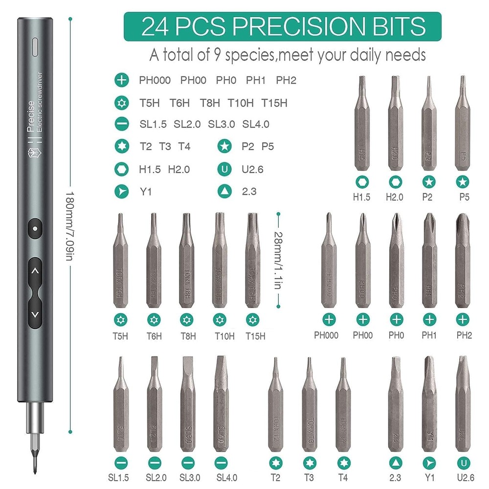 Upgraded Features: ●28 in 1 portable electric screwdriver set; ●Upgraded USB Type-C charging port with charging protection; ●Ultra-thin aluminum alloy shell, pen-shaped design; ●Compared with the previous version, the motor is optimized, the torque is larger, and the running sound is lower. Specifications: Voltage: 3.7V DC Idling speed: 180r/min Output torque: 0.25-0.35N.m Charging time: <50 minutes Pakage Included: 24 x Screwdriver bits 1 x Electric Screwdriver Handle 1 x Type-C USB Charging Line 1 x Packaging Box 1 x Crowbar 1 x Manual 24 Bits as following sizes: ●T2、T3、T4、T5H、T6H、T8H、T10H、T15H; ●PH000、PH00、PH0、PH1、PH2; ●SL1.5、SL2.0、SL3.0、SL4.0; ●H1.5、H2.0; ●P2、P5; ●triangle 2.3 ●U2.6 ●Y1 Upgraded 28 in 1 Screwdriver Set: This upgraded electric screwdriver set includes 24 precision specialty bits,electric screwdriver handle,plastic prying tool,USB charging line, protable packing box, Which can help you work efficiently and intelligently. 24 Precision Screwdriver Bits: With 24 S2 material conventional bits as the following types: PH000、 PH00、PH0、PH1、PH2; SL1.5、SL2.0、SL3.0、SL4.0; T2、T3、T4、T5H、T6H、T8H、T10H、T15H; H1.5、H2.0; P2、 P5; U2.6; Y1; triangle 2.3, which are designed for smart phones, cameras, remote control drones, laptops, small household appliances and other tools. Automatic Modes: The output torque: 0.25-0.35 N.M, low running sound. With both forward and reverse rotation modes. Can be applied to mobile phones/glasses frames/laptops, but not large appliances. Electric Handle Design: The electric screwdriver kit comes with an electric handle, which can make your work efficiently and quickly, saving you time. Type-C USB Charging & LED Light: It builts-in a rechargeable battery, 300 screws can be punched after charging fully charged; In addition,there are 3 LED light provides clear view when working.