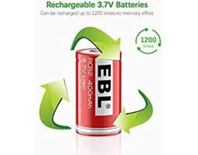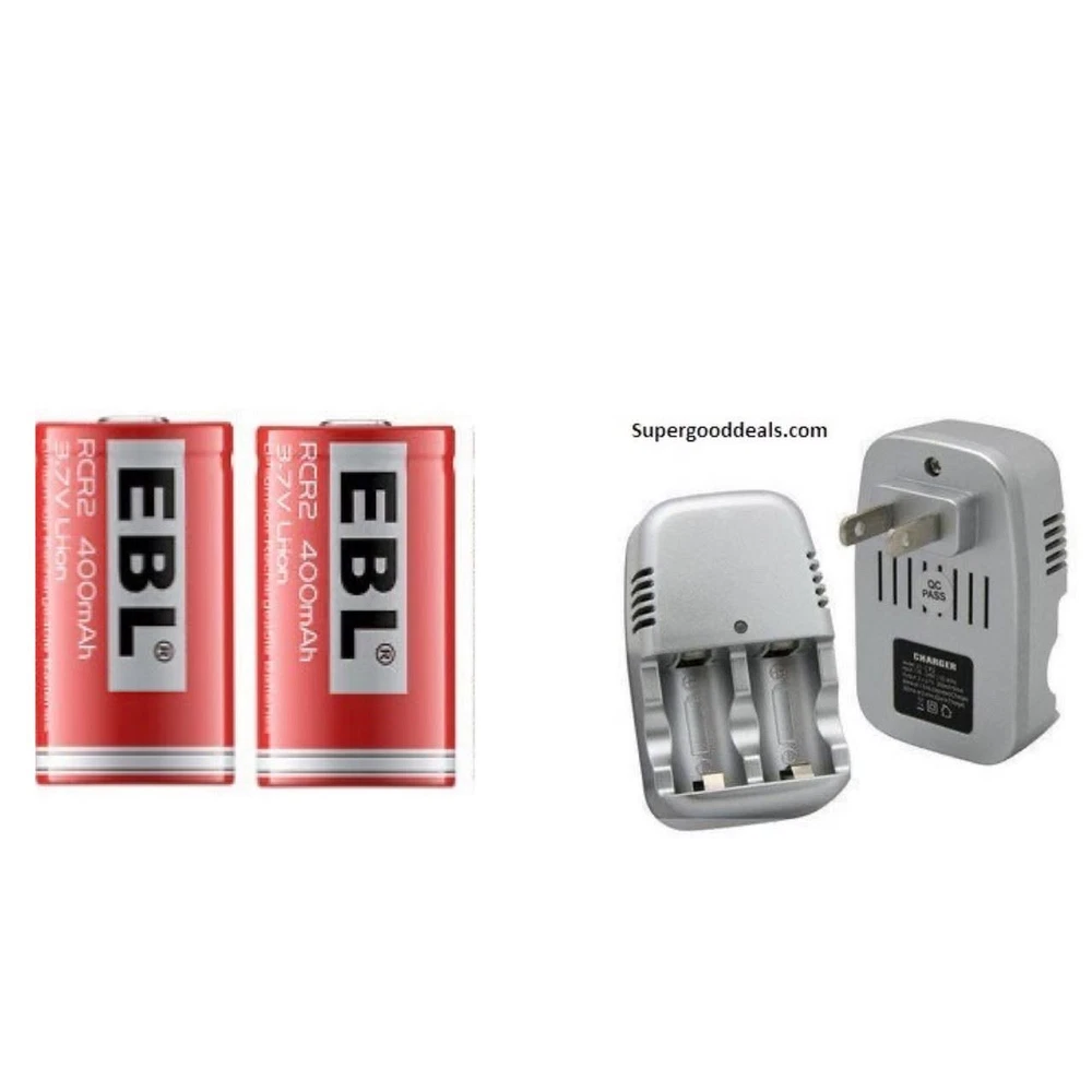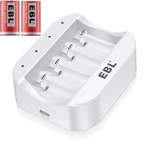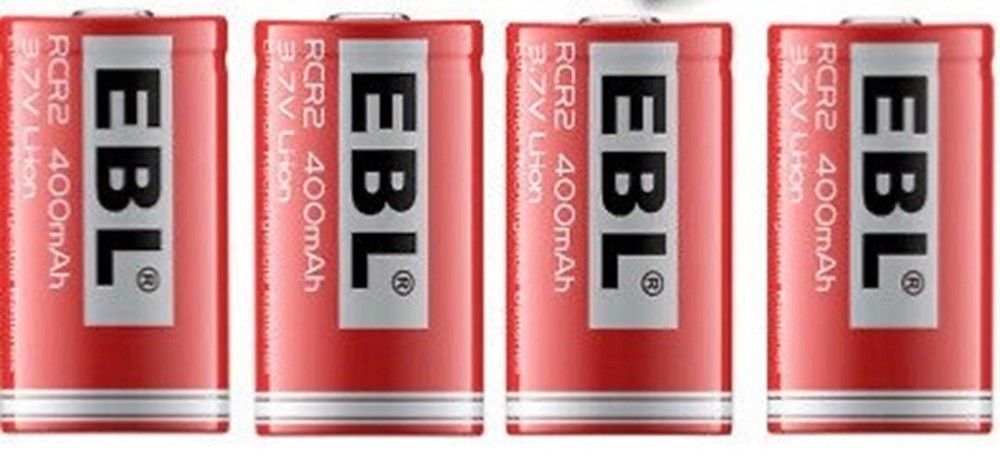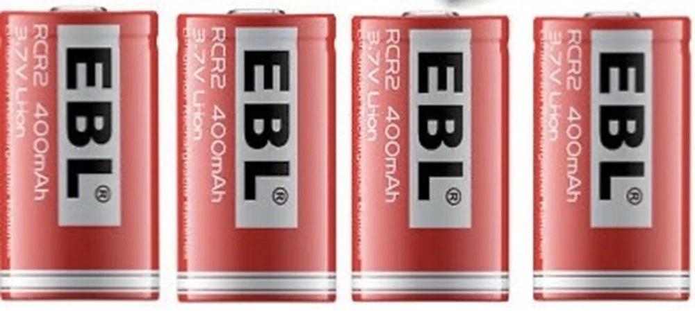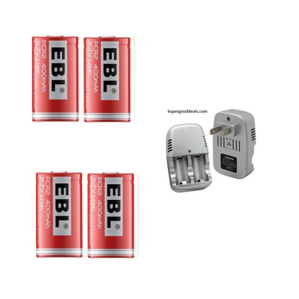 Rechargeable 3.7v EBL CR2 400mAh Batteries + CR2 4-Port Chargers/Pick Combo! 12z Rechargeable 3.7v EBL CR2 400mAh Batteries + CR2 4-Port Chargers/Pick Combo! 12z Made for use in the USA. NOTE: you can choose the number of batteries you need and add in a charger if needed. Just see the choices listed. Details on CR2 4-Port Battery Charger: Charge one, two, three or four CR2-3V lithium batteries every time. Specially designed for CR2-3V lithium batteries. Easy to plug and convenient to use. Input voltage: 5v, comes with FREE charging cable, plug into any power source with a usb cable connection.